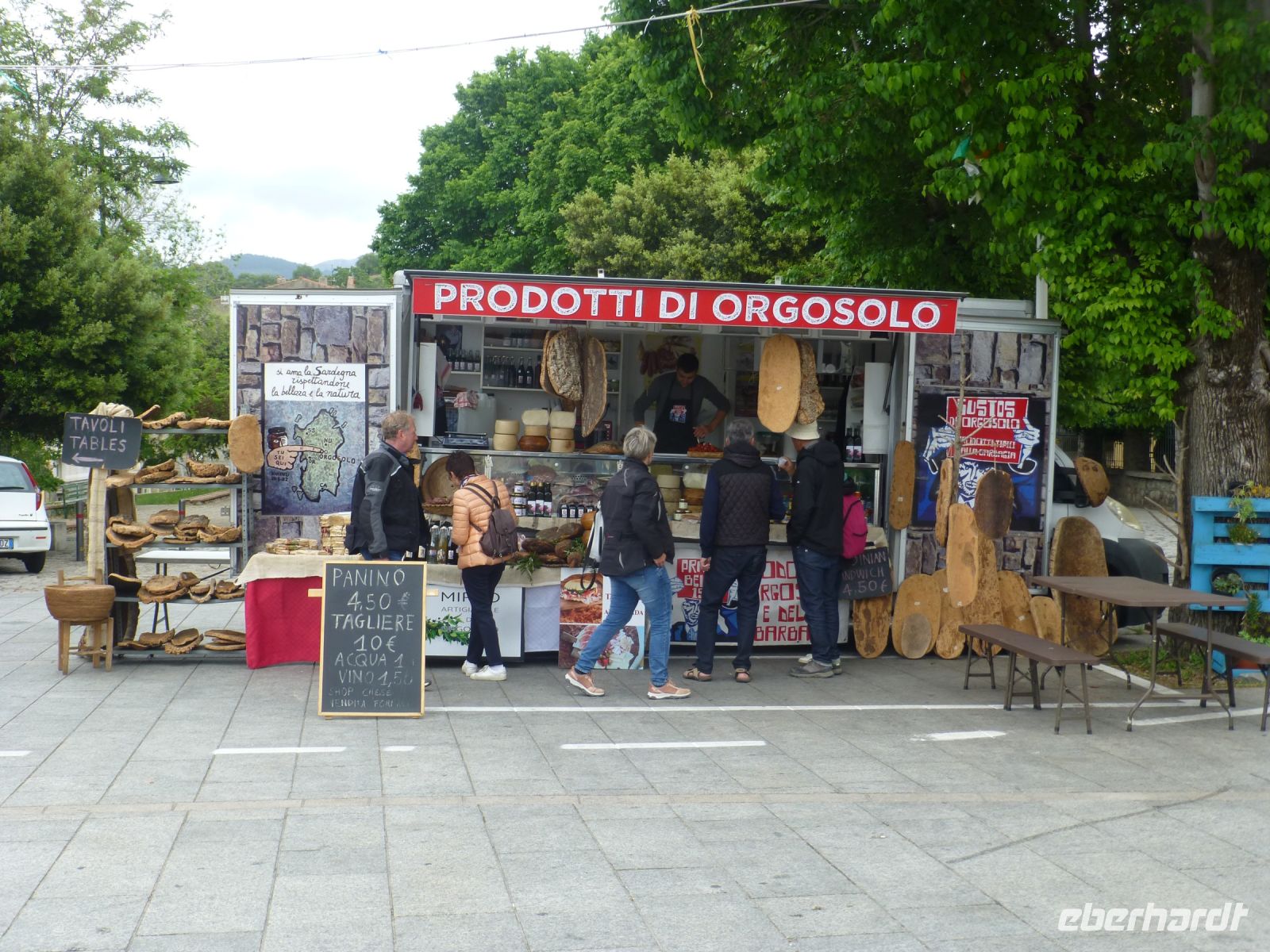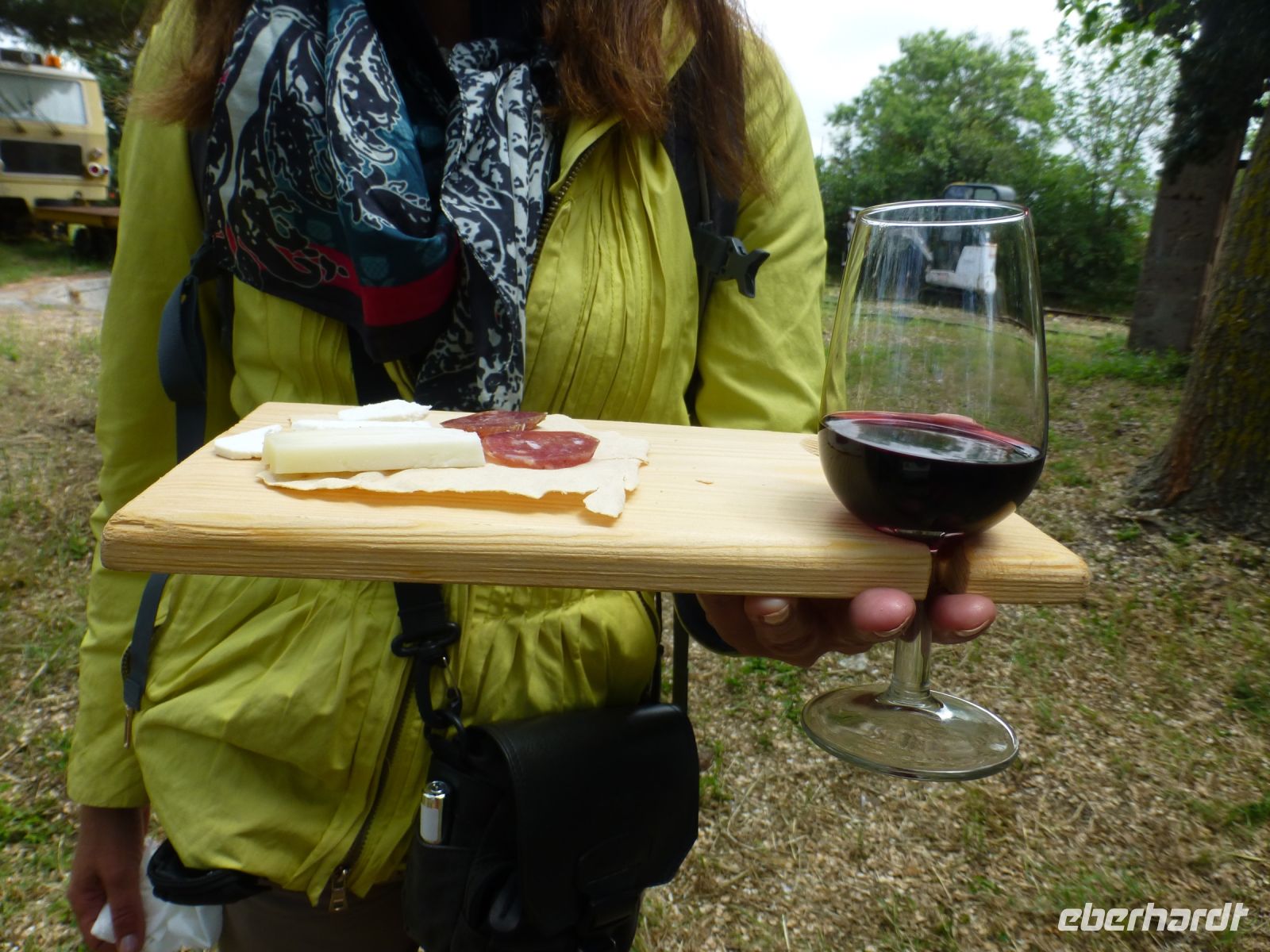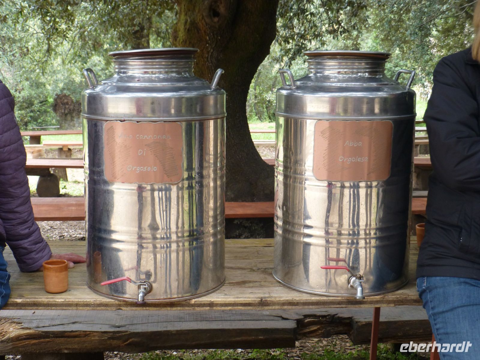 Nach dem strammen Programm ist eine Mittagpause nötig. Diese machen wir oberhalb des Ortes auf Bänken unter Bäumen. Man kann es als Event bezeichnen: Wir bekommen ein Brett und einen Tonbecher und erhalten hintereinander: geräucherten Ricotta, Salami, Lammfleisch mit Kartoffeln, Spanferkel, Schafskäse und immer wieder Rotwein und Wasser. Der Verdauungsschnaps darf danach nicht fehlen. Nach dem Essen stimmt das Personal einen A-Cappella-Gesang an, der seine Tradition bei den Hirten findet.