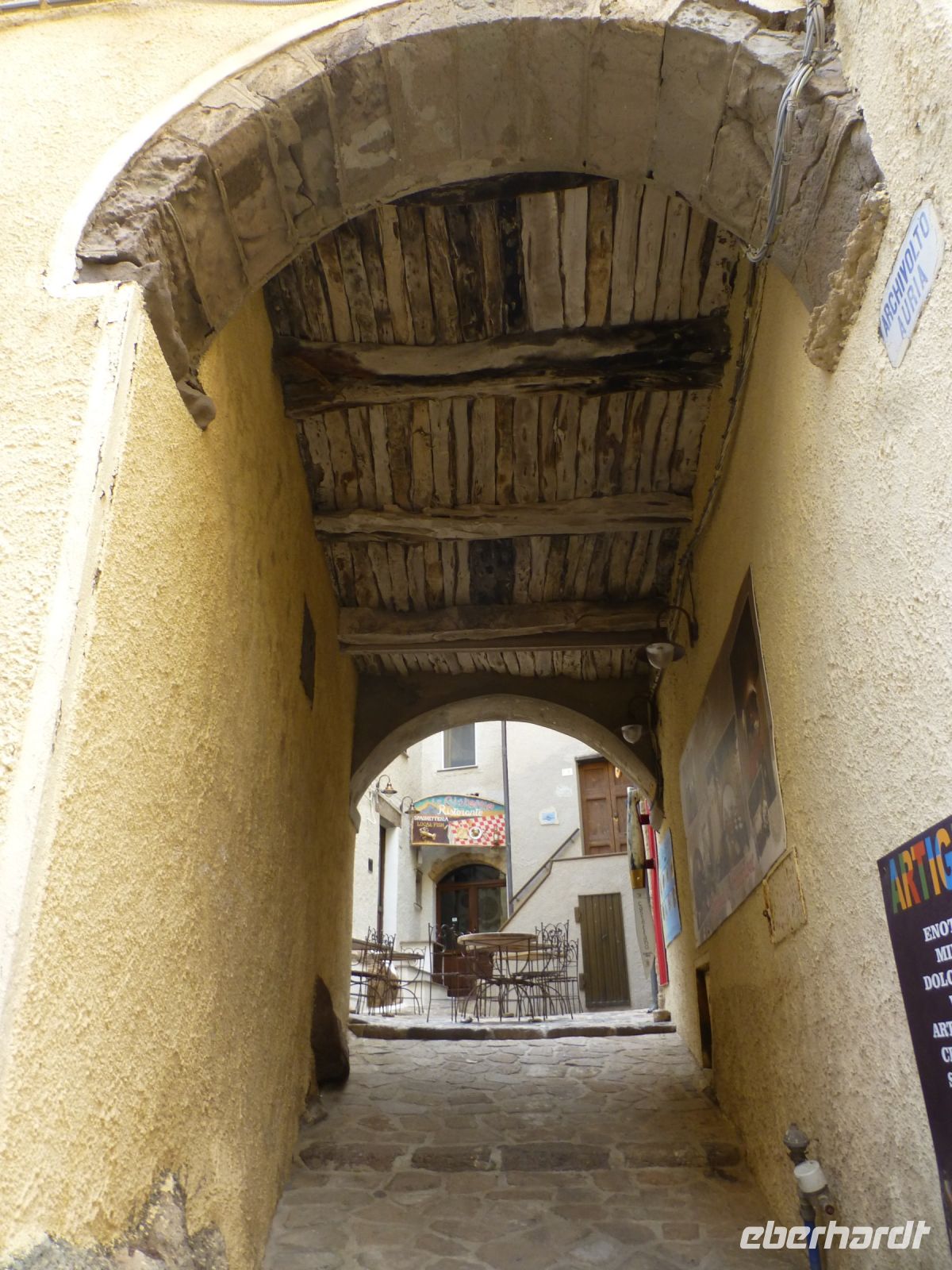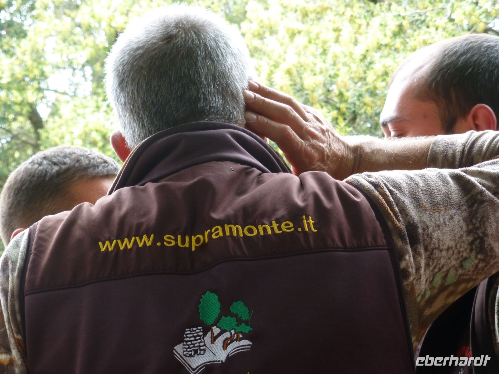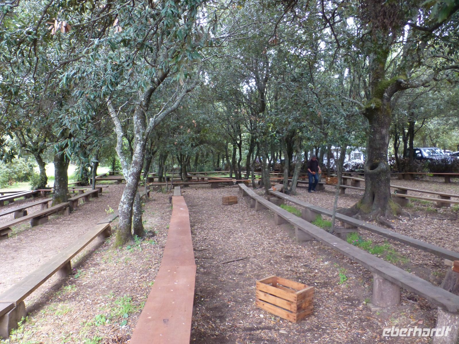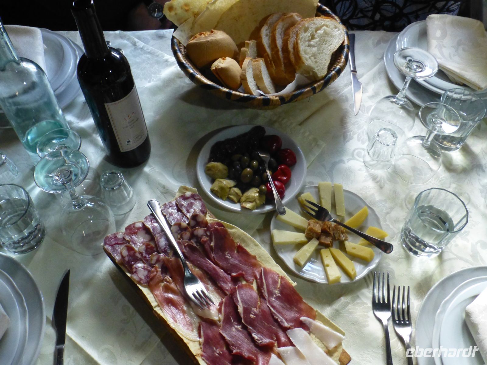 Nach dem strammen Programm ist eine Mittagpause nötig. Diese machen wir oberhalb des Ortes auf Bänken unter Bäumen. Man kann es als Event bezeichnen: Wir bekommen ein Brett und einen Tonbecher und erhalten hintereinander: geräucherten Ricotta, Salami, Lammfleisch mit Kartoffeln, Spanferkel, Schafskäse und immer wieder Rotwein und Wasser. Der Verdauungsschnaps darf danach nicht fehlen. Nach dem Essen stimmt das Personal einen A-Cappella-Gesang an, der seine Tradition bei den Hirten findet.