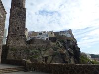 Das genuesische Kastell sieht man von Weitem, ein imposanter Anblick. Dort angekommen heißt es aussteigen und umsteigen, denn gerade gegenüber steht der Bus, der uns zur Zitadelle bringt. Die Altstadt, von hohen Burgmauern umschlossen, ist malerisch – Durchgänge, Treppen hinauf und hinunter, dazwischen Blicke aufs Meer. Ein Rathaus, zwei Kirchen (!) auf kleinem Raum und dazwischen einladende Lokale. Die Größe der Festung und ihr Mauerwerk sind beeindruckend.