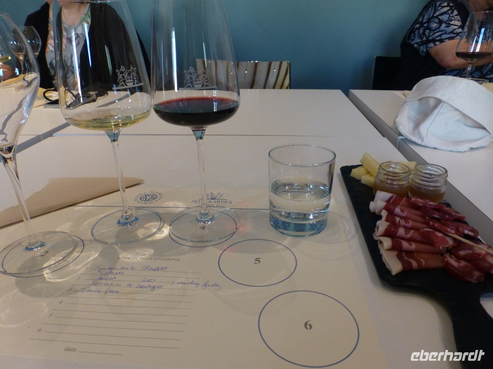 Dieser Einladung folgen wir gerne, haben wir uns doch in den vergangenen Tagen davon überzeugen können, wie gut der sardische Wein schmeckt. Die gepflegte Anlage und die Weinkeller sind beeindruckend. Dann werden wir zur Verkostung gebeten. Drei Weine (Spumante, Weiß- und Rotwein), dazu für jeden eine üppige Platte mit Schinken, Salami, Ziegenkäse und zwei Dips (Zwiebel, Myrte). Der eine und andere kauft eine Flasche als Urlaubssouvenir. Gut getränkt und gefüttert fahren wir ins Hotel, Beine hochlegen. Denn der Tag ist noch nicht zu Ende und der Abend wird fordernd.