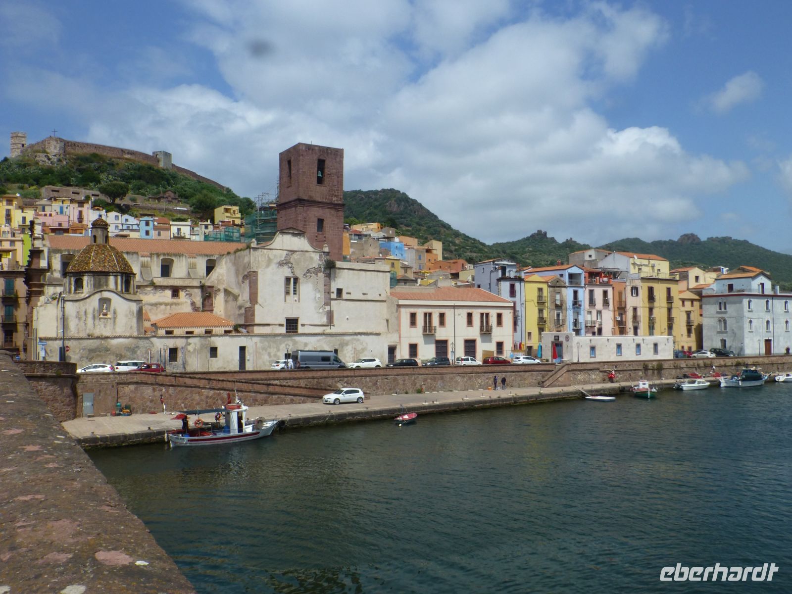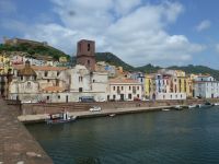 Endstation! Am Bahnhof von Tresnuraghe erwartet uns ein sehr nettes Picknick mit Wein, Salami und Käse. Das ist eine schöne Überraschung. Dann steigen wir wieder in den Bus und fahren die Küste entlang nach Bosa, das als eines der hübschesten Kleinstädte der Insel gilt. Hier fließt der einzig schiffbare Fluss von Sardinien, der Temo. Wir halten an einem langen Gebäudekomplex, den früheren Gerbereien, die nun teilweise zu Wohnungen umgebaut worden sind. Im 18. Jh. war der Ort Provinzhauptstadt und kam zu Wohlstand durch Gerberei, Schmuckherstellung und Filetstickerei. Das Stadtbild zeugt noch heute davon. Anja führt durch die Stadt. Über viele Treppen geht es hoch zu einem Aussichtspunkt unterhalb der Burg und wieder hinunter. Auf dem Rückweg kommen wir an einem Laden vorbei, in dem uns Anja die Filetstickerei erklärt, die hier wie auch Klöppeln zur Tradition gehört. Wir begegnen Frauen, die auf der Gasse sitzen in der Sonne und diese Handarbeit ausführen.