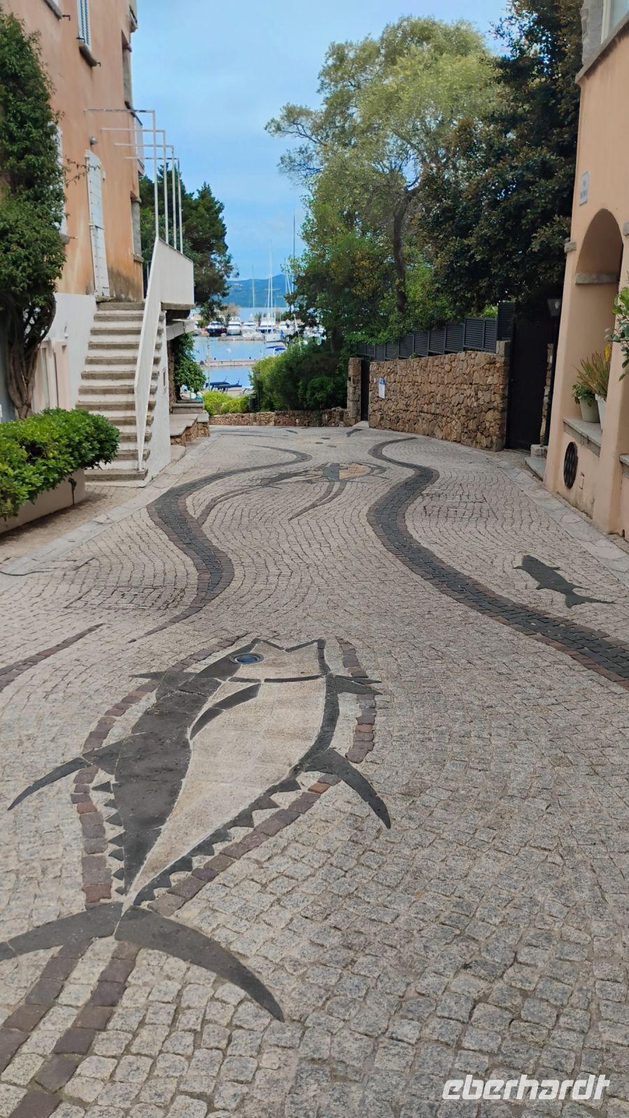 Weiter ging es nach Porto Rotondo, einem Ort mit einem natürlichen, runden Hafen. Wir spazierten durch die gepflegten Straßen, bewunderten in der sogenannten "Straße der Fische" die verschiedenen kunstvollen Fisch-Mosaike mit ihren Augen aus echtem Murano-Glas und betrachteten die Kirche San Lorenzo, die vollständig aus Granit erbaut ist.