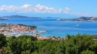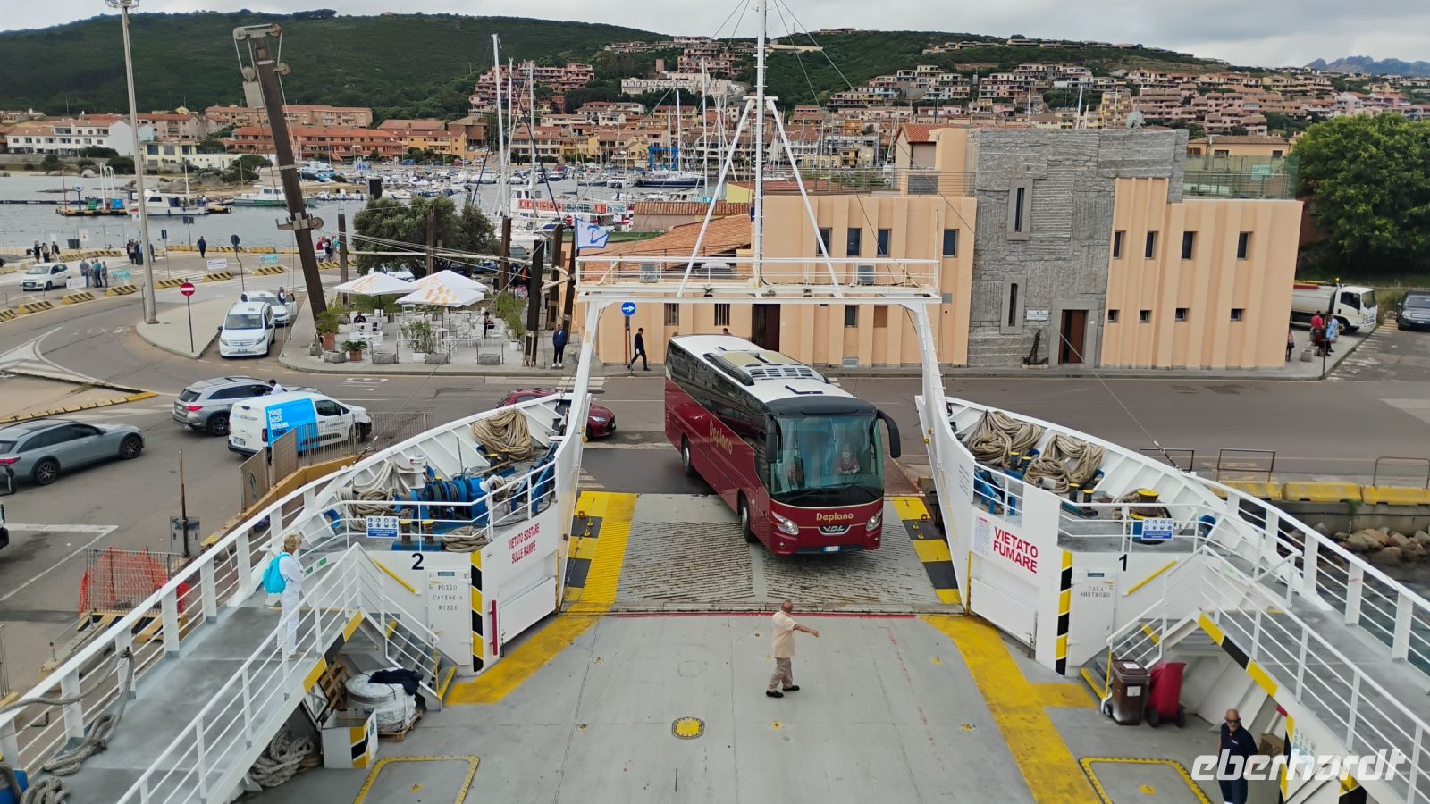 Nach einem leckeren Frühstück im Hotel brachen wir in Richtung Palau auf. Dort bestiegen wir die Fähre, die uns in kurzer Überfahrt zur Insel La Maddalena brachte – dem Hauptort des gleichnamigen Archipels, der zwischen Sardinien und Korsika liegt. La Maddalena ist die größte und zugleich einzige dauerhaft bewohnte Insel. Die Inselgruppe umfasst insgesamt 62 größere und kleinere Inseln, von denen sieben zu den wichtigsten zählen: La Maddalena, Caprera, Santo Stefano, Santa Maria, Spargi, Razzoli und Budelli.