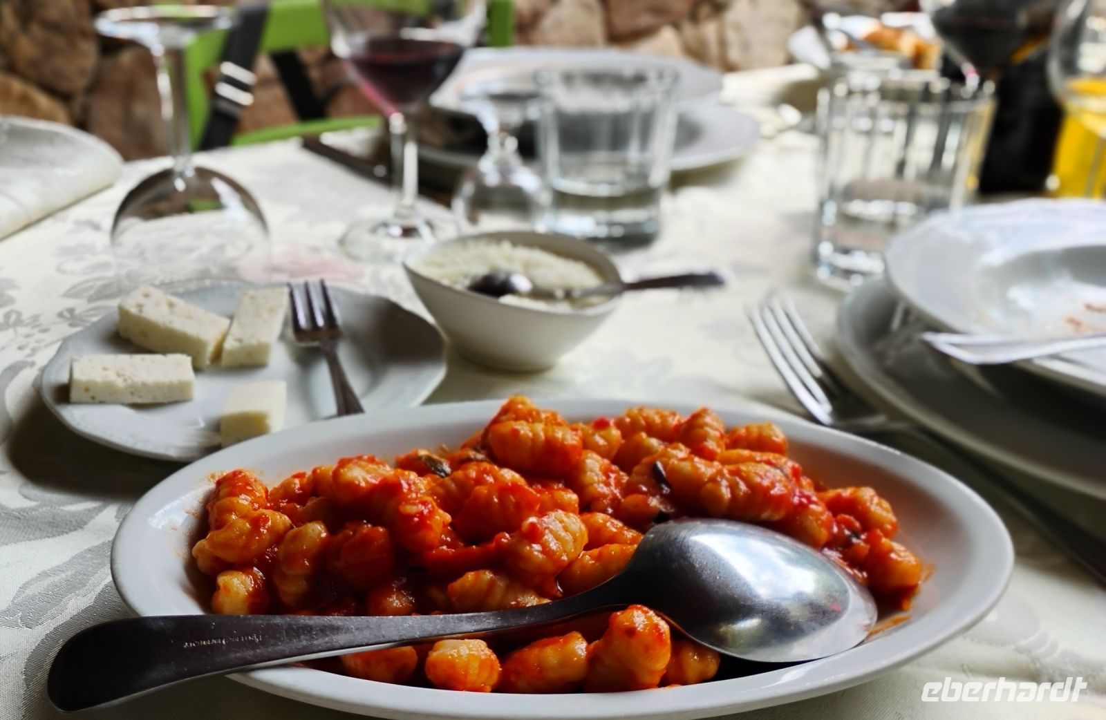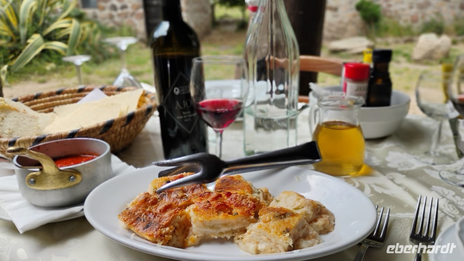 Zum Mittagessen fuhren wir weiter zum Agriturismo „Il Muto di Gallura“ – ein wunderschönes Landgut, wo uns ein traditionelles sardisches Menü unter einer Pergola im Freien serviert wurde. An einer langen Tafel genossen wir Antipasti, Zuppa Gallurese, frische Gnocchi, Wildschwein, Kartoffeln, das typische Pane Carasau, hausgemachten Wein, Dessert, Kaffee und Likör. Eine kulinarische Reise für sich – in herrlicher Atmosphäre.