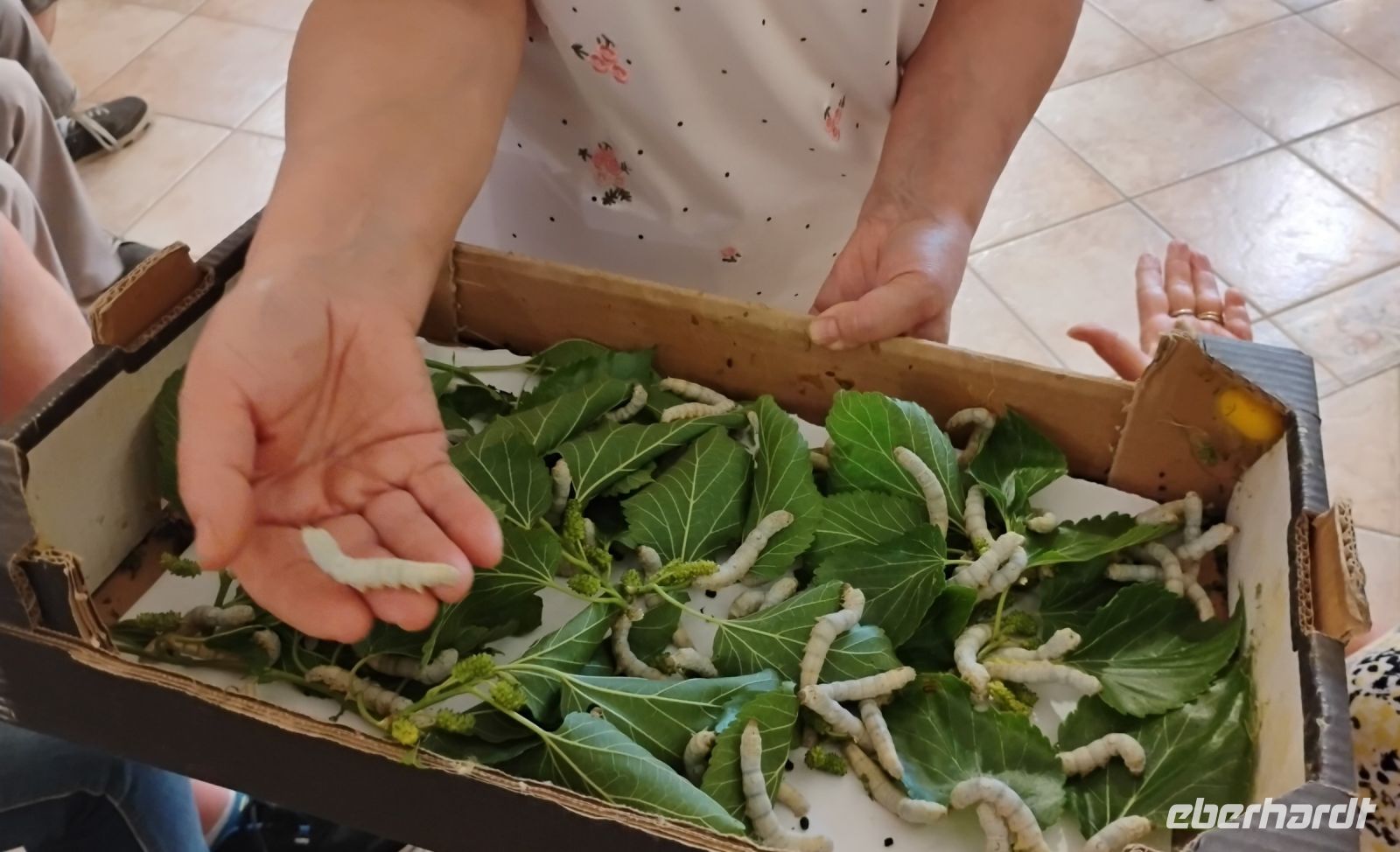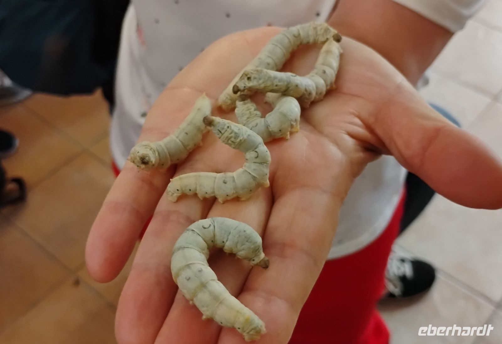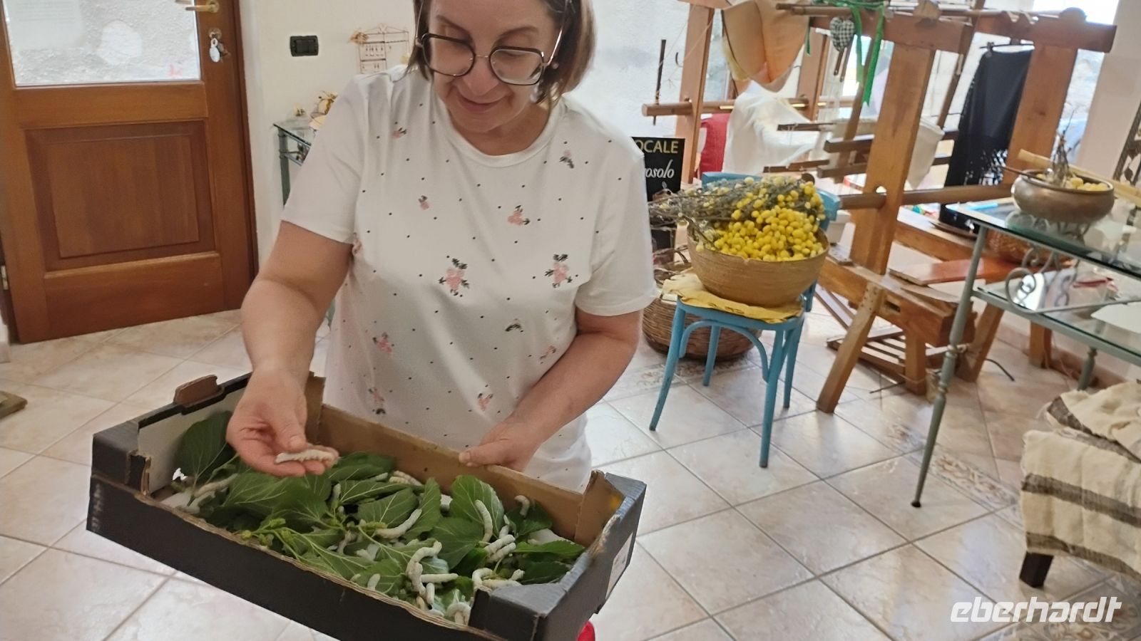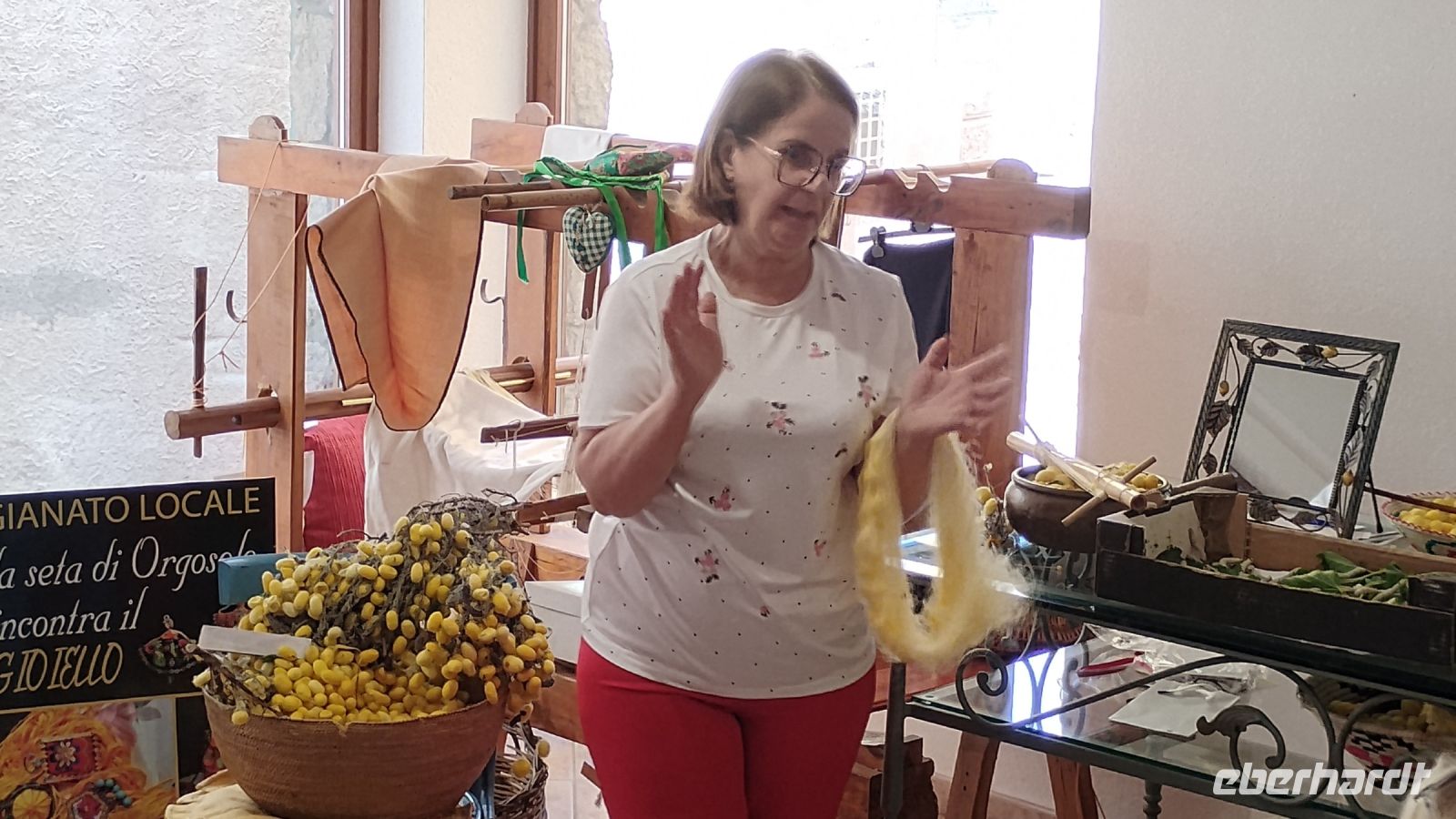 Maria erklärte uns die Seidenherstellung, die mit der Zucht von Seidenraupen beginnt, die sich von Maulbeerblättern ernähren. Nach etwa einem Monat verpuppen sich die Raupen in einem Kokon aus Seidenfäden – ein einziger Kokon kann bis zu 1.500 Meter feiner Faser enthalten. Um die Seide zu gewinnen, werden die Kokons vorsichtig in heißem Wasser eingeweicht, damit sich der Faden ablösen lässt. Anschließend wird er gesponnen, gefärbt und zu feinem Stoff weiterverarbeitet – eine kunstvolle Arbeit, die viel Sorgfalt und Erfahrung erfordert.