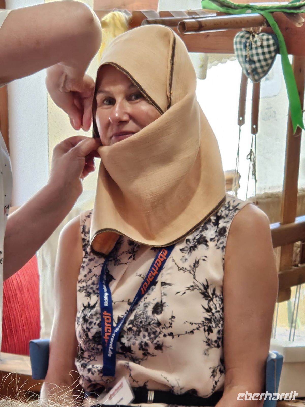 Maria nahm mich als Freiwillige, um den typischen Seidenschal als Kopfschmuck einer sardischen Braut zu demonstrieren. Während sie kunstvoll den Schal um meinen Kopf legte, bekam die Gruppe einen lebendigen Einblick in sardische Hochzeitstraditionen – und ich wurde kurzerhand zur Demonstrationsbraut des Tages. Als Krönung posierte ich dann noch tapfer mit einer sardischen Puppe im Bräutigamsgewand.