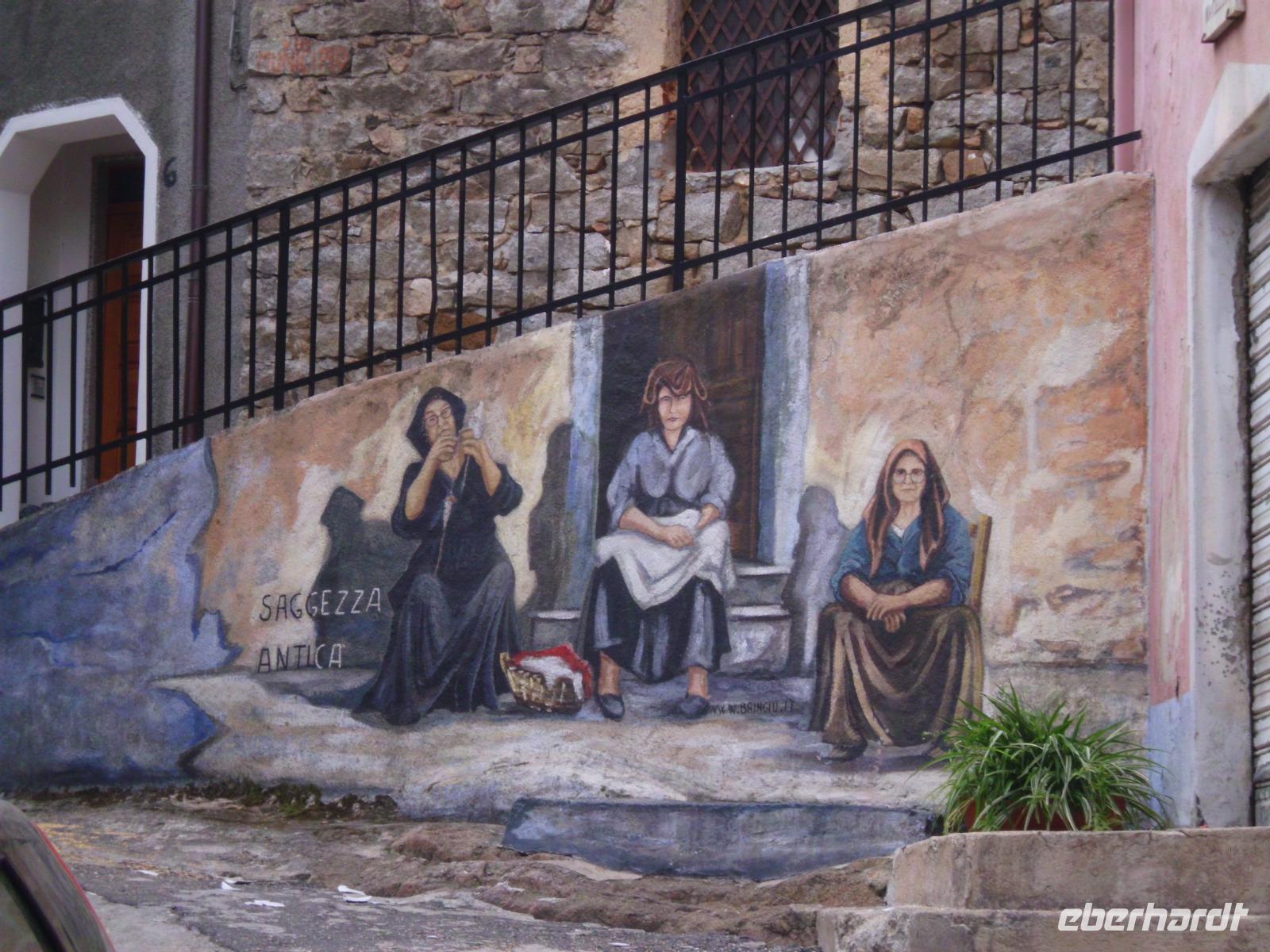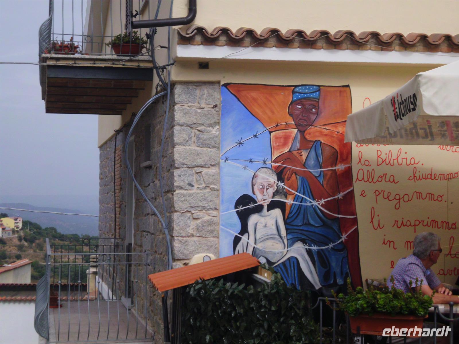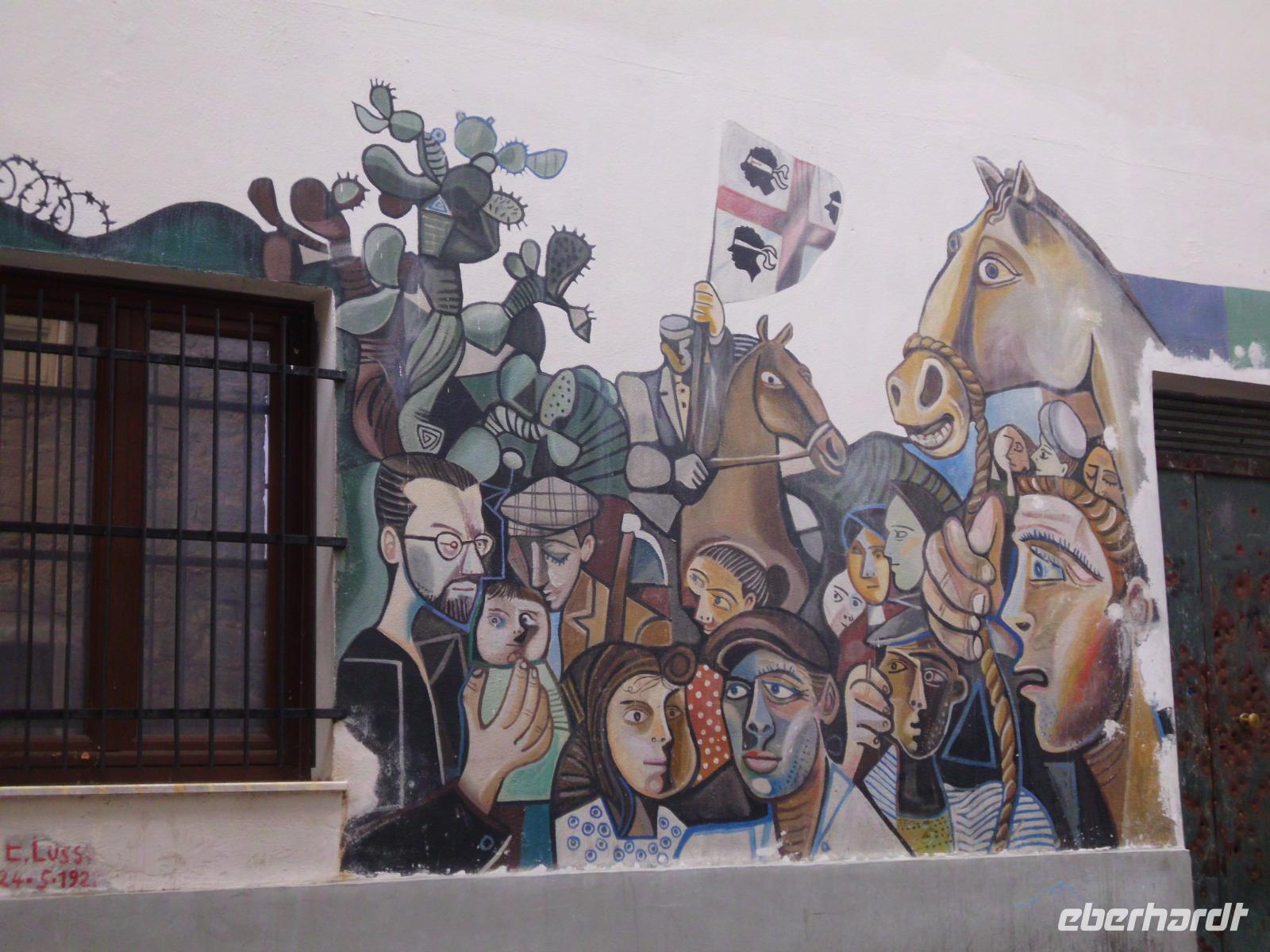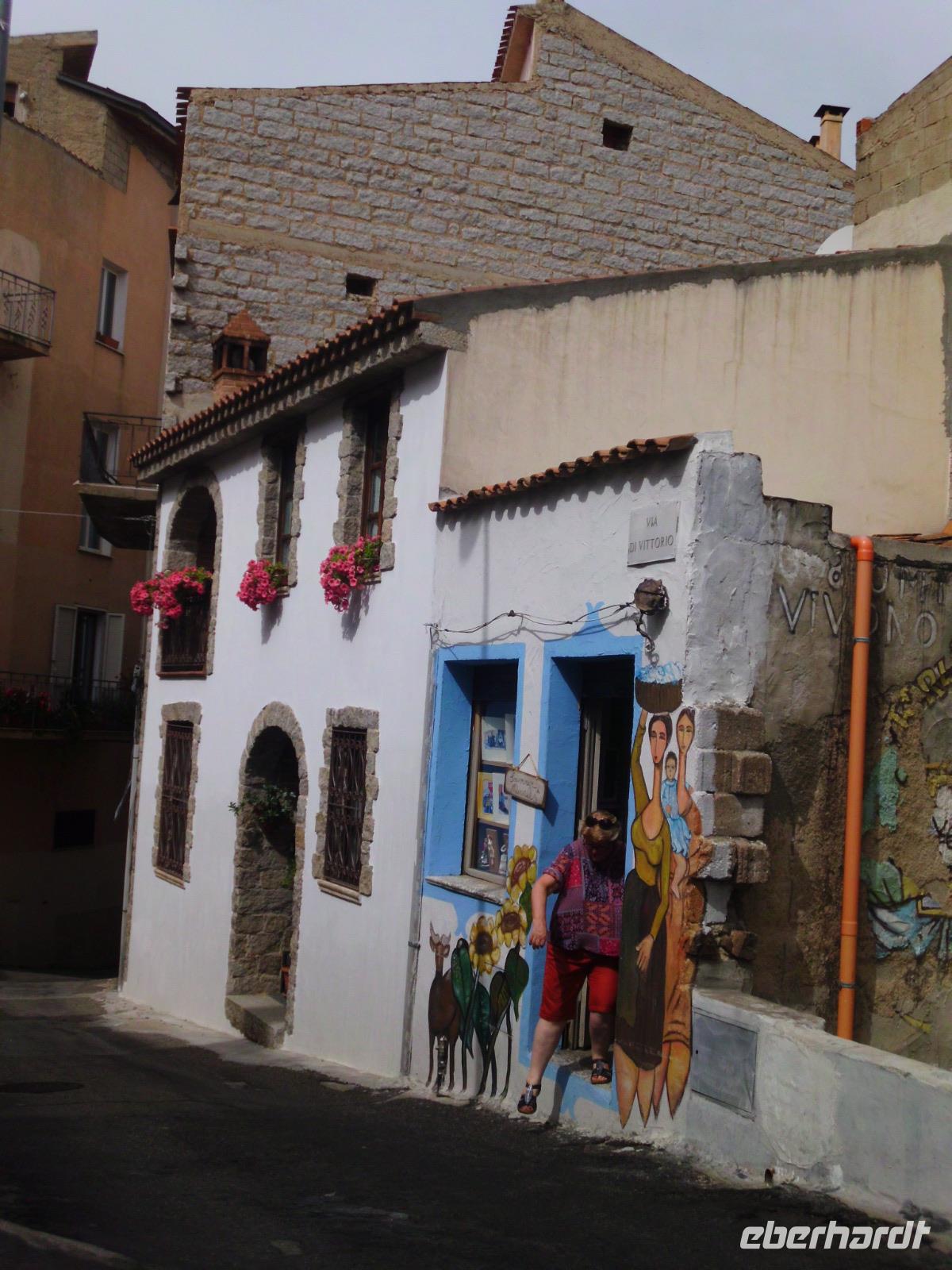 heute führt uns ein Ausflug ein Stück ins Landesinnere, entlang der Ostküste. Wir erfahren noch einmal viel über das Gebiet der Gallura, in welchem wir unser Hotel haben. In der Gallura finden wir viel Granitgestein, der zusammen mit dem Meer fantastische Postkartenmotive bildet. Wir fahren zuerst nach Orgosolo, einem zeitlang berüchtigten "Banditendorf". Reiseleiterin Veronica hatte uns viel von diesem Dorf erzählt und beruhigt erklärt, dass der Oberbandit in Haft ist. Er muss wohl gerade Ausgang gehabt haben, denn er stand fröhlich schwatzend am Gartenzaun. Das Dorf lockt aber zunehmend Touristen durch seine imposanten Gemälden an den Häuserwänden, die sogenannten "Murales". Veronica erklärt uns die Wichtigsten. Man kann sie nicht immer als schön bezeichnen, sie sind anklagend und tragen alle eine Botschaft.