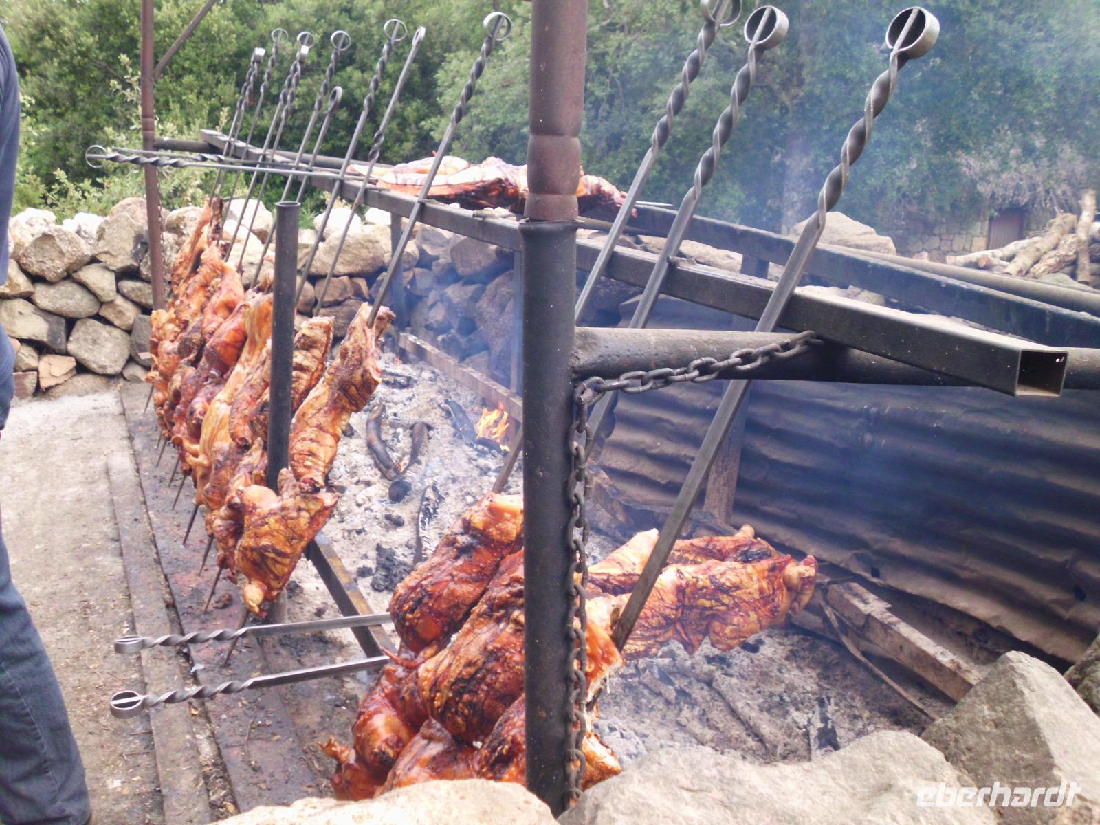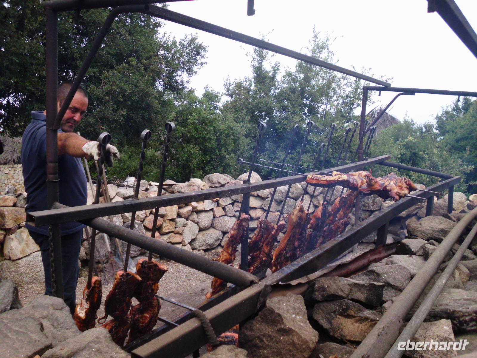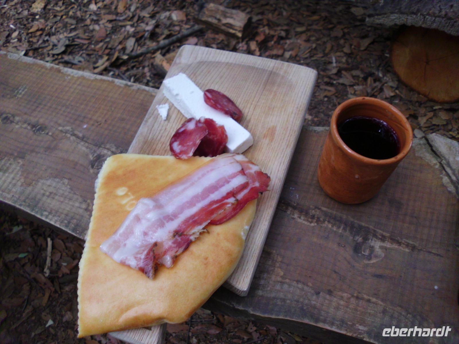 Wir fahren weiter zum Hirtenessen. Eine einstmals arbeitslose Familie hat hier eine tolle Idee entwickelt und gibt Einblick in das Leben der Hirten. Rustikal auf langen Sitzbänken gibt es Schwein vom Spieß, Sarsischa, Pecorino, Hammel. Nix mit Besteck - wir sind ja nicht bei feinen Leuten. Schnell das Weinbecherchen nochmal hingehalten und dann gibt es noch einen leckeren Grappa.
