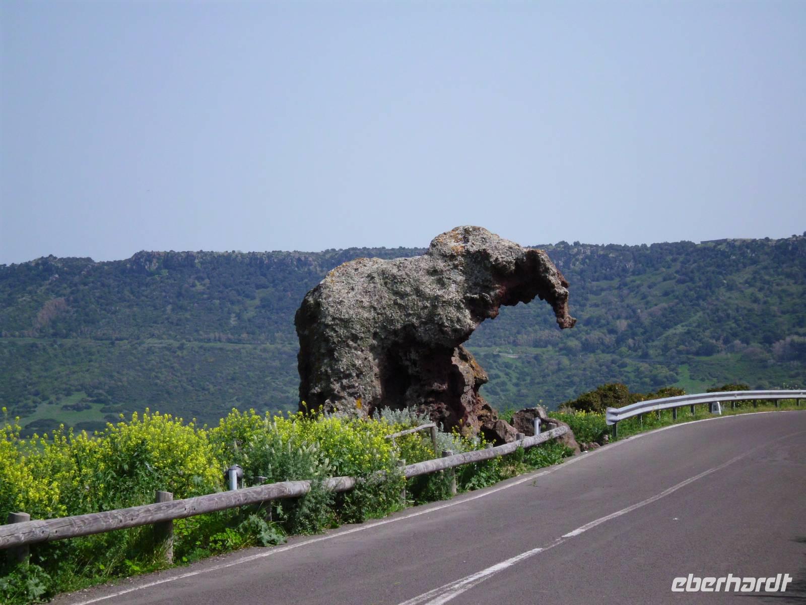 Gemeinsam starten die Wanderer und Kulturleute mit dem Bus nach Alghero. Eine recht lange Fahrt, die aber Zeit für wunderschöne Ausblicke auf die grüne Natur, den gelb blühenden Ginster, bunte Blumenfelder und ab und an auch ein Stück Küste freigibt, so zum Beispiel den traumhaften 10km langen Strand von Badesi im Nordwesten der Insel. In Isola Rossi machen wir einen Fotostop mit herrlichem Ausblick auf Korsika und die vorgelagerten Inseln. Vor Alghero verabschieden wir die Wanderer und tauchen ein in eine Stadt mit Stadtmauer und einem relativ intakten mittelalterlichen Altstadtkern. Rainer zeigt uns die herrliche Kirche San Michele, mit ihrer farbigen Kuppel aus Mosaiken, wirklich ein „Hingucker". Alghero ist stark katalanisch geprägt, das zeigen auch viele Straßenschilder in 2 Sprachen, außerdem zeugen die vielen Schmuckgeschäfte von dem Korallenreichtum, wovon aber heute keine mehr verarbeitet werden dürfen bzw. nur limitiert. Wir verbringen noch etwas Zeit hier, empfangen dann wieder unsere Wandergruppe, die „Stadt" mit „Natur" getauscht hat und auch voller Eindrücke ist. Am Nachmittag fahren wir gemeinsam ins zauberhafte Städtchen Castelsardo mit seiner Festung, ursprünglich zur Sicherung der Meerenge von Bonifacio gegründet. Das Städtchen hat sich trotz Restaurants und Souvenirgeschäften viel Ursprüngliches bewahrt und im Gassenlabyrinth trauen wir uns gar nicht so weit vom Treffpunkt weg. An der Straße zu Castelsardo gibt es noch ein feines Fotomotiv, den Roccia del Elefante (Elefantenfelsen). Wirklich lustig, was die Natur hier gezaubert hat und es ist noch nicht das letzte Tiermotiv was wir sehen. Irgendwo verstecken sich auch noch Bär, Häschen, Frosch...