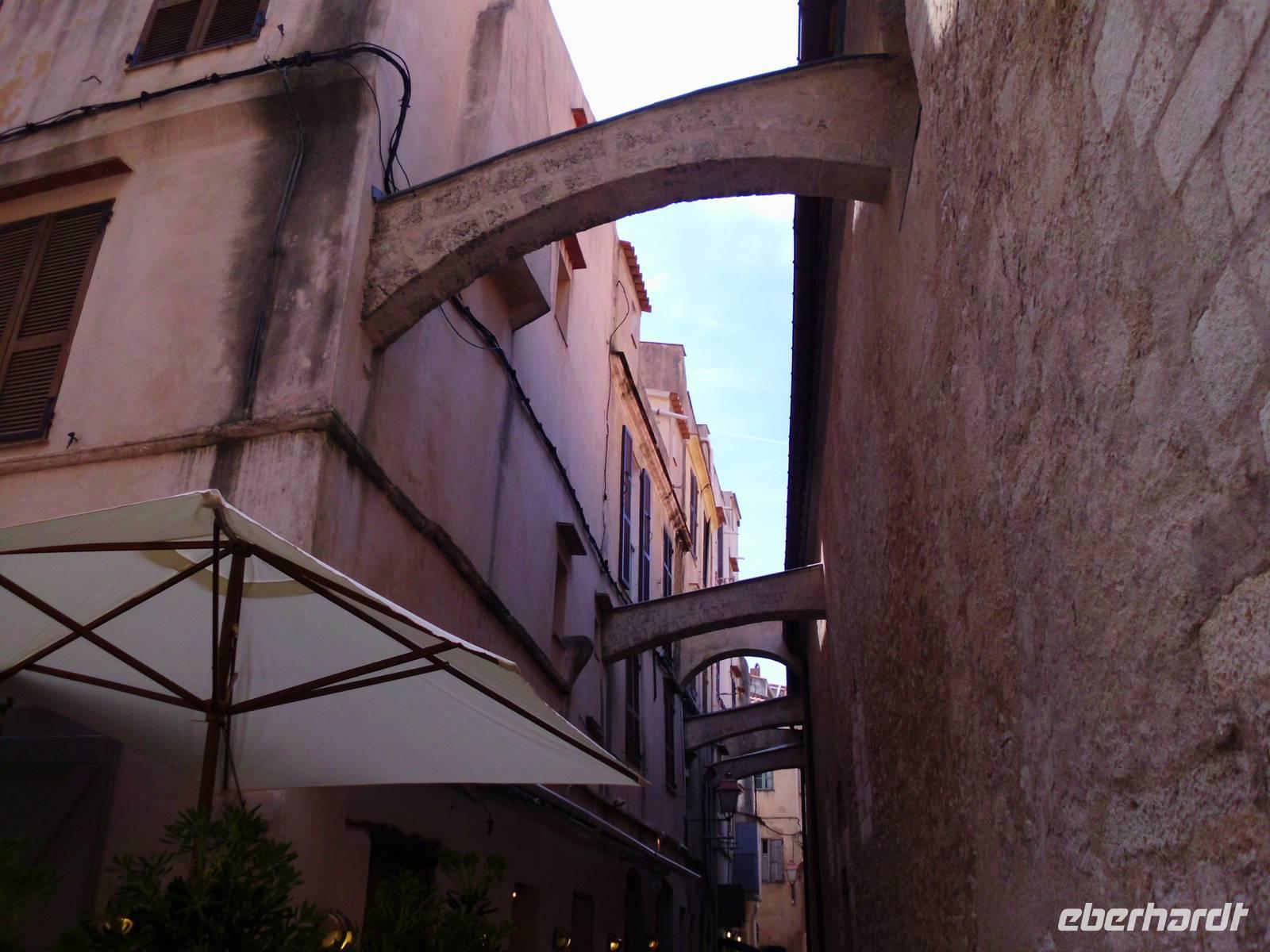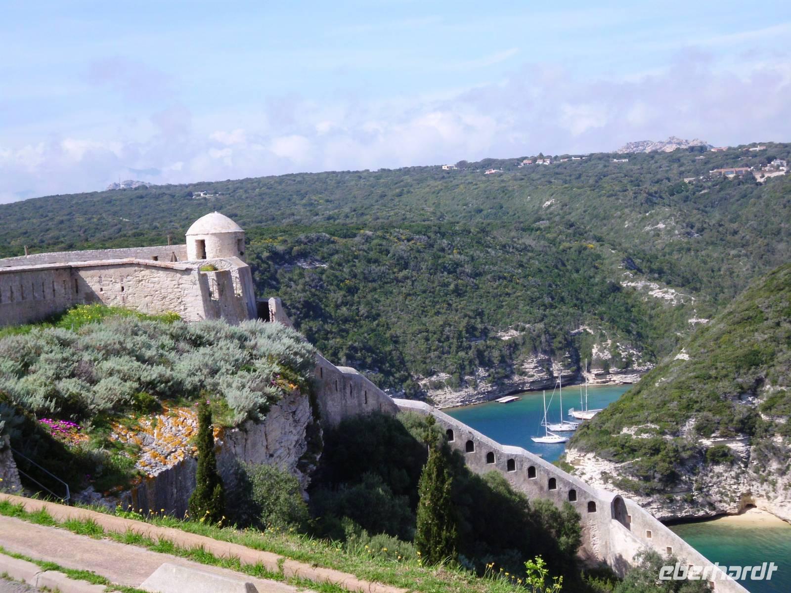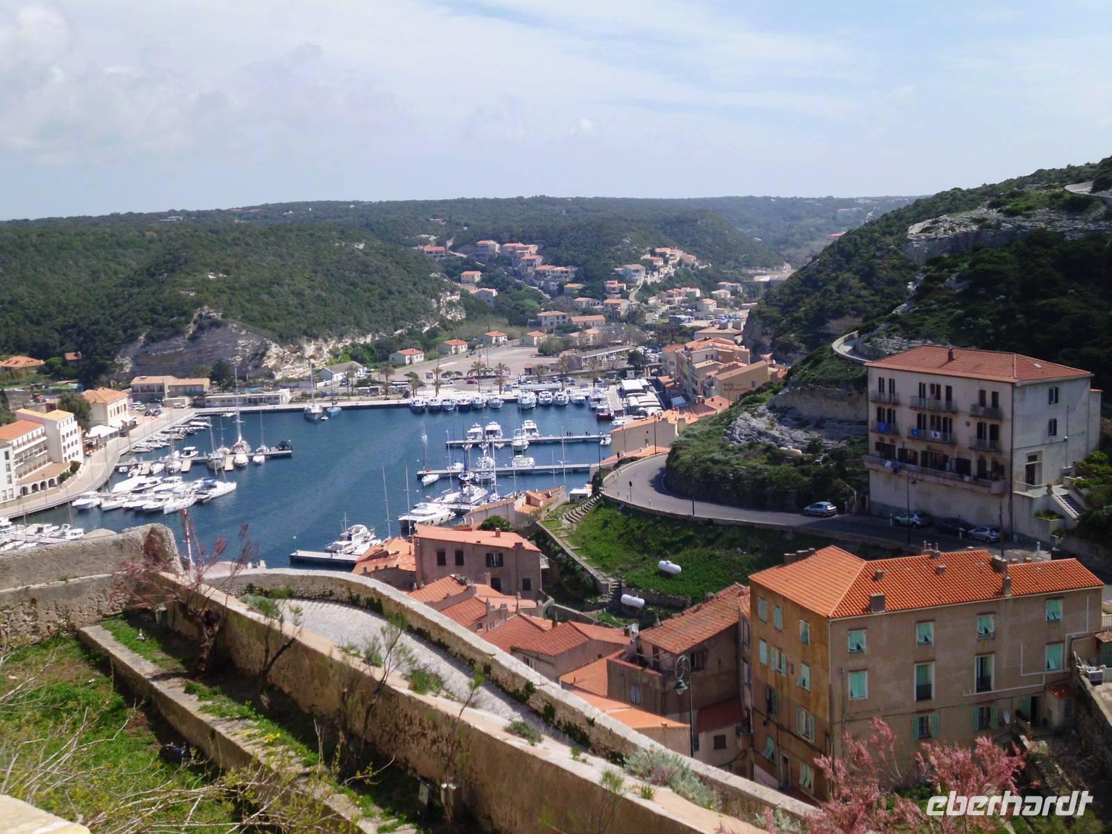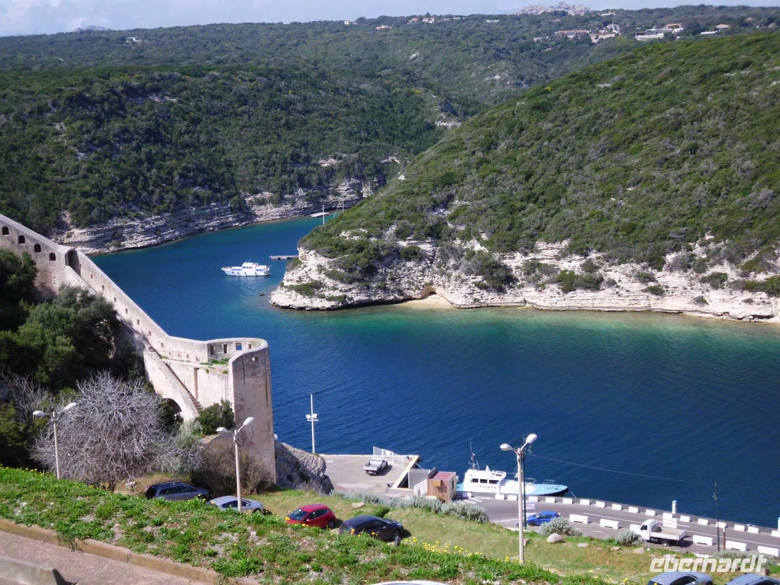 Gesehen haben wir sie schon von Weitem und es ist tatsächlich Schnee, was noch auf den Bergkämmen liegt. Heute dürfen wir einen Teil Korsikas selbst kennenlernen und die Neugier auf diese Insel macht die Gruppe komplett. Im Hafen von Santa Teresa steht unsere Fähre bereit. Es sind an dieser Stelle nur 12 km bis Korsika. Schon die Hafeneinfahrt in Bonifacio ist beeindruckend, links und rechts hohe Felsen. In Korsika angekommen, verabschieden wir am Hafen von Bonifacio unsere Wanderer, die an diesem Tag wirklich grandiose Ausblicke erleben, die uns Kulturleuten verborgen bleiben. Dennoch, die Stadt hat was, viele mittelalterliche Strukturen, sie ist touristisch, lebt aber durch die Einheimischen. Fasziniert haben uns die ellenlangen, steilen Treppen zu den Wohnungstüren. Natürlich für uns unvorstellbar. Die engen Gassen machen das Stadtbild interessant. Man entdeckt immer wieder was Neues, wenn man um die Ecke biegt.