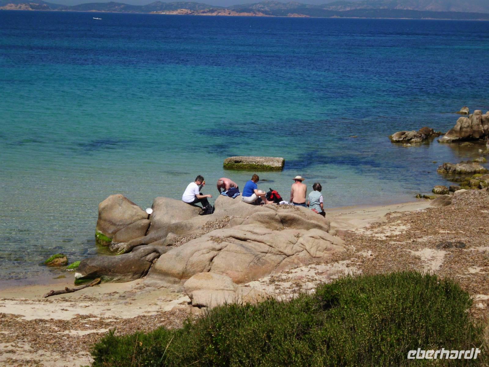 Wohl mit einer der schönsten Ausflüge erwartet uns gleich zu Beginn der Reise und mit ihnen Rainer und Rebecca, unsere beiden Reiseleiter. Beide im weitesten Sinne „einheimisch" und gut drauf. Der Beruf ist schon lange ihr Hobby, das merkt man. Wir verabschieden die Wandergruppe kurz nach dem Bergdorf San Pantaleo und besuchen als erstes Porto Rotondo einen hübschen Ort an der Costa Smeralda. Wir genießen die Sonne, die schöne Natur und das ruhige Flair der Vorsaison. Weiter geht es an die Baia Sardinia, wohl einer der schönsten Strände, glasklares Wasser in verschiedenen Schattierungen und Ruhe pur. Es bleibt viel Zeit zum Mittagessen, Strandbummeln und Genießen. Auch Porto Cervo müssen wir gesehen haben, ein Ort der Reichen, eigentlich ein Consoritum welches auf Initiative von Aga Khan 1960 gegründet wurde. Wie wir feststellen, nicht unbedingt schön, aber es ist eine eigene kleine Welt für eine bestimmte Schicht Leute, und von den Sarden mit strengen Auflagen bedacht. Reiseleiter Rainer schildert recht eindrucksvoll und vielleicht auch übertrieben, was Porto Cervo für die Einheimischen bedeutet. Aber vielleicht versteht man es auch nur so. Zu groß sind die Gegensätze zwischen dieser reichen Region und den Sarden, als dass man darüber froh sein könnte. Wie Rainer meint, hat Geld und Reichtum die Menschen dort schon „grazy" gemacht.