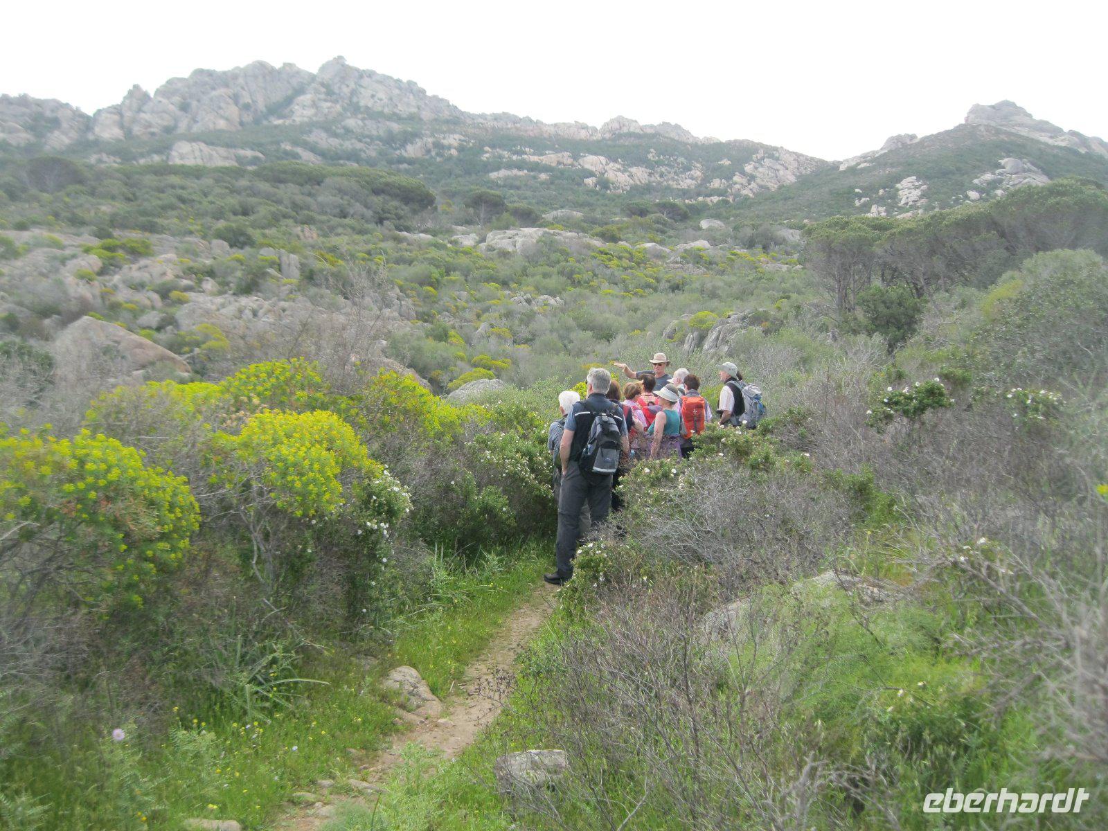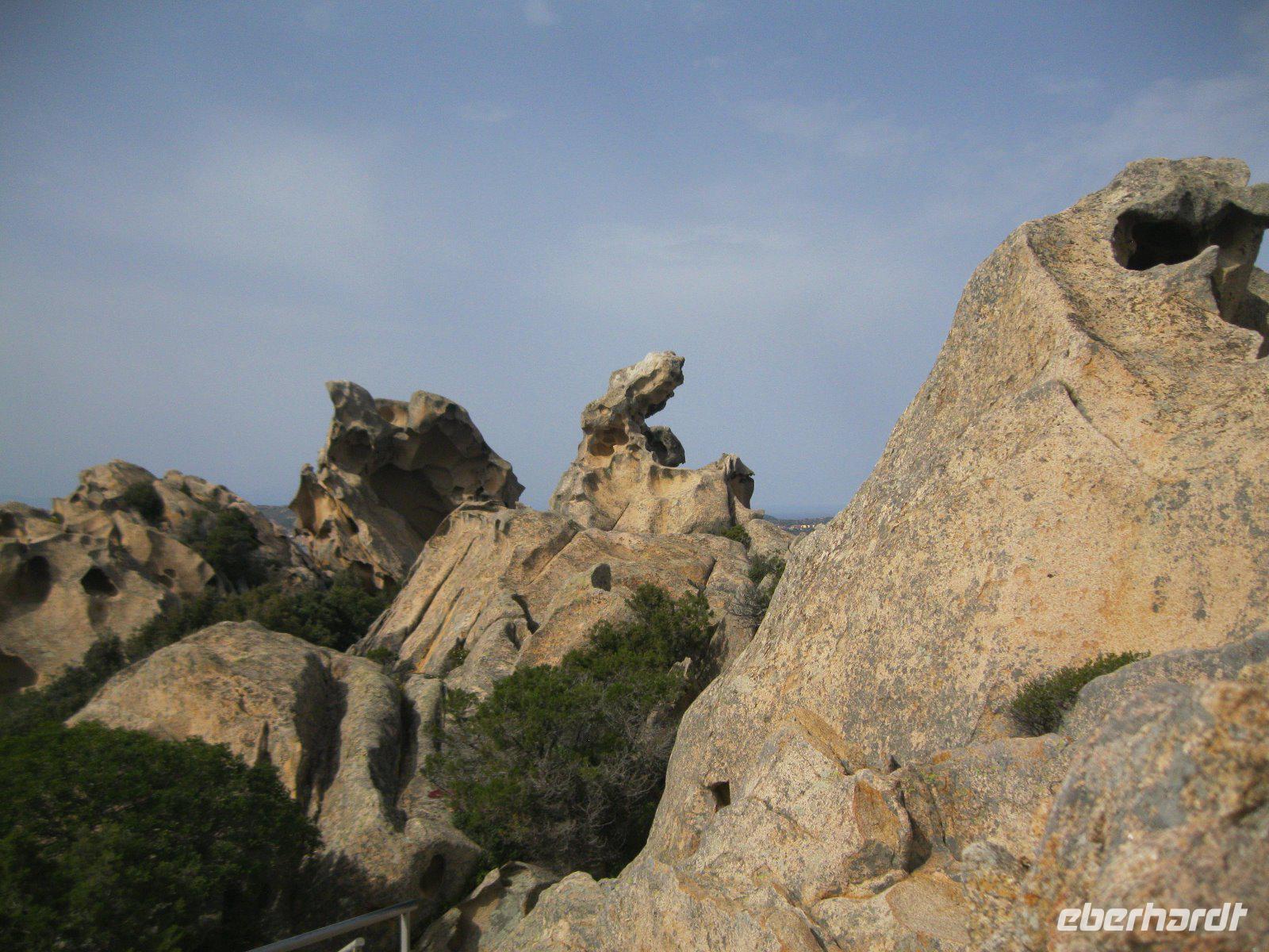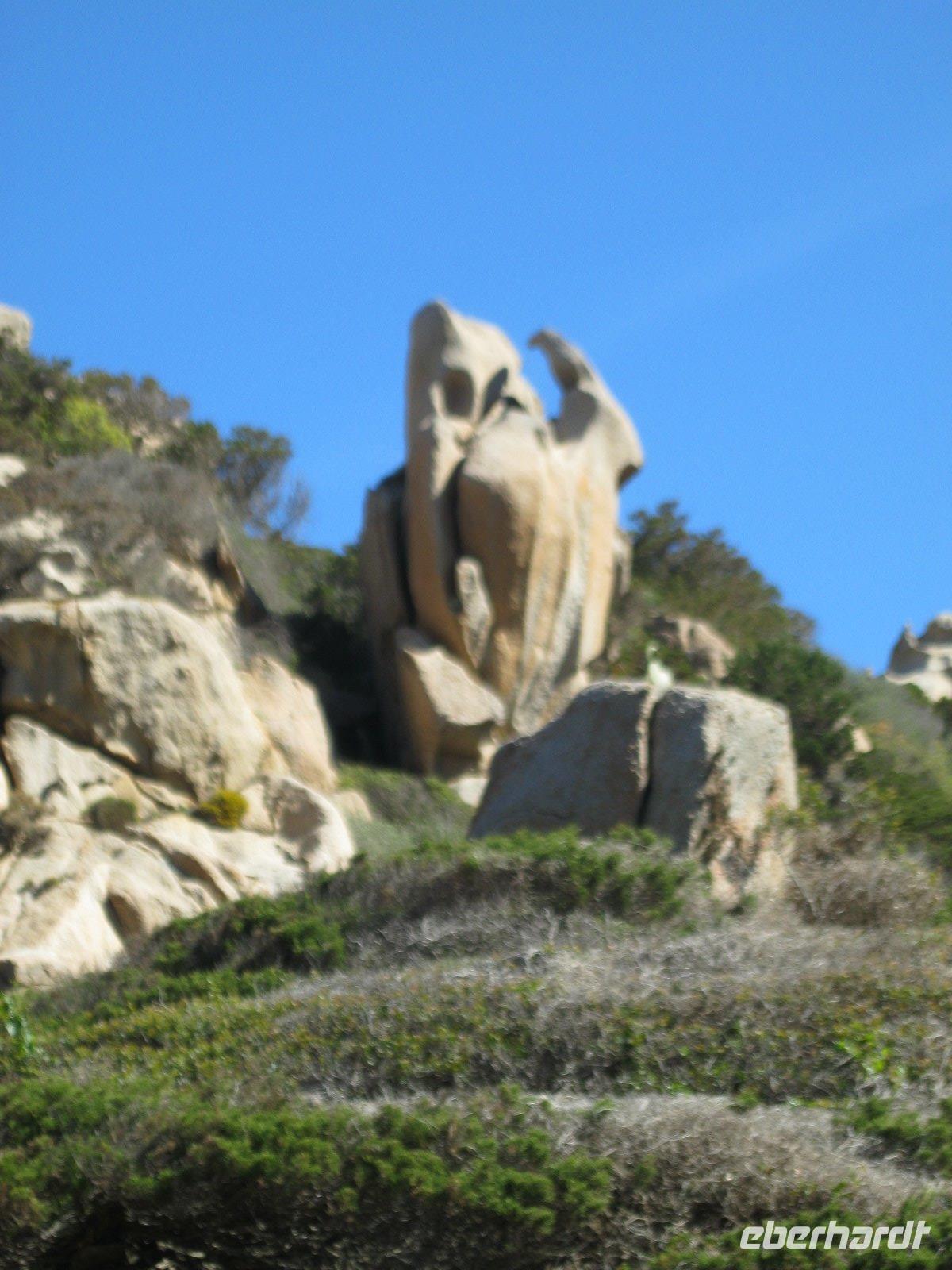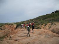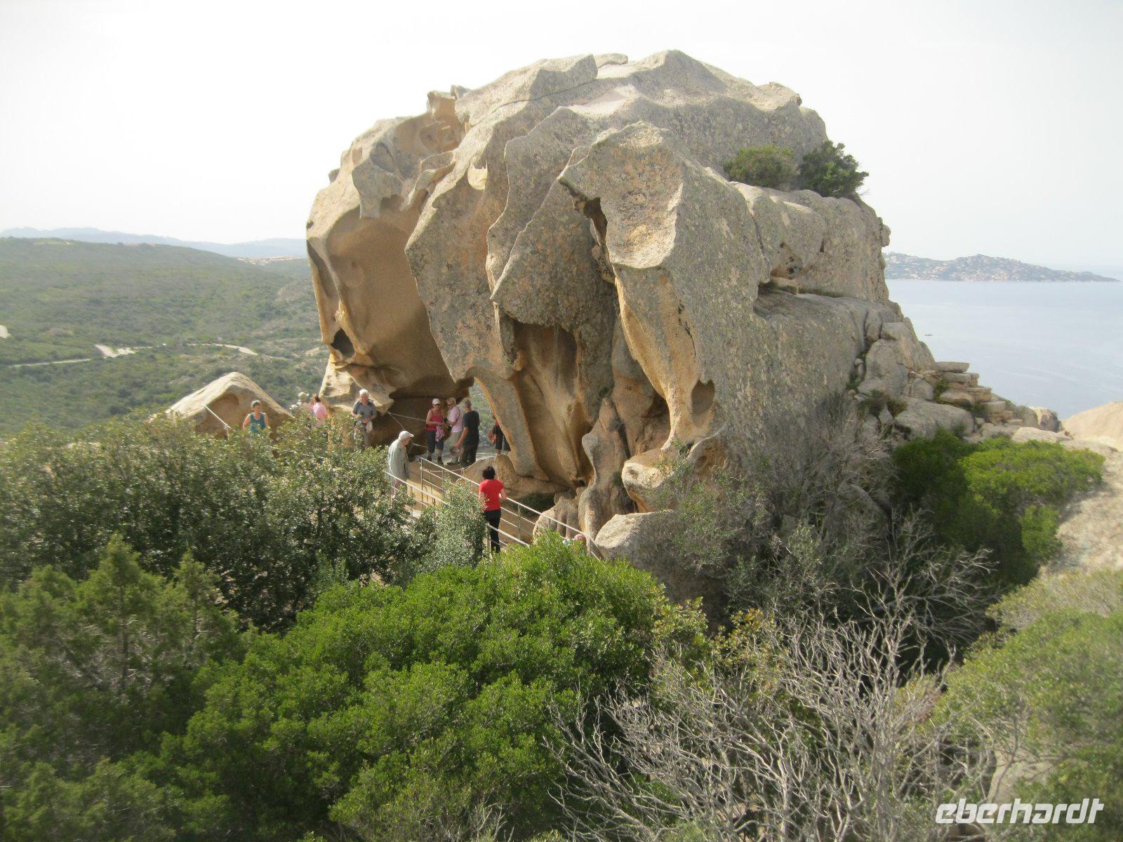 Nach einer kurzen Busfahrt setzten wir mit der Fähre von Palau nach La Maddalena über. Vom Meer aus hat man einen tollen Blick zum "Bärenfelsen". Die Insel Caprera, Ausgangspunkt unserer heutigen Tour, erreichten wir über eine Brücke. Zentrum der Insel ist das Anwesen des ital.Nationalhelden Garibaldi. Unsere Wanderung führte uns heute ein Stückchen durch den 1996 gegründeten "Parco Nazionale dell'Arcipelago di La Maddalena", wo wir gleich vom Inselhund begrüßt wurden. Er schloß sich sofort unserer Gruppe an und kletterte sogar mit auf den 180 m hohen Tejalone. Danach musste er ein erfrischendes Bad im Stausee nehmen. Am Bus verabschiedeten wir uns von Ihm. Die Mittagszeit verbrachten wir im Hafenstädtchen La Maddalena und ließen uns vom Angebot der Eisdielen verführen. Auf der Rückfahrt fuhren wir noch zum Capo d´Orso und wollten dem Bären das Fell kraulen. Ein kleiner Aufstieg und wir wurden mit einer tollen Aussicht belohnt. Die umliegenden Felsgebilde regten unsere Fantasie, von "kniende Modonna mit Kind "bis brüllendes Nilpferd" an. Die heutige Landschaft war geprägt von Maccia Flächen, Schirmpinien und bizzaren Felsformationen.