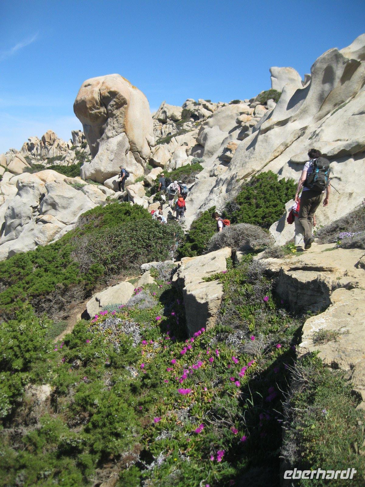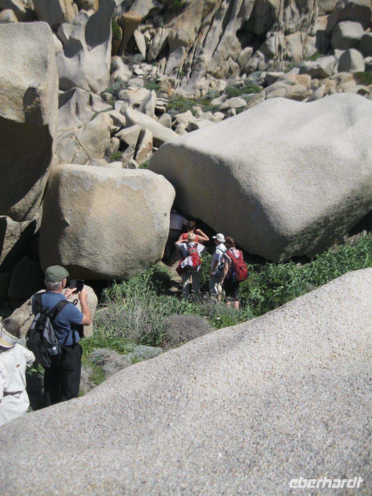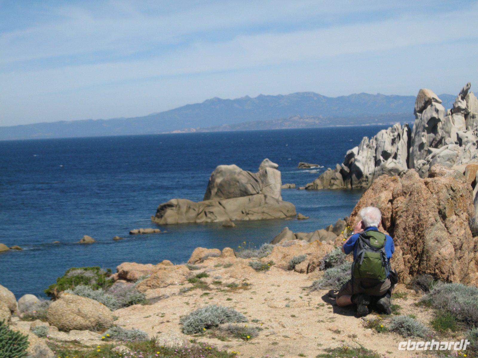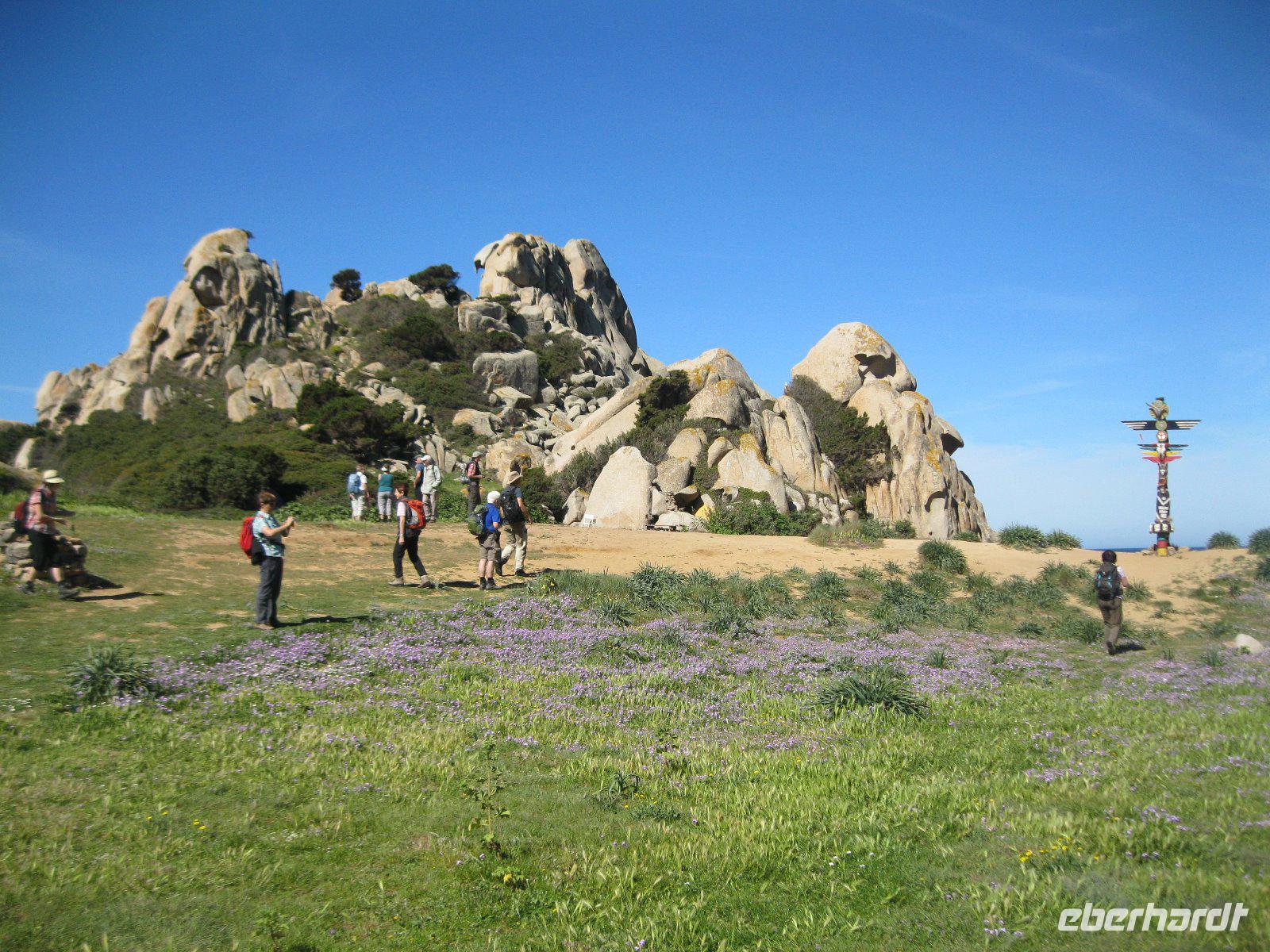 Zu den Granitsteinfelsen am Capo Testa zog es uns heute hin. Die Wanderung verlief zuerst recht ruhig und gemütlich durch die blühende, duftende Maccia. Wir erreichten einen Platz an den Klippen, der mit einem Totempfal das Valle de Luna kennzeichnete. Überall in den Felshöhlen findet man noch "Hippiebehausungen". Dieses Fleckchen Erde fanden auch wir einfach wundervoll. "Mit drei Frauen kann man dass schon aushalten - Kommentar G." Nach kurzer Pause ging die Tour erst richtig los. Über Felsblöcke und Spalten krabbelten oder rutschten wir hinauf zu den Leuchttürmen am Kap. Wir wurden mit einem tollen Ausblick über die Wasserstraße von Bonifacius zur Insel Korsika belohnt. Allerdings pustete der Wind ganz schön und wir suchten uns einen geschützteren Platz. Unser "Lieferservice -Fabio" kam angerollt und brachte uns sardische Leckereien wie Wurst, Oliven, verschieden Käsesorten, Hirtenbrot "Pane carasau" und natürlich Vino. Alle packten mit an und so war schnell ein Picknick gezaubert. Mitten in der Natur, mit Blick übers Meer, eine ganz tolle Wandertruppe, einfach nur schön !!! Wir fuhren zurück ins Hotel, denn es war noch ein Abschluss Abendessen im Restaurant "del Porto "in Cannigione geplant. Das Essen war ganz auf Fischspezialitäten abgestimmt. Wir bedankten uns bei Rainer der uns nicht nur auf den Wanderungen geführt hat, sondern auch viel Wissen über die Insel und deren Bewohner vermittelt hat. Es war ein geselliges Beisammensein, wo viel über alte Geschichten gelacht wurde. Irgendwann kam der Kellner und forderte uns zum GEHEN auf.