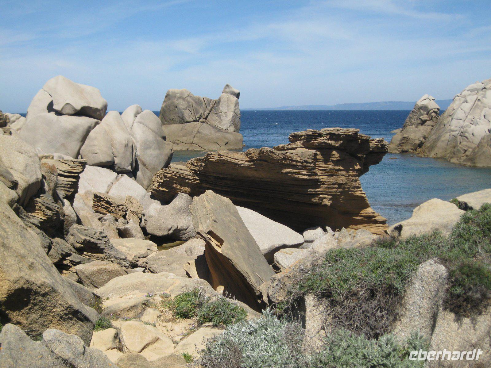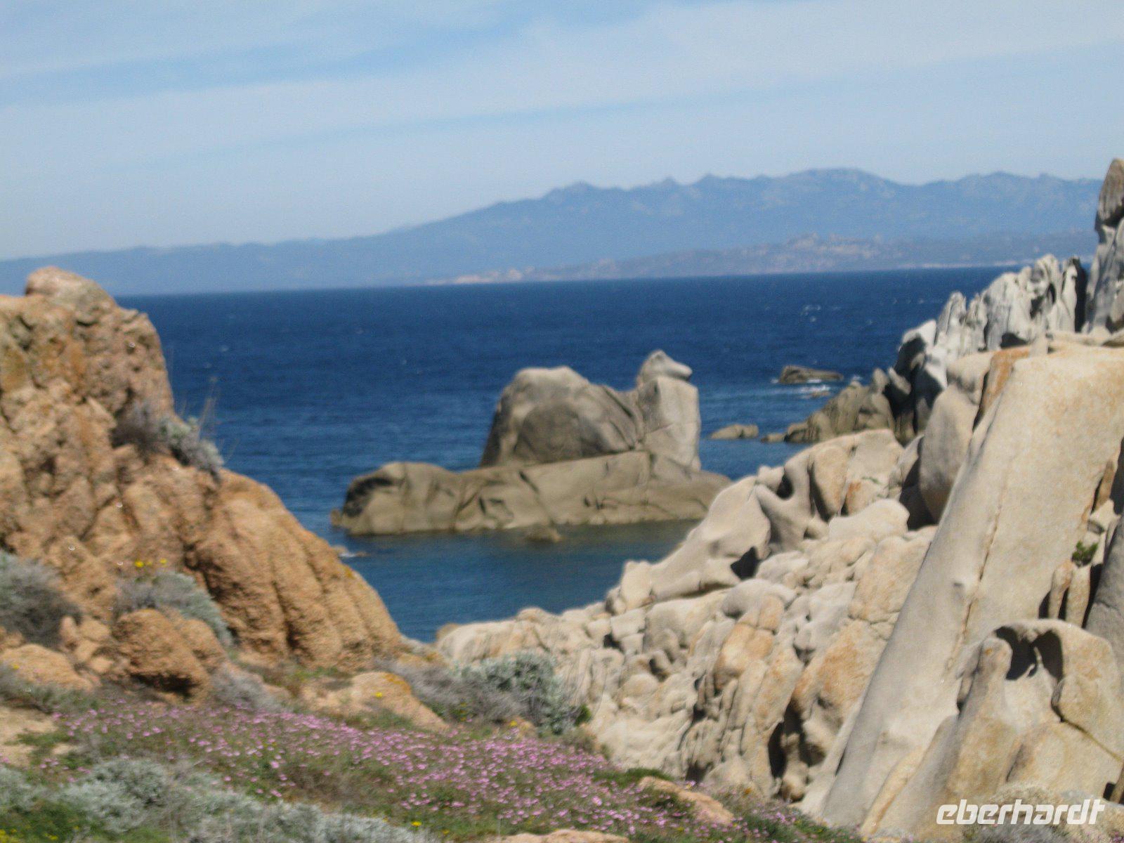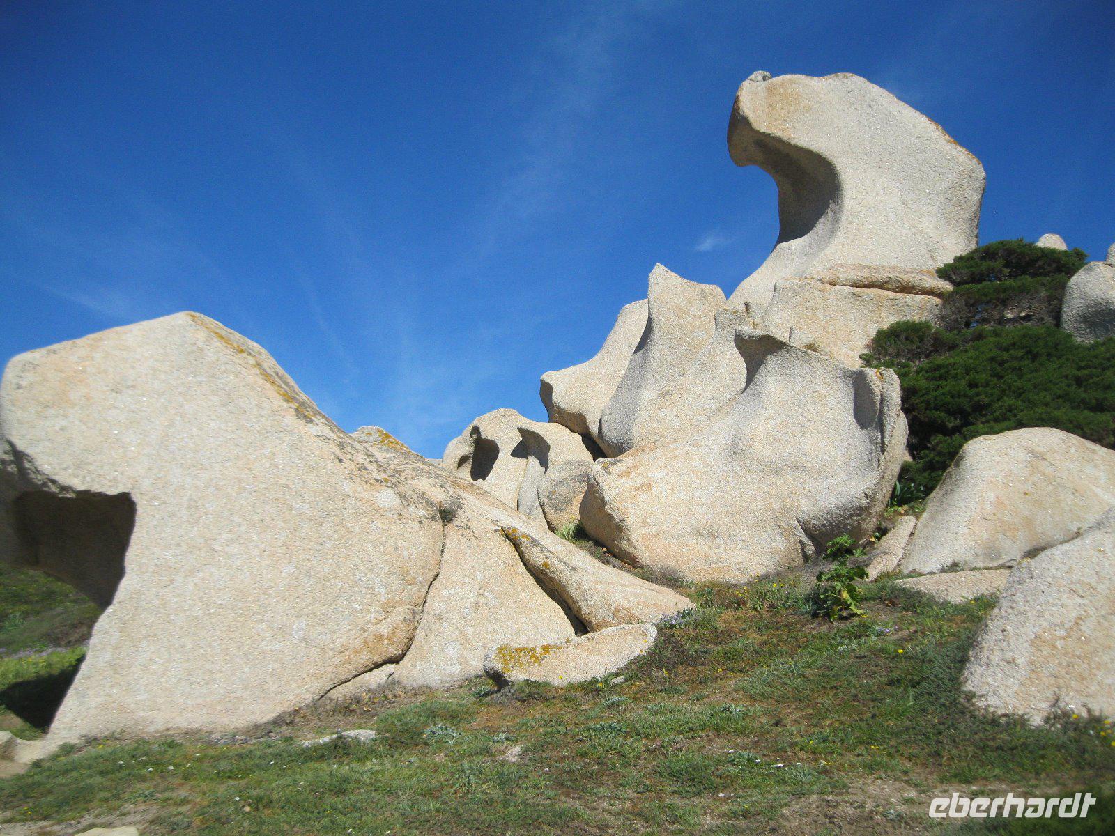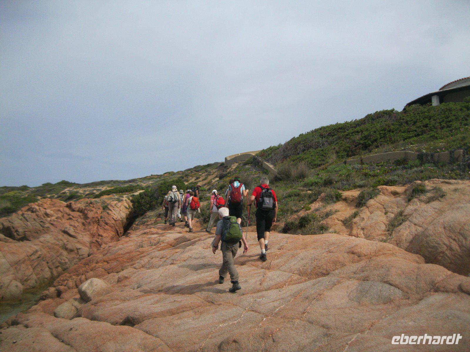 Zu den Granitsteinfelsen am Capo Testa zog es uns heute hin. Die Wanderung verlief zuerst recht ruhig und gemütlich durch die blühende, duftende Maccia. Wir erreichten einen Platz an den Klippen, der mit einem Totempfal das Valle de Luna kennzeichnete. Überall in den Felshöhlen findet man noch "Hippiebehausungen". Dieses Fleckchen Erde fanden auch wir einfach wundervoll. "Mit drei Frauen kann man dass schon aushalten - Kommentar G." Nach kurzer Pause ging die Tour erst richtig los. Über Felsblöcke und Spalten krabbelten oder rutschten wir hinauf zu den Leuchttürmen am Kap. Wir wurden mit einem tollen Ausblick über die Wasserstraße von Bonifacius zur Insel Korsika belohnt. Allerdings pustete der Wind ganz schön und wir suchten uns einen geschützteren Platz. Unser "Lieferservice -Fabio" kam angerollt und brachte uns sardische Leckereien wie Wurst, Oliven, verschieden Käsesorten, Hirtenbrot "Pane carasau" und natürlich Vino. Alle packten mit an und so war schnell ein Picknick gezaubert. Mitten in der Natur, mit Blick übers Meer, eine ganz tolle Wandertruppe, einfach nur schön !!! Wir fuhren zurück ins Hotel, denn es war noch ein Abschluss Abendessen im Restaurant "del Porto "in Cannigione geplant. Das Essen war ganz auf Fischspezialitäten abgestimmt. Wir bedankten uns bei Rainer der uns nicht nur auf den Wanderungen geführt hat, sondern auch viel Wissen über die Insel und deren Bewohner vermittelt hat. Es war ein geselliges Beisammensein, wo viel über alte Geschichten gelacht wurde. Irgendwann kam der Kellner und forderte uns zum GEHEN auf.