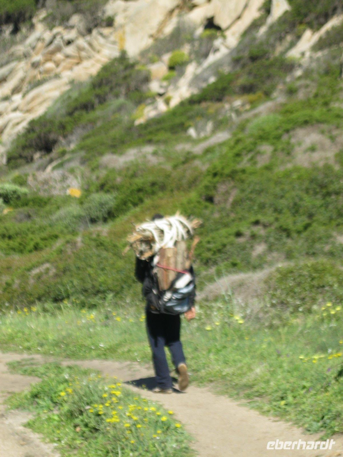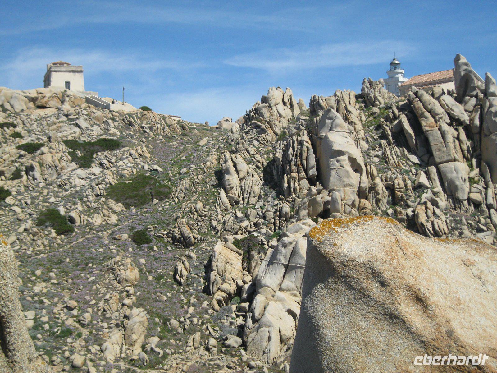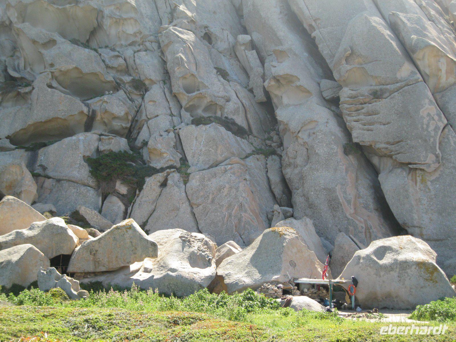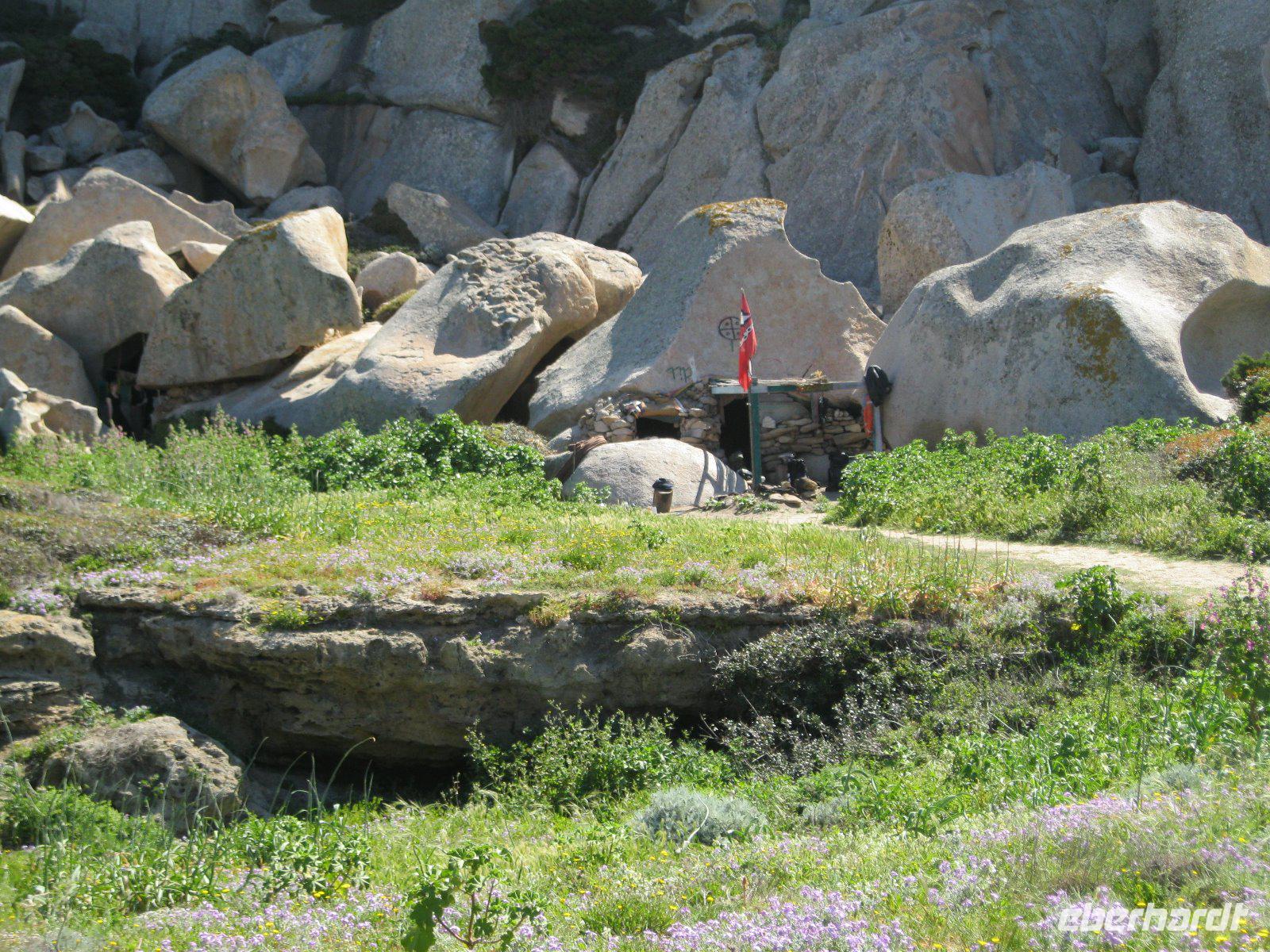 Zu den Granitsteinfelsen am Capo Testa zog es uns heute hin. Die Wanderung verlief zuerst recht ruhig und gemütlich durch die blühende, duftende Maccia. Wir erreichten einen Platz an den Klippen, der mit einem Totempfal das Valle de Luna kennzeichnete. Überall in den Felshöhlen findet man noch "Hippiebehausungen". Dieses Fleckchen Erde fanden auch wir einfach wundervoll. "Mit drei Frauen kann man dass schon aushalten - Kommentar G." Nach kurzer Pause ging die Tour erst richtig los. Über Felsblöcke und Spalten krabbelten oder rutschten wir hinauf zu den Leuchttürmen am Kap. Wir wurden mit einem tollen Ausblick über die Wasserstraße von Bonifacius zur Insel Korsika belohnt. Allerdings pustete der Wind ganz schön und wir suchten uns einen geschützteren Platz. Unser "Lieferservice -Fabio" kam angerollt und brachte uns sardische Leckereien wie Wurst, Oliven, verschieden Käsesorten, Hirtenbrot "Pane carasau" und natürlich Vino. Alle packten mit an und so war schnell ein Picknick gezaubert. Mitten in der Natur, mit Blick übers Meer, eine ganz tolle Wandertruppe, einfach nur schön !!! Wir fuhren zurück ins Hotel, denn es war noch ein Abschluss Abendessen im Restaurant "del Porto "in Cannigione geplant. Das Essen war ganz auf Fischspezialitäten abgestimmt. Wir bedankten uns bei Rainer der uns nicht nur auf den Wanderungen geführt hat, sondern auch viel Wissen über die Insel und deren Bewohner vermittelt hat. Es war ein geselliges Beisammensein, wo viel über alte Geschichten gelacht wurde. Irgendwann kam der Kellner und forderte uns zum GEHEN auf.