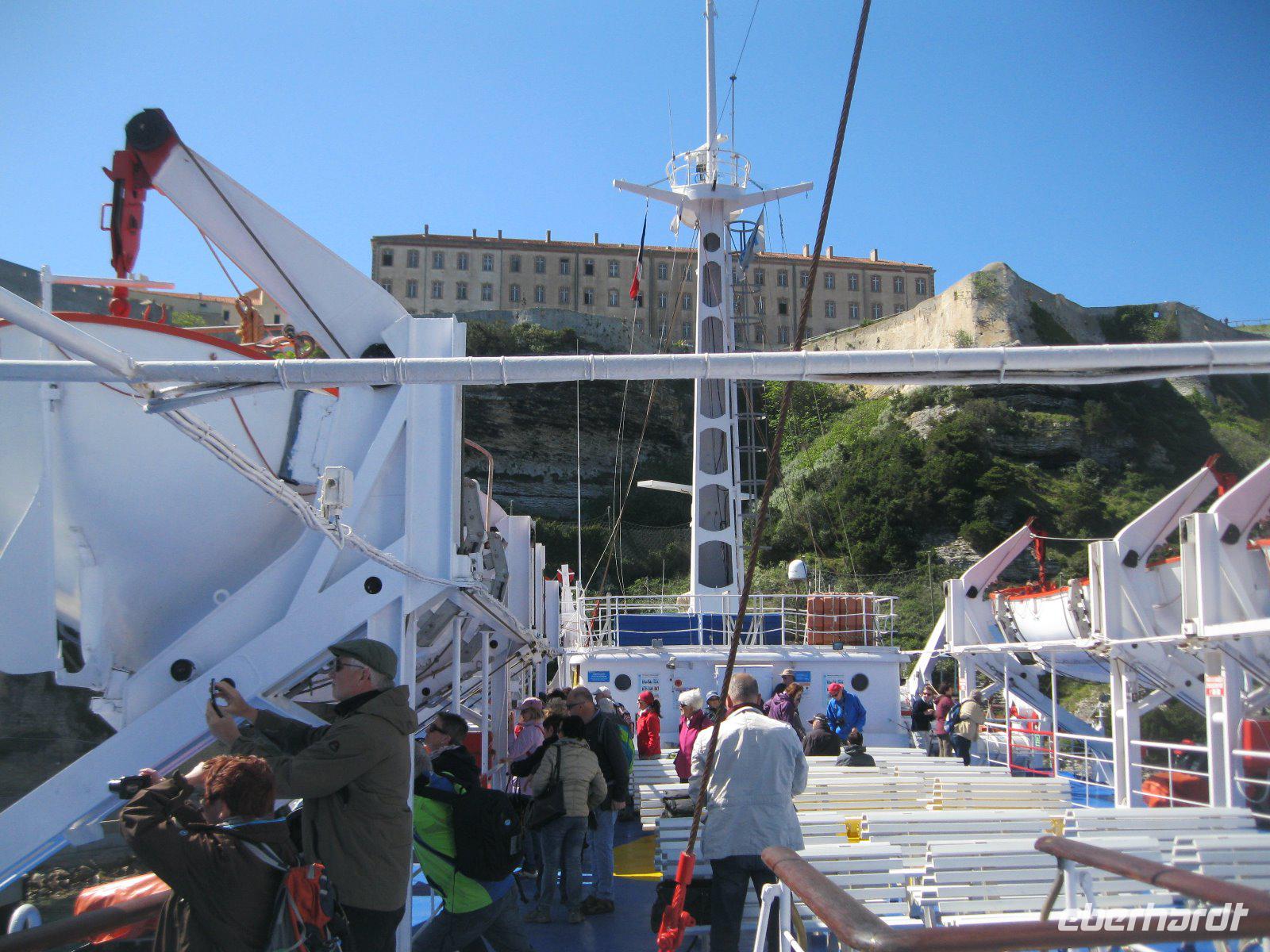 Von Santa Teresa aus fuhren wir nach Bonifacio, auf die franz. Insel Korsika. Eine Seefahrt bei strahlend blauem Himmel kann auch ganz schön schaukelnd sein. An Land ging es erst einmal nach oben, um an der Steilküste in Richtung Leuchtturm zu wandern. An jeder Biegung gab es andere Fotomotive. Nach einer kurzen Pause marschierten wir in Richtung Zitadelle und besichtigten die malerische Altstadt mit den vielen verwinkelten Gassen. Einige Gäste stiegen die Treppe des "Königs von Aragon" hinunter um die Trinkwasserquelle zu suchen. Wieder Andere besichtigten den Friedhof am Meer mit seinen bizzaren Grabhäusern - es soll der schönste mediterrane Friedhof sein. Nach einem ausgiebigen Bummel ging es zurück nach Italien. Die Überfahrt verlief diesmal ruhiger, so das allen das Abendessen mundete.