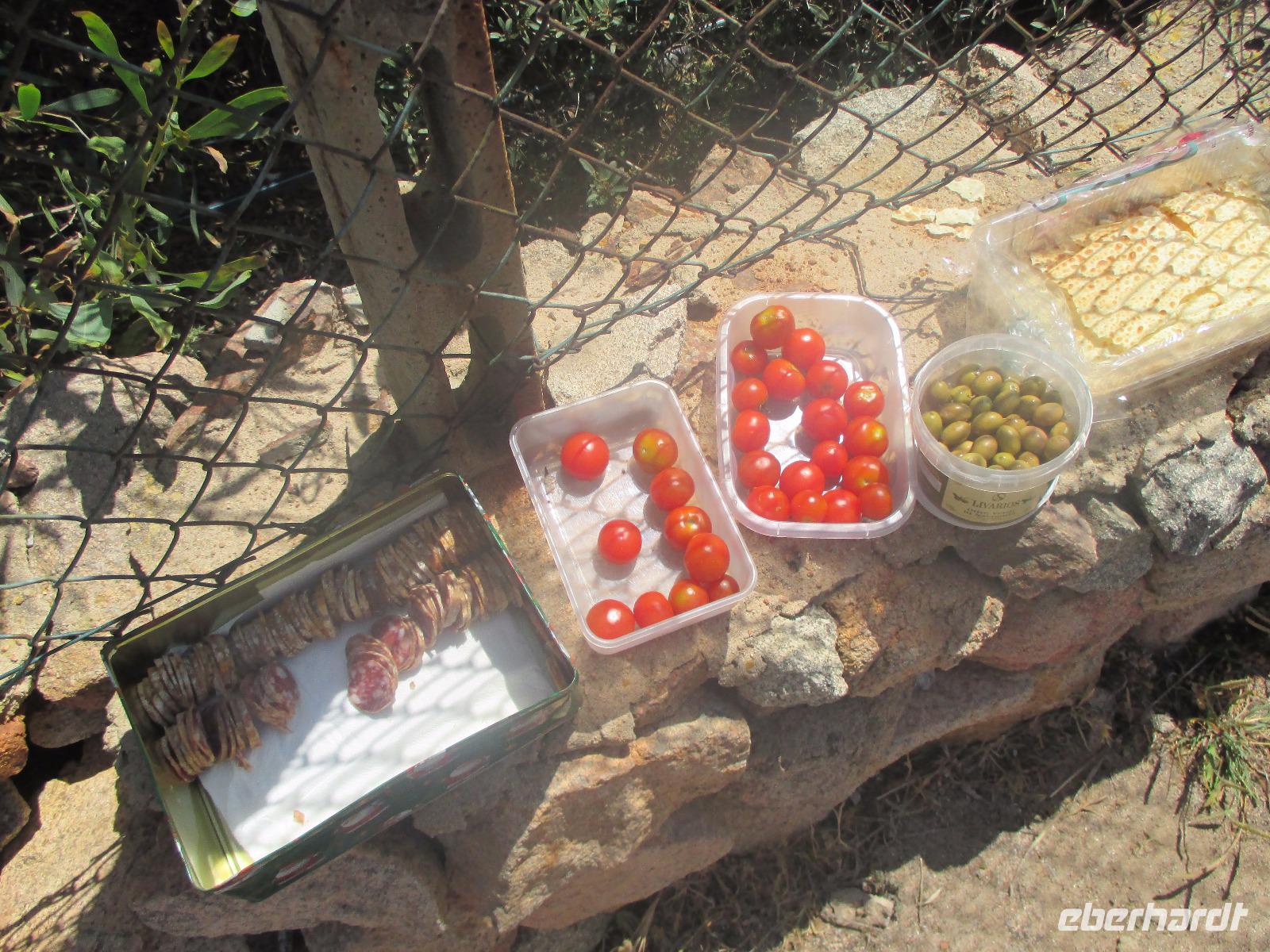 Nach dieser anstrengenden, aber schönen Tour haben wir uns alle eine Stärkung verdient. In einem typisch sardischen Agriturismo werden wir mit regionalen Spezialitäten und Köstlichkeiten empfangen. Als Agriturismo dürfen sich nur Höfe bezeichnen, die zu 80 % Produkte aus eigener Herstellung anbieten, verarbeiten und verkaufen. Als Hauptspeise werden und kleine sardische Klößchen in Tomatensoße serviert. Zum Nachtisch gibt es süße Köstlichkeiten und auch der lokale Schaps Myrto, der aus der gleichnamigen Pflanze gewonnen wird, darf bei diesem Mahl nicht fehlen. Diese Pflanze ist uns auf unseren Wanderungen auch schon mehrmals begegnet und hebt sich durch seinen besonderen, würzigen Geruch hervor. Später haben wir die Möglichkeit auf dem Hof Olivenöl aus eigener Produktion und frischen Ziegenkäse zu erwerben.