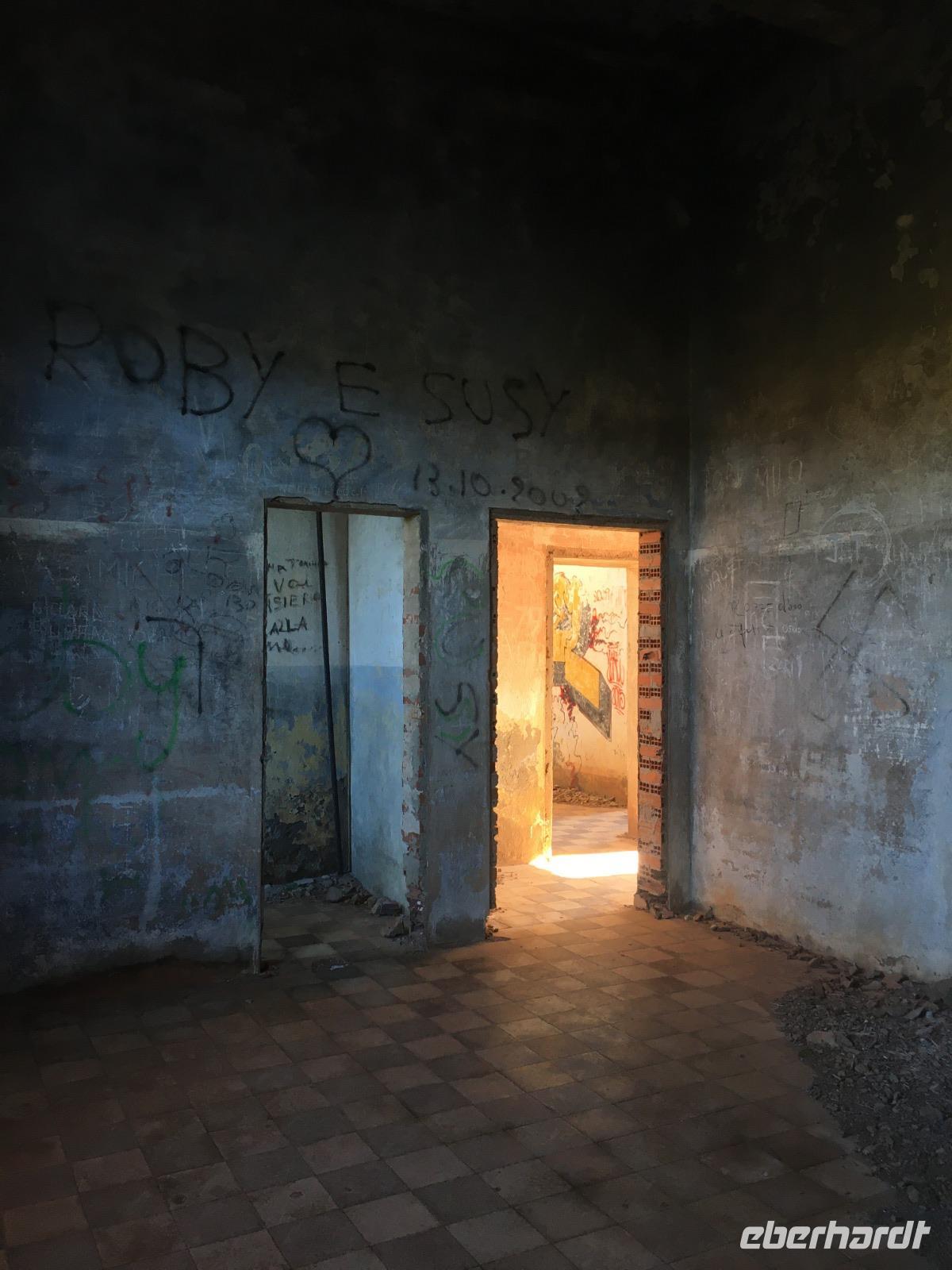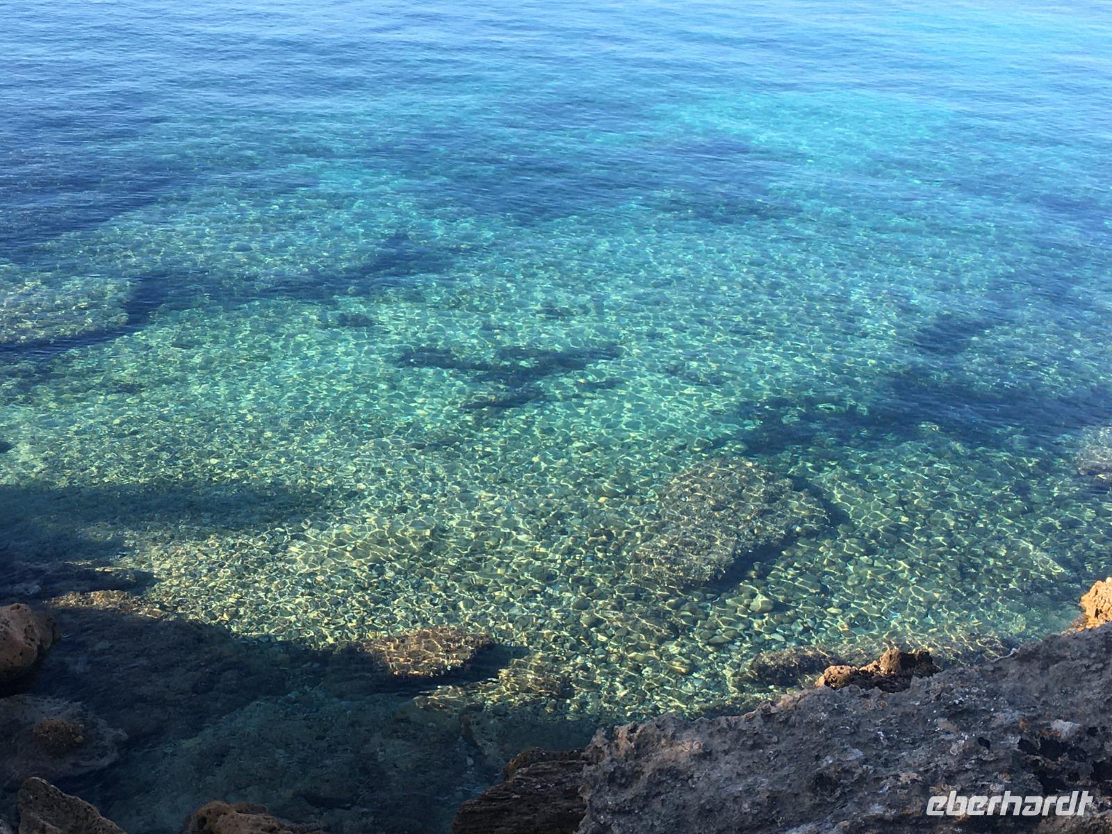Nach dem Frühstück fahren wir heute mit dem Bus wieder an die Küste, denn auf dem Programm steht heute ein Abschnitt des Küstenwanderweges Sentierro della Nurra. Unterwegs treffen wir erste einheimische tierische Bewohner, die vor uns auf der Straße nach Futter suchen. Ab und zu weht der Wind Glockengeläut der weiter entfernten Schafs- und Rinderherden zu uns, während wir auf die Küste zuwandern. Als wir auf den Klippen unsere erste Pause einlegen, gesellt sich noch ein weiterer Wanderer auf vier Pfoten zu uns, der uns von nun an begleitet. Der Weg führt weiter entlang der Küste und unterwegs bietet sich auf jeder Kuppe eine fantastische Aussicht auf das Meer - untermalt von Sergios scherzhaften Drohungen, uns von der Klippe zu stürzen und begleitet von dem Mischlingshund, der mit unbändiger Energie immer ein paar Meter vorausläuft oder mal kurz in die Büsche verschwindet, um die kleinen sardischen Hasen zu jagen. Die Sonne brennt immer heißer und so sind wir froh, als wir den Bus erreichen und die kühle Klimaanlage genießen können. Danach legen wir in einer nahen Bucht eine Badepause ein und setzen uns an den Strand oder springen ins erfrischende Mittelmeer. So geht nun auch unser sechster Tag auf Sardinien zu Ende.