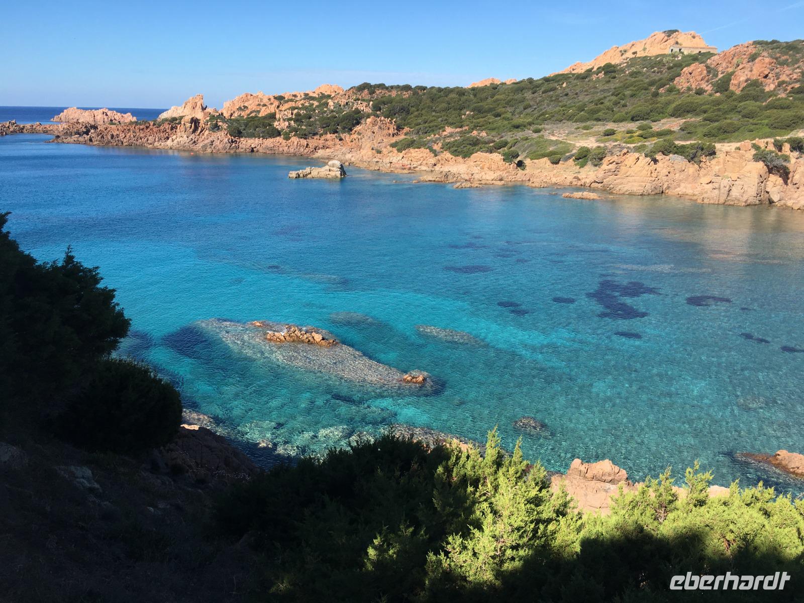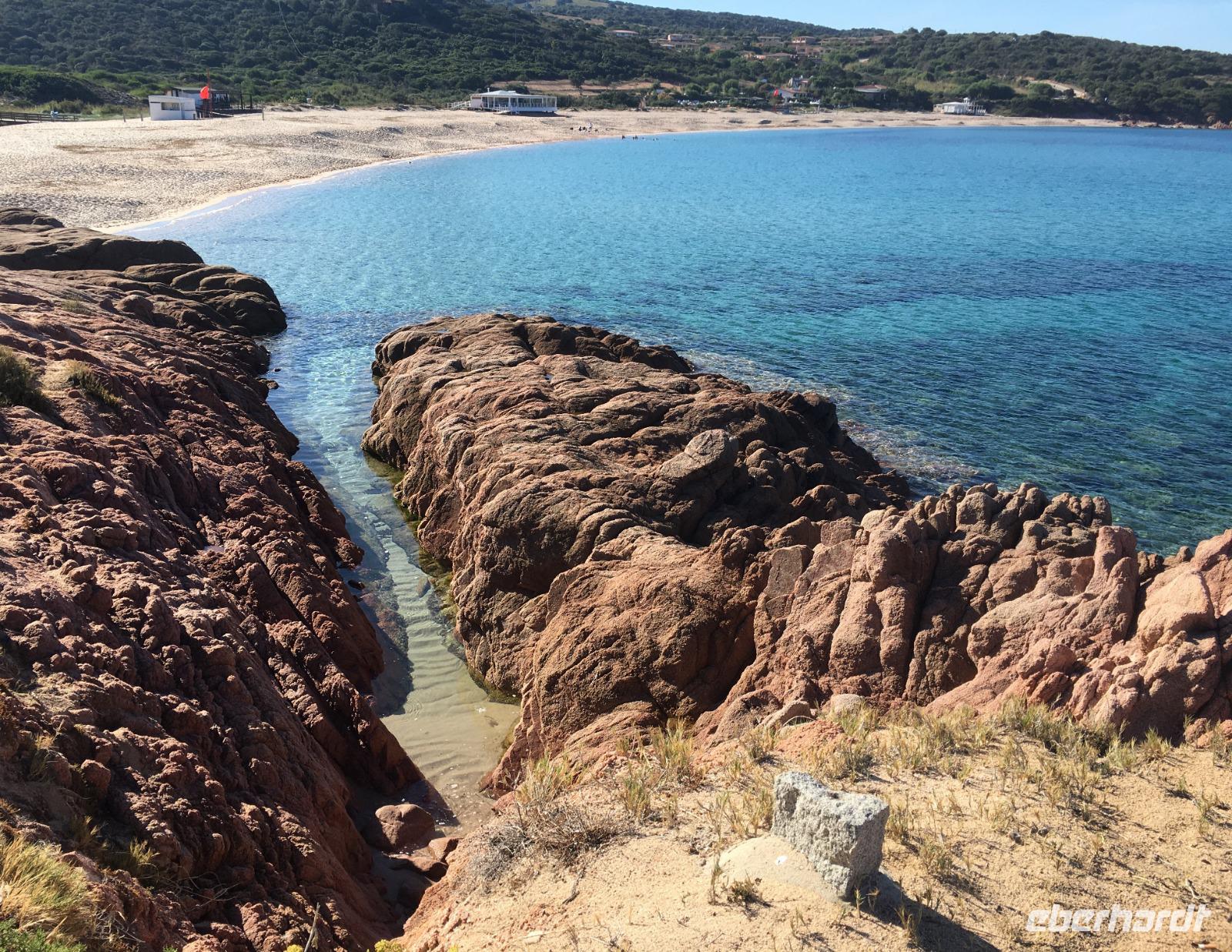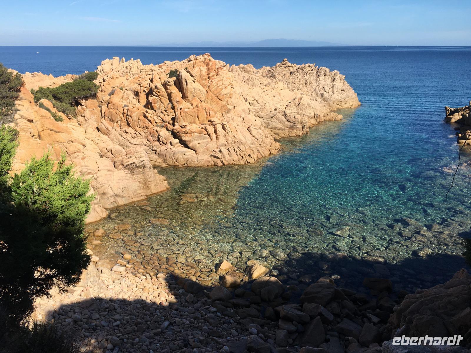 Unsere heutige Wanderung beginnt am herrlichen Strand von Isola Rossa. Während wir durch den Sand laufen, badet schon die erste Gruppe gut gelaunter und weniger gut singender Italiener, die uns begeistert zuwinken. Wir wandern weiter über die Felsen und durch die Dünenlandschaft und lauschen unterwegs den Erklärungen des Reiseleiters. Heute zeigt er uns den besonderen Erdbeerbaum, aus dessen Blüten der bittere Honig Corbezzolo hergestellt wird. Nachdem wir durch einen kleinen Pinienwald gewandert sind, breitet sich vor uns zum ersten Mal das Panorama des Kap Cannedi aus. Hinter den roten Granitfelsen glitzert das blaue Meer und am Horizont ist sogar Korsika zu erkennen. Wir wandern in der höher steigenden Sonne weiter entlang der Küste und bestaunen unterwegs immer wieder die Aussicht auf die Granitfelsen und das kristallklare Wasser in den Buchten unter uns. Über Stock und Stein, über Sandwege und durch die niedrige Maccia geht es weiter, bevor wir auf den Felsen unsere Mittagspause mit Blick auf das Meer verbringen. Auch nach der Mittagspause erwartet uns noch die ein oder andere versteckte Bucht und als wir wieder den Strand von Isola Rossa erreichen, genießen wir den Ausblick auf die Bucht bei einem kühlen Getränk oder mit den Füßen im kühlen Meer. Anschließend fahren wir mit dem Bus weiter in eins der malerischsten sardischen Städtchen, Castelsardo, das hoch oben auf einer Klippe über dem Meer thront. Bei einem Spaziergang durch die Stadt laufen wir durch die mit Kopfstein gepflasterten Gässchen, knipsen mit einer Gruppe Motorradfahrer Fotos auf ihren roten Vespas und bestaunen die gewaltigen Mauern der Festung. Eine kleine Eispause rundet den Besuch in Castelsardo ab und wir begeben uns wieder auf den Heimweg.