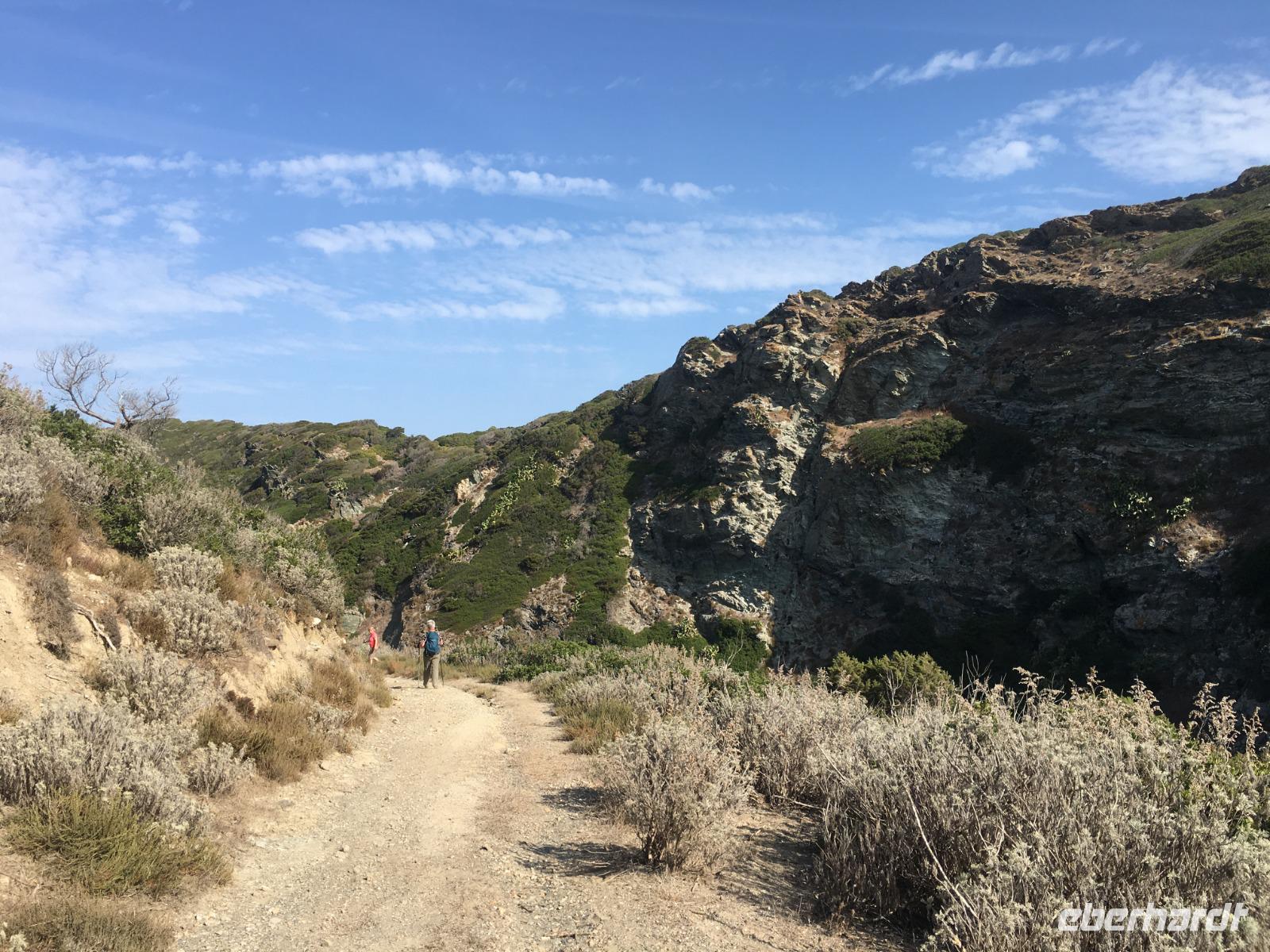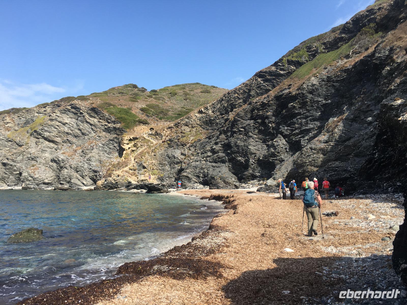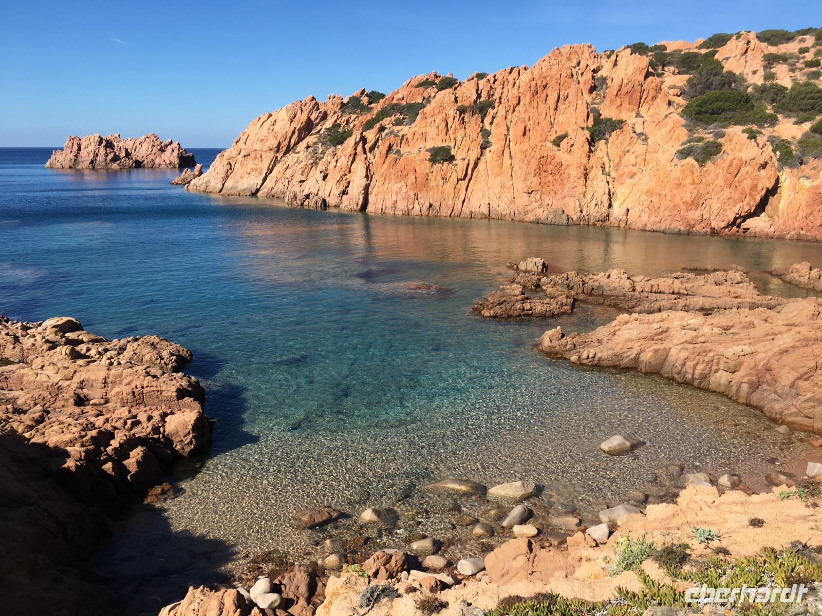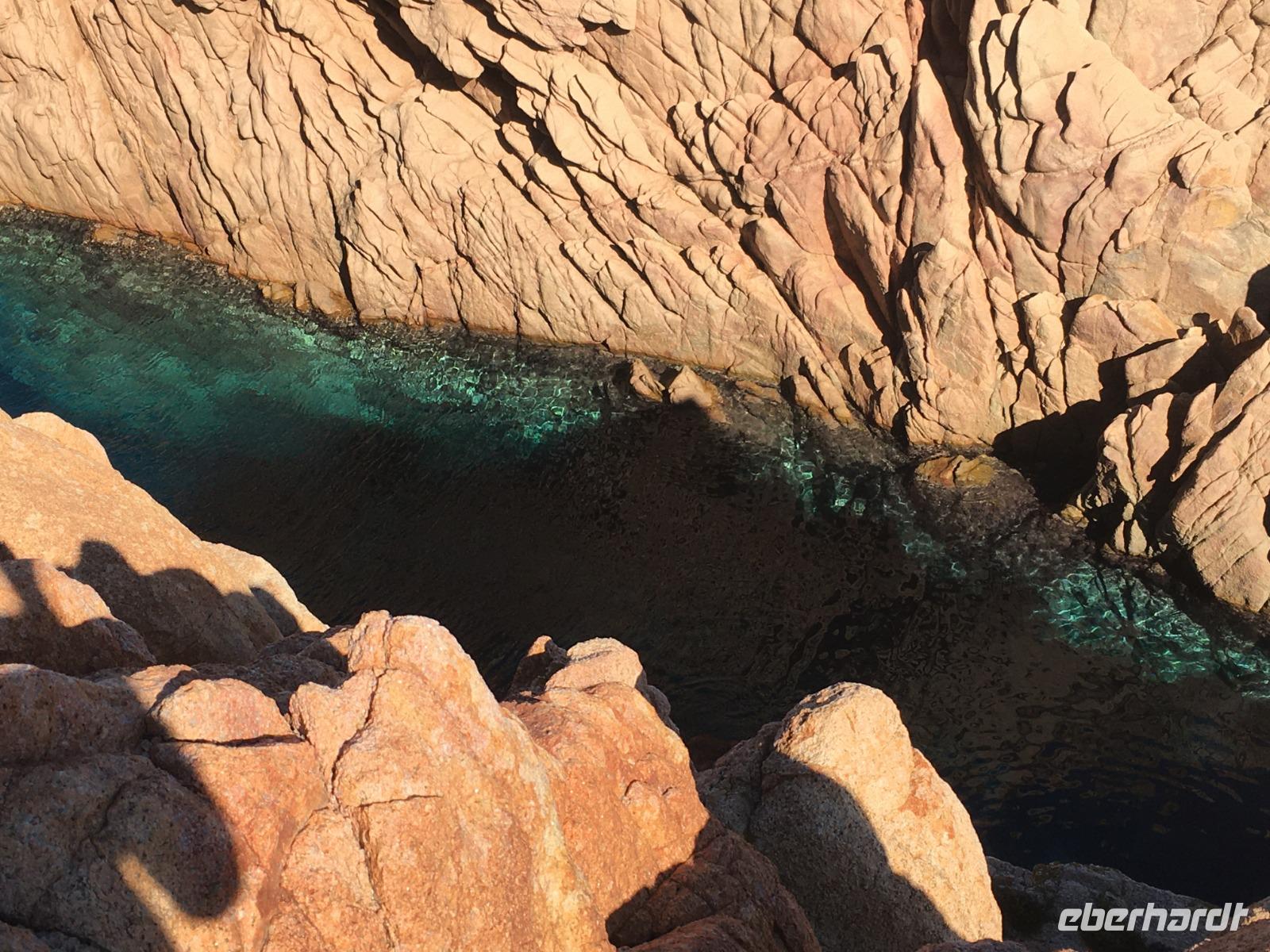 Unsere heutige Wanderung beginnt am herrlichen Strand von Isola Rossa. Während wir durch den Sand laufen, badet schon die erste Gruppe gut gelaunter und weniger gut singender Italiener, die uns begeistert zuwinken. Wir wandern weiter über die Felsen und durch die Dünenlandschaft und lauschen unterwegs den Erklärungen des Reiseleiters. Heute zeigt er uns den besonderen Erdbeerbaum, aus dessen Blüten der bittere Honig Corbezzolo hergestellt wird. Nachdem wir durch einen kleinen Pinienwald gewandert sind, breitet sich vor uns zum ersten Mal das Panorama des Kap Cannedi aus. Hinter den roten Granitfelsen glitzert das blaue Meer und am Horizont ist sogar Korsika zu erkennen. Wir wandern in der höher steigenden Sonne weiter entlang der Küste und bestaunen unterwegs immer wieder die Aussicht auf die Granitfelsen und das kristallklare Wasser in den Buchten unter uns. Über Stock und Stein, über Sandwege und durch die niedrige Maccia geht es weiter, bevor wir auf den Felsen unsere Mittagspause mit Blick auf das Meer verbringen. Auch nach der Mittagspause erwartet uns noch die ein oder andere versteckte Bucht und als wir wieder den Strand von Isola Rossa erreichen, genießen wir den Ausblick auf die Bucht bei einem kühlen Getränk oder mit den Füßen im kühlen Meer. Anschließend fahren wir mit dem Bus weiter in eins der malerischsten sardischen Städtchen, Castelsardo, das hoch oben auf einer Klippe über dem Meer thront. Bei einem Spaziergang durch die Stadt laufen wir durch die mit Kopfstein gepflasterten Gässchen, knipsen mit einer Gruppe Motorradfahrer Fotos auf ihren roten Vespas und bestaunen die gewaltigen Mauern der Festung. Eine kleine Eispause rundet den Besuch in Castelsardo ab und wir begeben uns wieder auf den Heimweg.