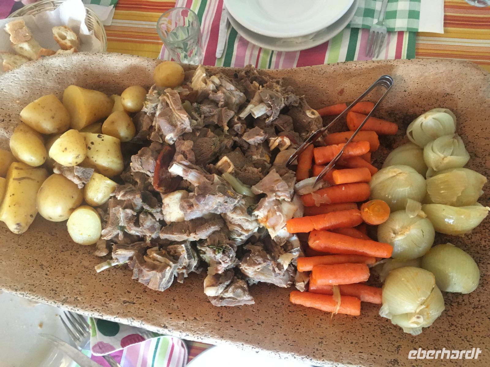 und schon bricht unser vorletzter Tag auf Sardinien an. Morgens frühstücken wir in der Sky Bar des Hotels und genießen den Ausblick auf den Hafen von Alghero, bevor es mit dem Bus in das sardische Hinterland, die Auvergne geht. Zuerst führt uns der Wanderweg an Schweinen, Ziegen- und Schafsherden vorbei und über grüne Wiesen. Nach einer Weile klettern wir über eine Steinmauer und gelangen so in das bergige Hinterland der Auvergne. Die Sonne versteckt sich heute hinter einer Wolkendecke und so lernen wir auch die karge, windige aber dennoch schöne Seite der sardischen Landschaft kennen. Die Sicht reicht bis ins Tal, in dem wir vereinzelt Holzverschläge und Tierherden entdecken. Hier oben sind fast nur die hier lebenden Tierherden unterwegs und immer wieder entdecken wir Spuren und so manche knochige Überreste der Schafe und Rinder. Schließlich führt uns Sergio wieder hinunter ins Tal und wir wandern weiter über die grünen Wiesen, bis wir erneut den Bus erreichen. Wir fahren weiter in Richtung Thiesi und biegen schließlich auf einen steinigen Feldweg ab. Nach der kurvigen Auffahrt erreichen wir ein sardisches Landgut, auf dem wir heute von den hier lebenden Hirten zum Mittagessen erwartet werden. Alles steht schon bereit und so beginnen wir direkt und probieren zuerst die Cagliata, die erste Stufe der Käseherstellung, zusammen mit dem knusprigen Carasau-Brot. Danach wird uns feines sardisches Lamm mit Kartoffen und Möhren serviert - traditionell in großen Korkschalen. Auch ein köstliches Spanferkel lassen wir uns schmecken, bevor die Hirten zwei unserer Mitwanderer in die Küche entführen. Unter großem Gelächter und begleitet von sardischen Klängen tanzen sie kurze Zeit später in sardischer Tracht aus der Küche heraus und schenken uns Grappa und den Mirto-Likör ein. Auch eine Runde des traditionellen Tanzes darf nicht fehlen. Gut gelaunt steigen wir wieder in den Bus und fahren ein letztes Mal zurück nach Alghero. Unterwegs legen wir noch einen kurzen Stopp ein und fotografieren die herrliche Aussicht auf das Land, die Küste und Alghero am Horizont. In Alghero angekommen, verabschieden wir uns schließlich von Sergio, der uns in der letzten Woche mit seiner Heimatliebe angesteckt, mit seinem großen Wissen beeindruckt und mit seinem schwarzen Humor zum Lachen gebracht hat. Den letzten Abend lassen wir in einer der Bars oder am Hafen ausklingen.
