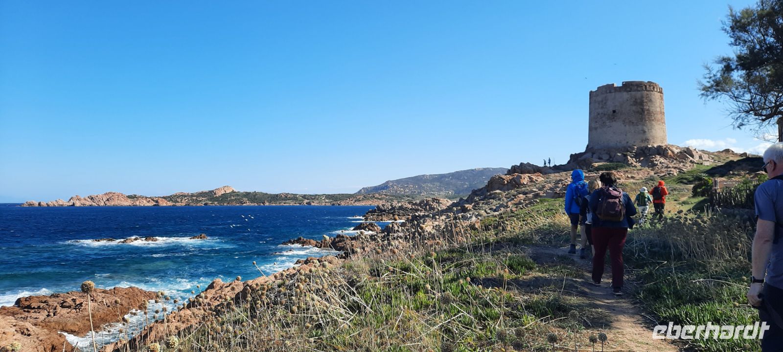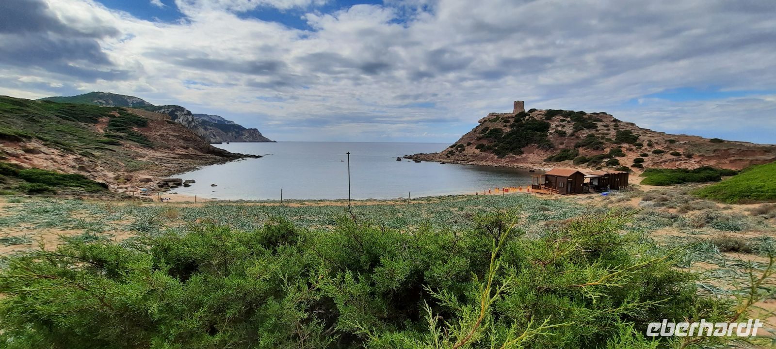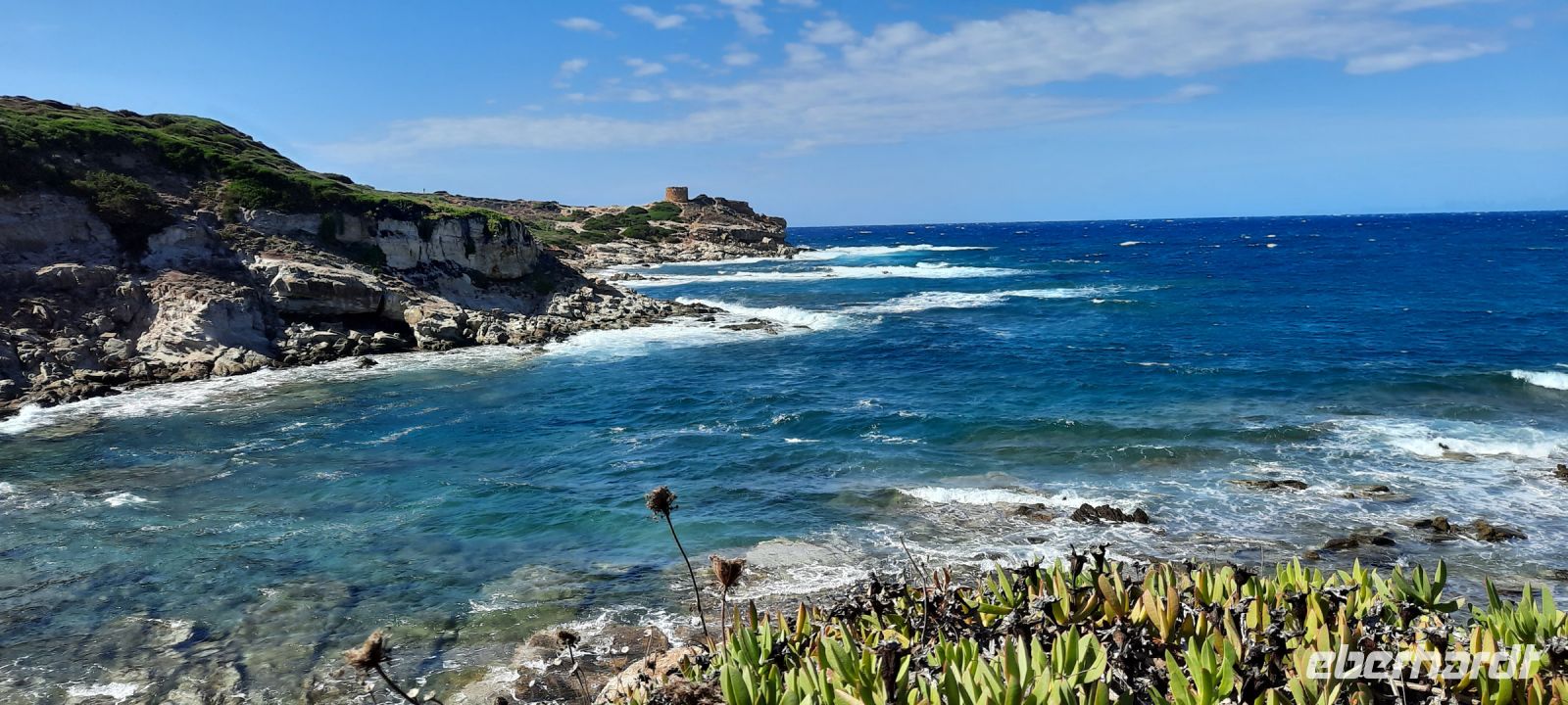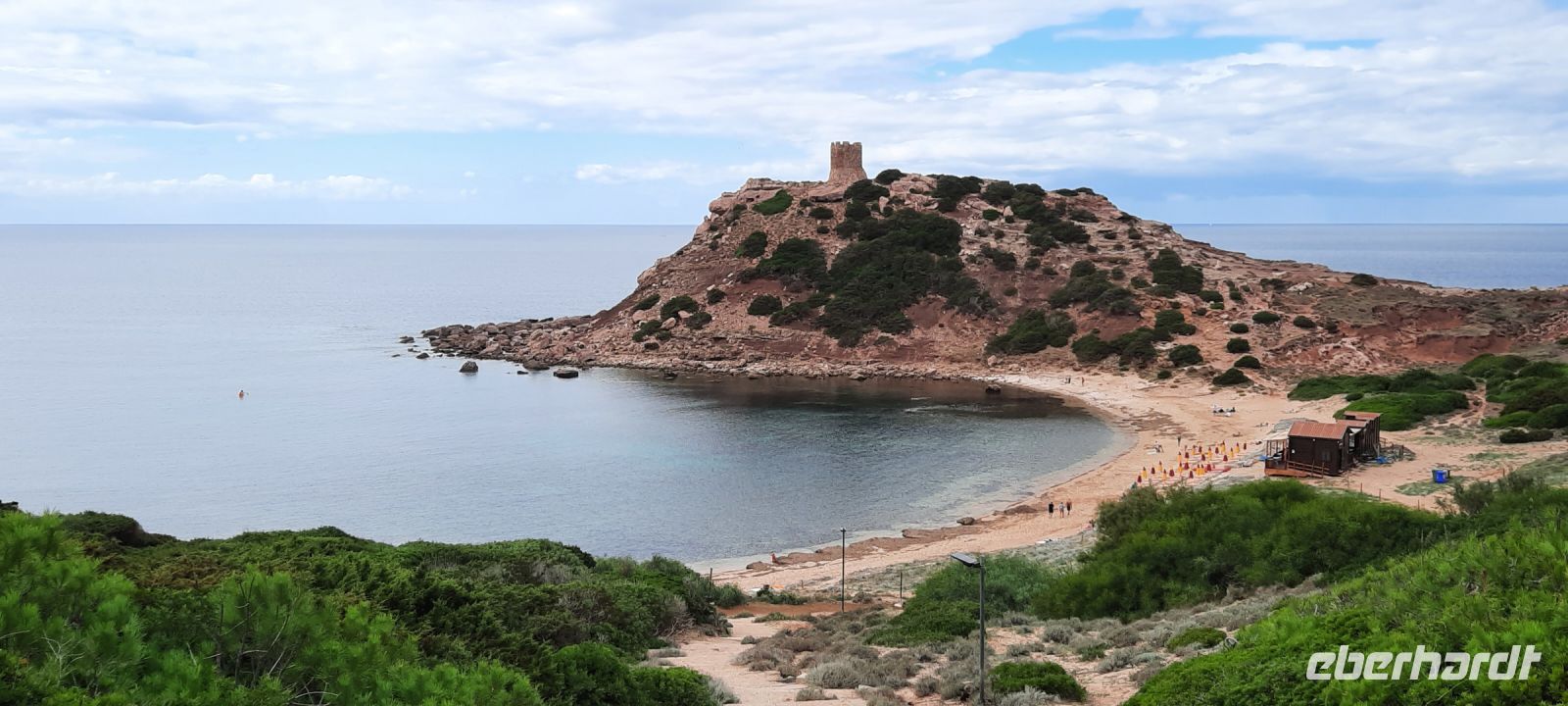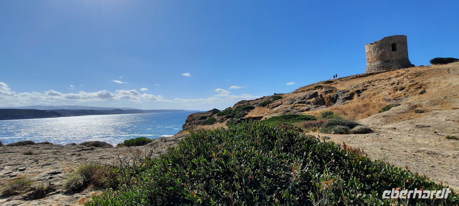 Der besondere Reiz Sardiniens liegt in den idyllischen Küstenabschnitten, die ca. 1.800 km lang sind. Nur einen Bruchteil konnten wir hautnah spüren in der Nordwest Region Sardiniens. Los ging es bei Porto Ferro / Caia di Fora immer an der Küste entlang. Durch den Wind war hier die Macchia etwas niedriger. An der Cala del Vino, folgte unsere Picknick Pause, angerichtet in einem Holzboot. Der Rot- oder Weißwein schmeckte mit Blick auf das azurblaue Wasser noch besser. Es folgte ein ständiges auf- un ab, bis zum Turm - La torre del Porticciolo. Dieser Turm fügte sich umwerfend in die Bucht.