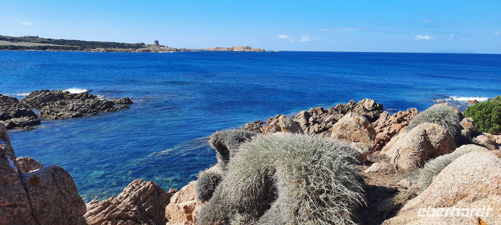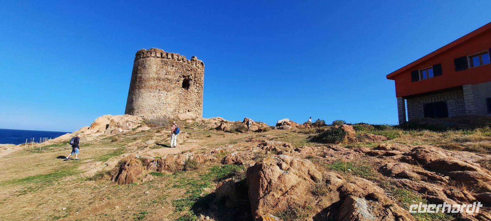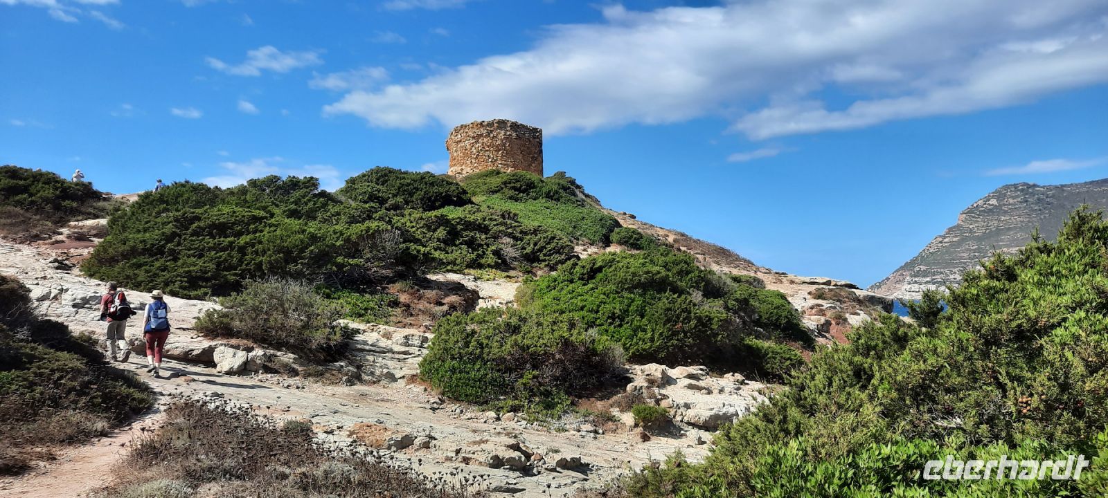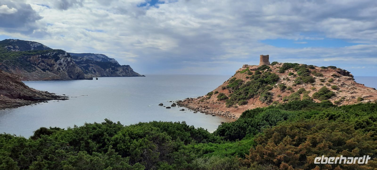 Der besondere Reiz Sardiniens liegt in den idyllischen Küstenabschnitten, die ca. 1.800 km lang sind. Nur einen Bruchteil konnten wir hautnah spüren in der Nordwest Region Sardiniens. Los ging es bei Porto Ferro / Caia di Fora immer an der Küste entlang. Durch den Wind war hier die Macchia etwas niedriger. An der Cala del Vino, folgte unsere Picknick Pause, angerichtet in einem Holzboot. Der Rot- oder Weißwein schmeckte mit Blick auf das azurblaue Wasser noch besser. Es folgte ein ständiges auf- un ab, bis zum Turm - La torre del Porticciolo. Dieser Turm fügte sich umwerfend in die Bucht.