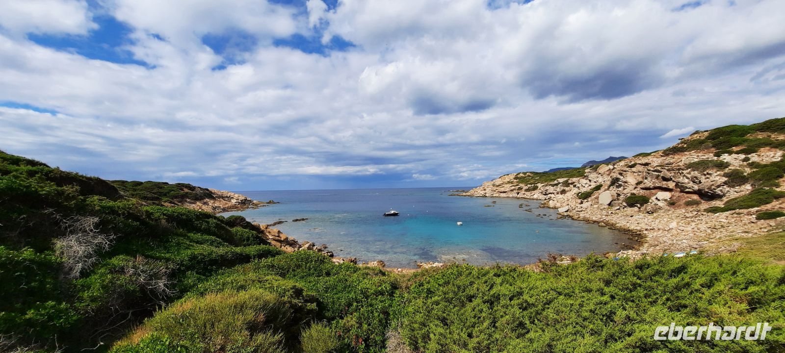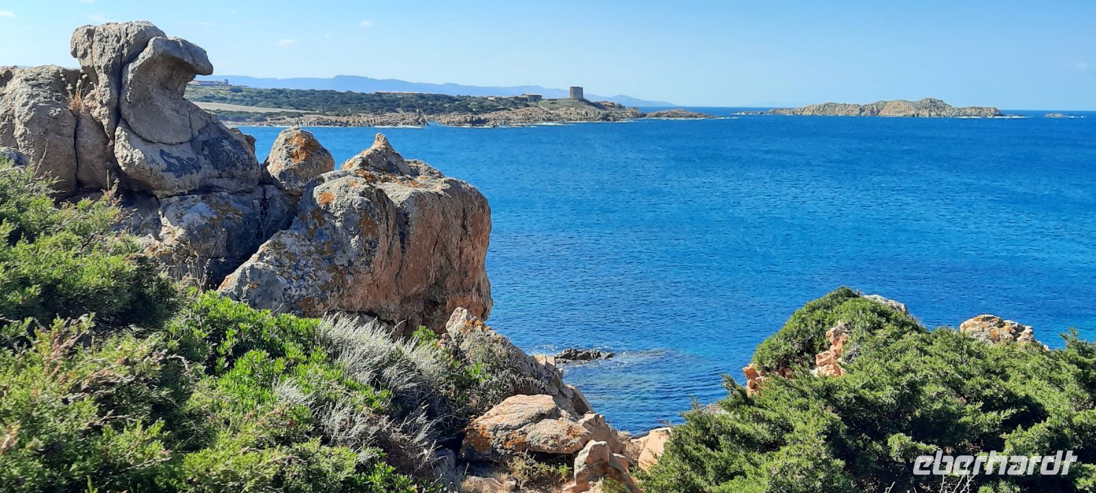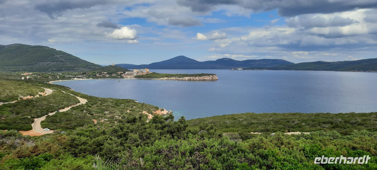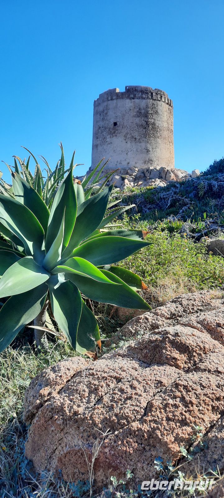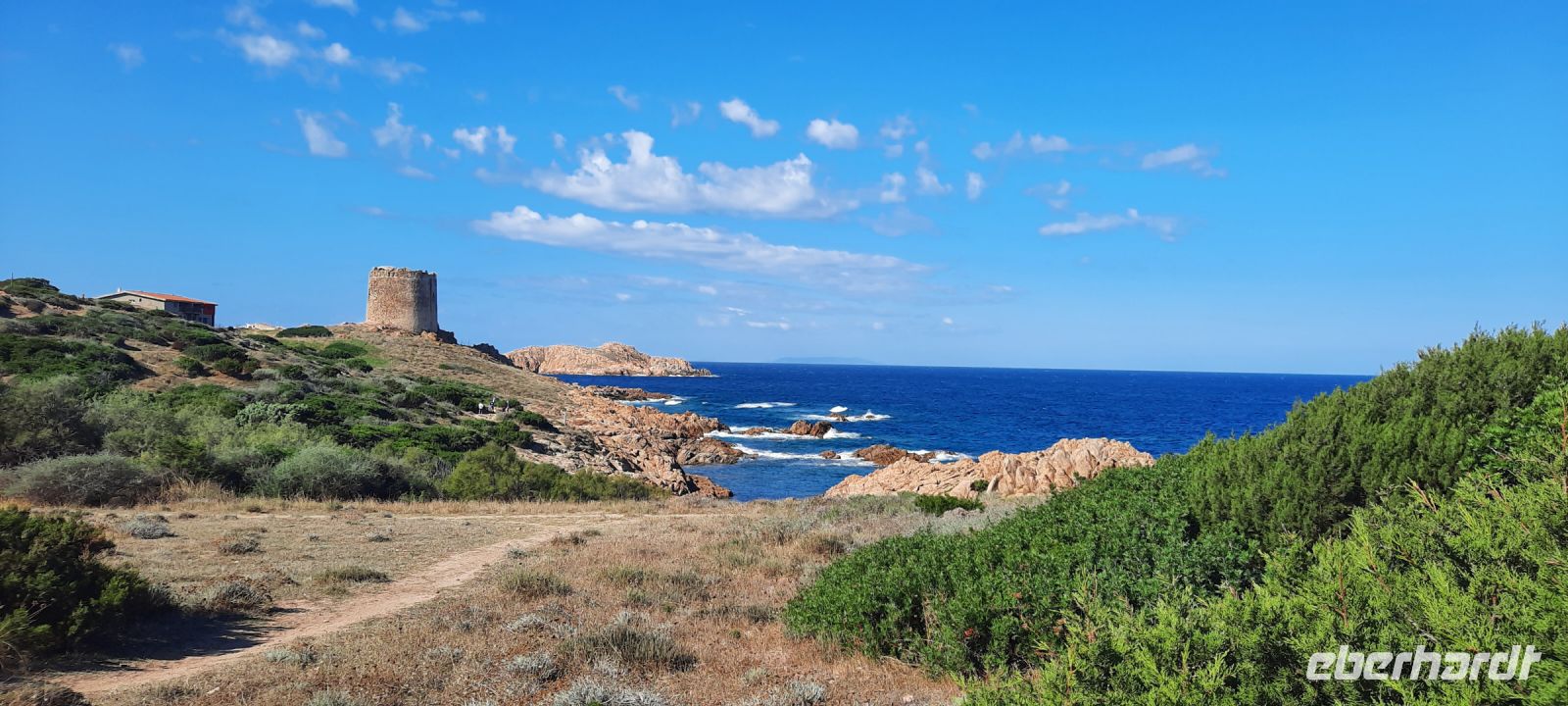 Der besondere Reiz Sardiniens liegt in den idyllischen Küstenabschnitten, die ca. 1.800 km lang sind. Nur einen Bruchteil konnten wir hautnah spüren in der Nordwest Region Sardiniens. Los ging es bei Porto Ferro / Caia di Fora immer an der Küste entlang. Durch den Wind war hier die Macchia etwas niedriger. An der Cala del Vino, folgte unsere Picknick Pause, angerichtet in einem Holzboot. Der Rot- oder Weißwein schmeckte mit Blick auf das azurblaue Wasser noch besser. Es folgte ein ständiges auf- un ab, bis zum Turm - La torre del Porticciolo. Dieser Turm fügte sich umwerfend in die Bucht.