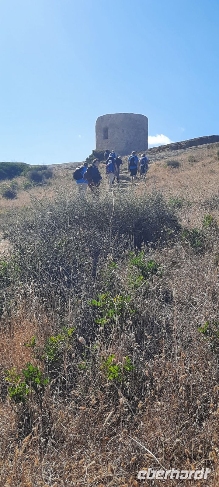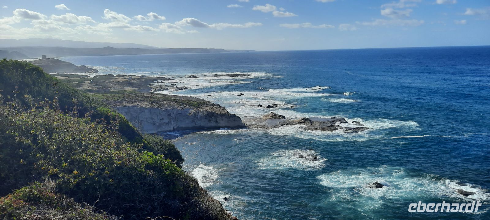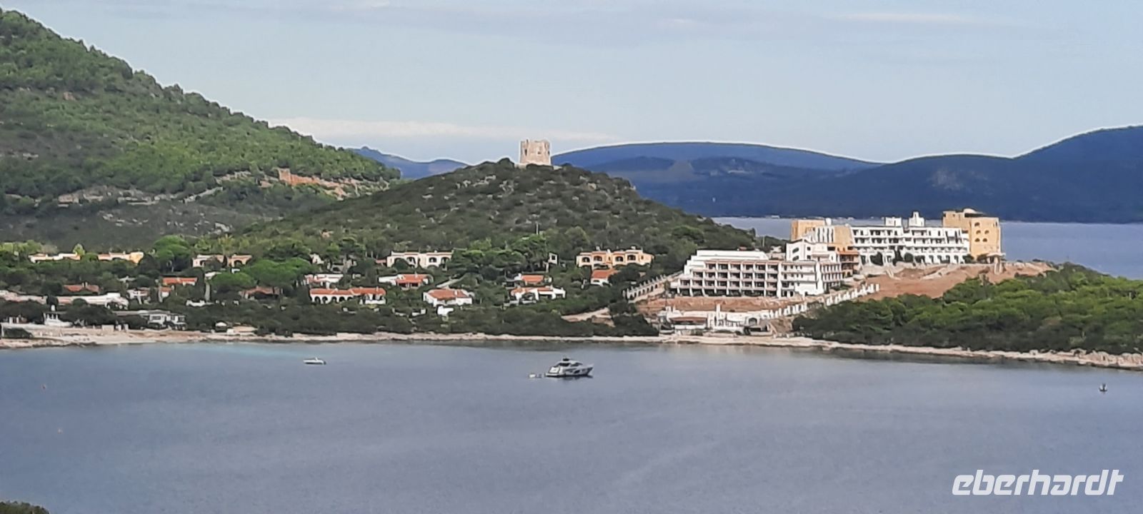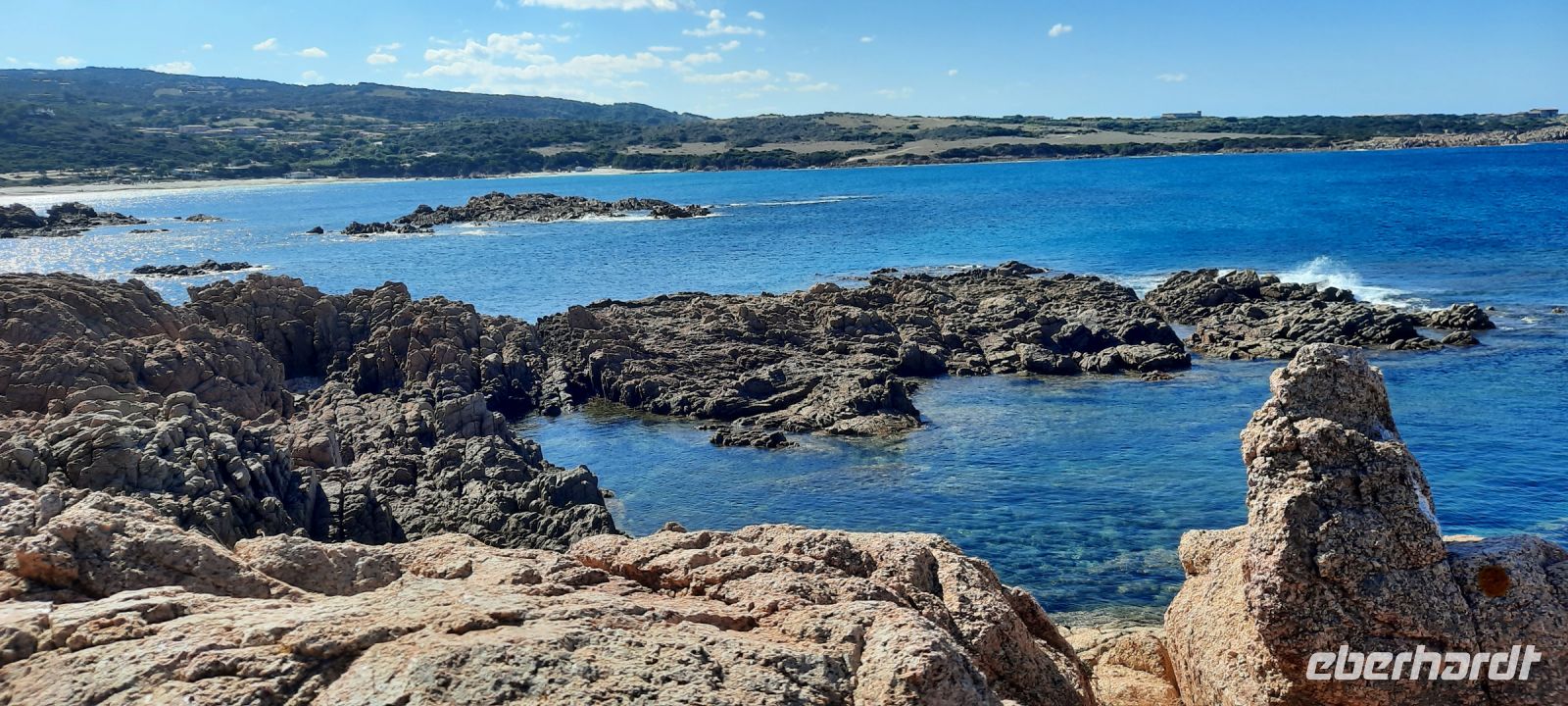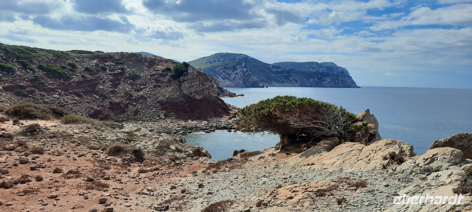 Der besondere Reiz Sardiniens liegt in den idyllischen Küstenabschnitten, die ca. 1.800 km lang sind. Nur einen Bruchteil konnten wir hautnah spüren in der Nordwest Region Sardiniens. Los ging es bei Porto Ferro / Caia di Fora immer an der Küste entlang. Durch den Wind war hier die Macchia etwas niedriger. An der Cala del Vino, folgte unsere Picknick Pause, angerichtet in einem Holzboot. Der Rot- oder Weißwein schmeckte mit Blick auf das azurblaue Wasser noch besser. Es folgte ein ständiges auf- un ab, bis zum Turm - La torre del Porticciolo. Dieser Turm fügte sich umwerfend in die Bucht.