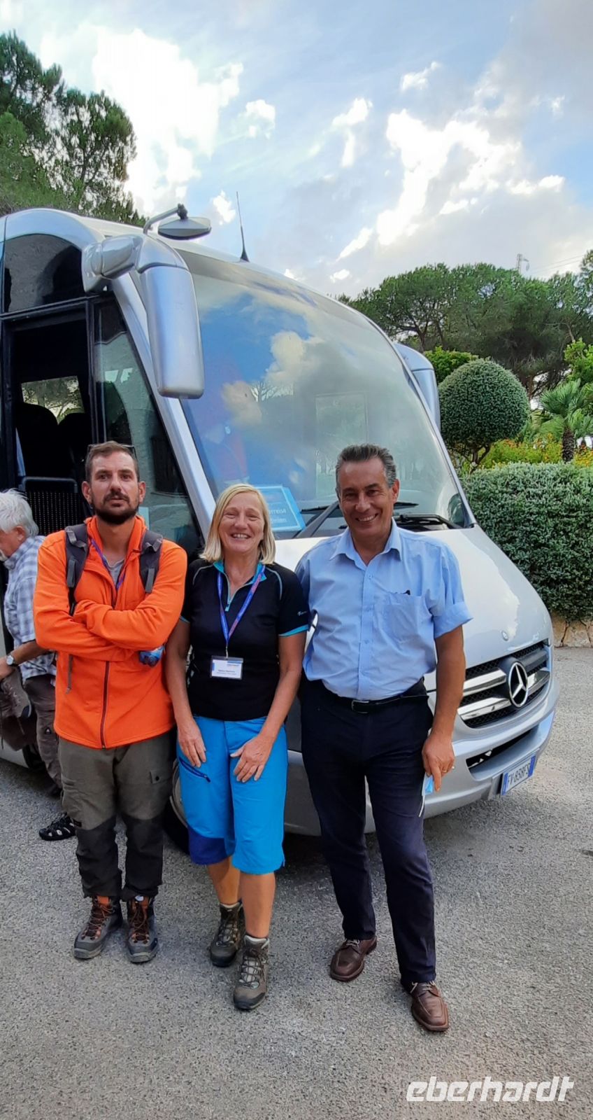 Nach dem Frühstück lernten wir unseren sympathischen Wanderführer Antonio kennen. Zu unserer ersten Wanderung fuhr uns der Busfahrer Salvatore nach Alghero. In Richtung Süden fuhren wir auf der außergewöhnlich schönen Küstenstraße bis zu unserem Beginn der Wanderung in Sa Mesa de S’attentu. Der Küstenweg erforderte schon eine gewisse Aufmerksamkeit und Trittsicherheit, denn ständig ging es auf und ab von Bucht zu Bucht. Die unterschiedlichsten Felsformationen an der Vulkanküste prägten ein majestätisches Bild mit verschiedenen blau- türkis- und grün Tönen vom Meer. Am Turm Badde Lana, der von den Genuesen im 15./16. Jh. errichtet wurde, folgte unsere Trinkpause mit fantastischer Aussicht. Die Sonne schien extrem, keine Wolke am Himmel, es war sehr anstrengend und kein Schatten. Ein Badestopp in einer idyllischen Bucht kam gerade recht. Nach der Abkühlung ging es durch die Maccia 140 Höhenmeter stetig bergauf zur Straße, wo wir unseren Bus erreichten. Das war eine Anstrengung, die uns die eine oder andere Schweißperle auf die Stirn zauberte.