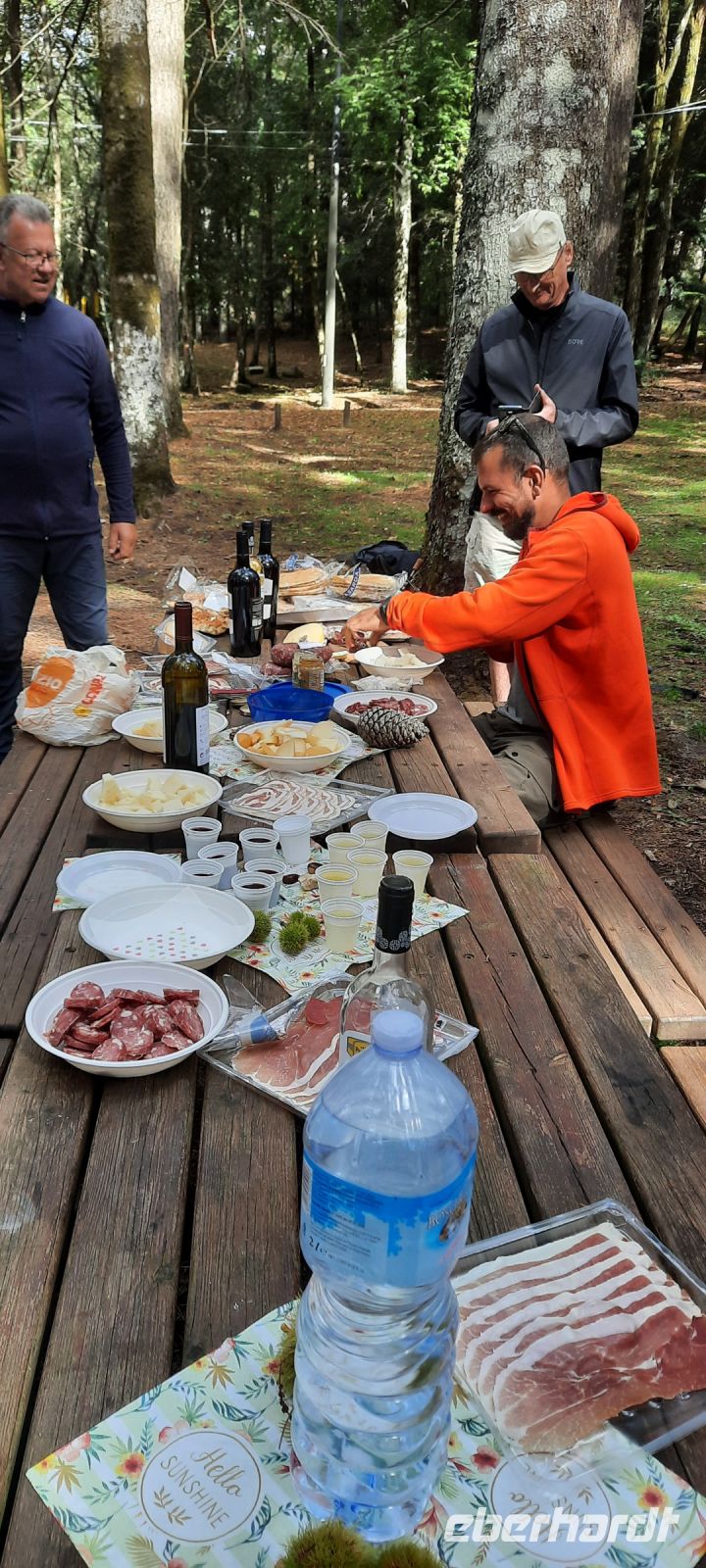 Unser Ziel war die dünn besiedelte Gallura, eine Granit Region in der Provinz Sassari. Korkeichenwälder und die Mittelmeer Macchia prägten das Bild der Landschaft. Am Fuß des Monte Limbara startete unsere Tour ab Vallicciola 1.057 m. Durch dichten Nadelwald schlängelte sich unser Weg zum Punkt Oltu di li Pomi auf 995 m. Farne und Steineichen säumten den Wanderweg. Anmutig und ruhig war es auf dieser Tour, kaum Wanderer begegneten uns. Am Aussichtspunkt angekommen, war die Landschaft phänomenal. Der Blick reichte weit über Nordsardinien, bis Korsika. Die nächst liegenden Ortschaften waren gut zu erkennen. Die Hänge des Monte Limbara Massives sind fast bis zum Gipfel mit Kastanien, Pinien, Tannen und Kiefern bewachsen. Die Wegkreuzung Caccaeddu 1.059 m erreichten wir nach ca. 2 Stunden. Gewaltige Granitformationen fügten sich harmonisch in die Landschaft. Ein gut ausgeschilderter Waldweg führte uns schließlich zurück zum Ausgangspunkt nach Vallicciola. Überraschender Weise hatte Antonio für unser Picknick an alles gedacht. Im Wald schmeckten uns die sardischen Köstlichkeiten besonders: Salami, Schinken, Oliven, verschiedene Käsesorten und frisches Brot. Natürlich durfte Rot- und Weißwein nicht fehlen, der passte hervorragend zum Käse. Es war einfach köstlich! Im weiteren Verlauf des Tages folgte die Besichtigung von Tempio - Pausania, es ist das historische und geographische Zentrum der Gallura. Wir durchquerten die Altstadt mit den grandiosen Granit Fassaden. Ca. 13.000 Einwohner hat die Stadt und ist Bischofs- und Gerichtssitz.