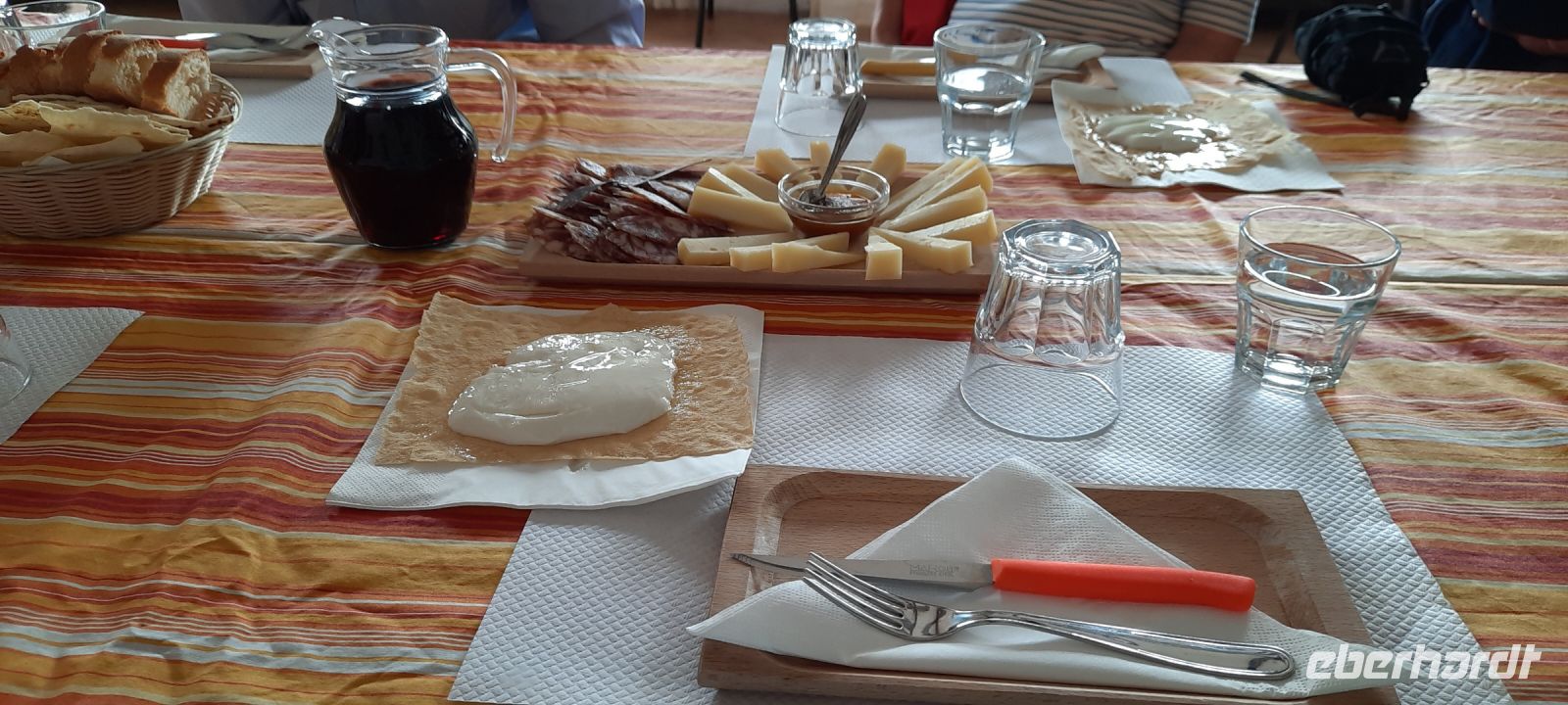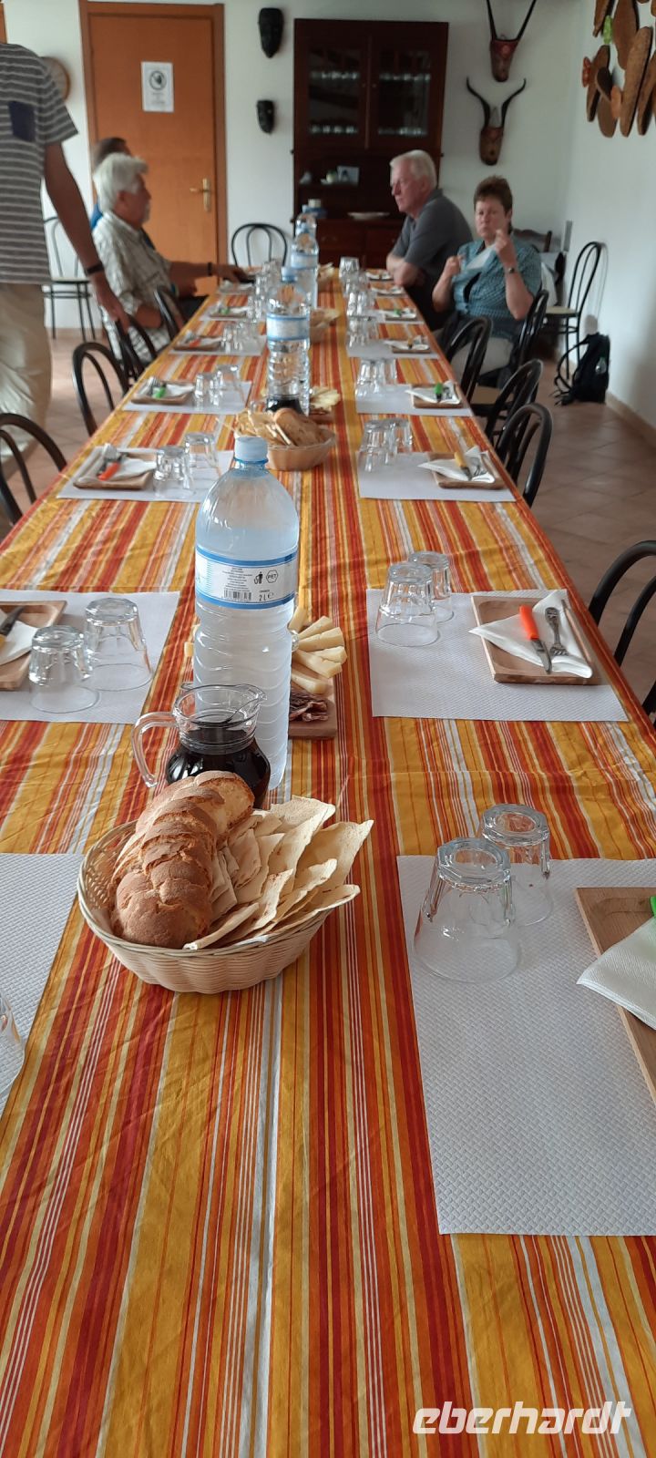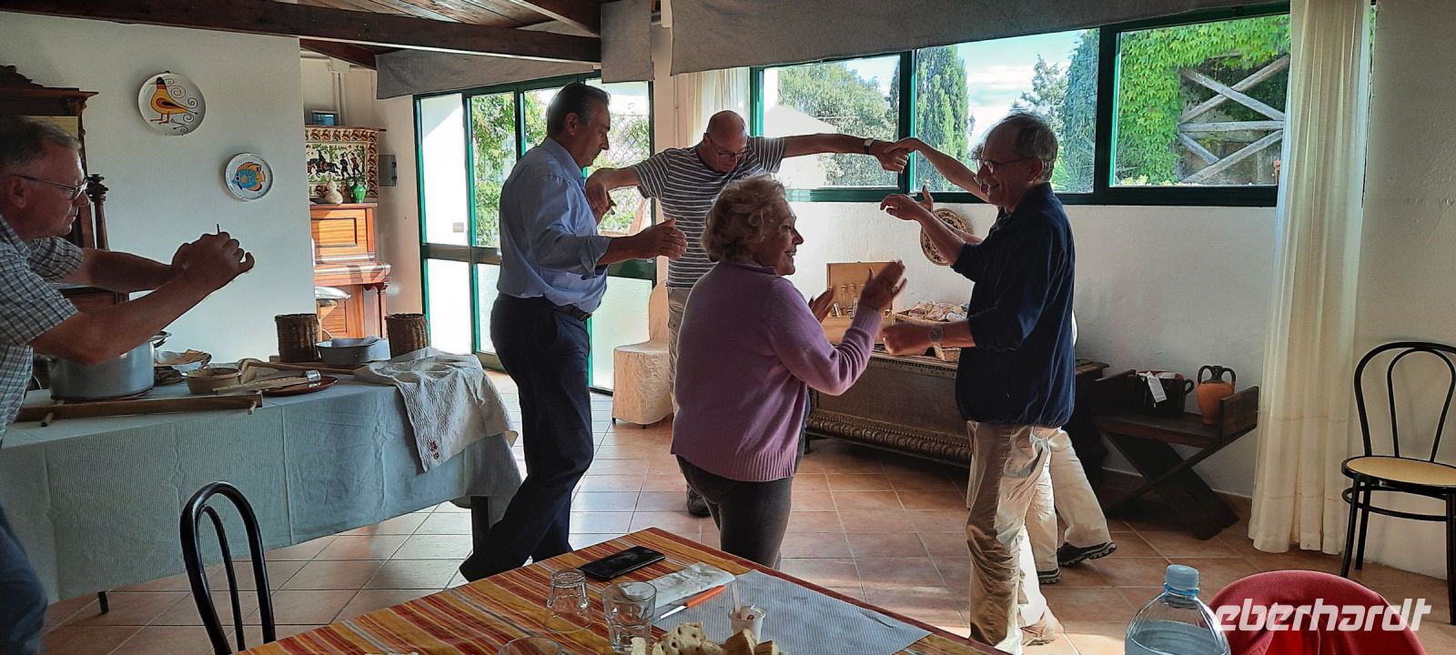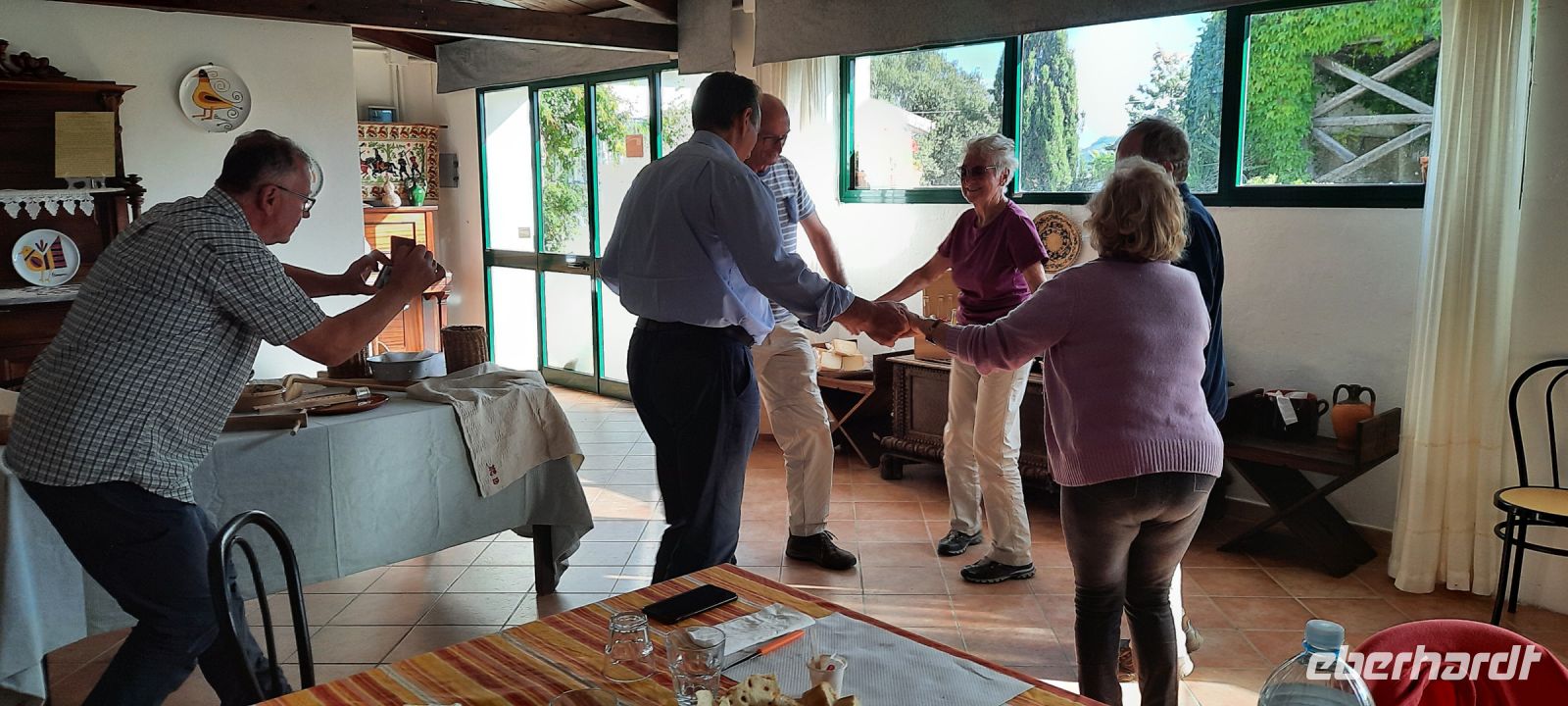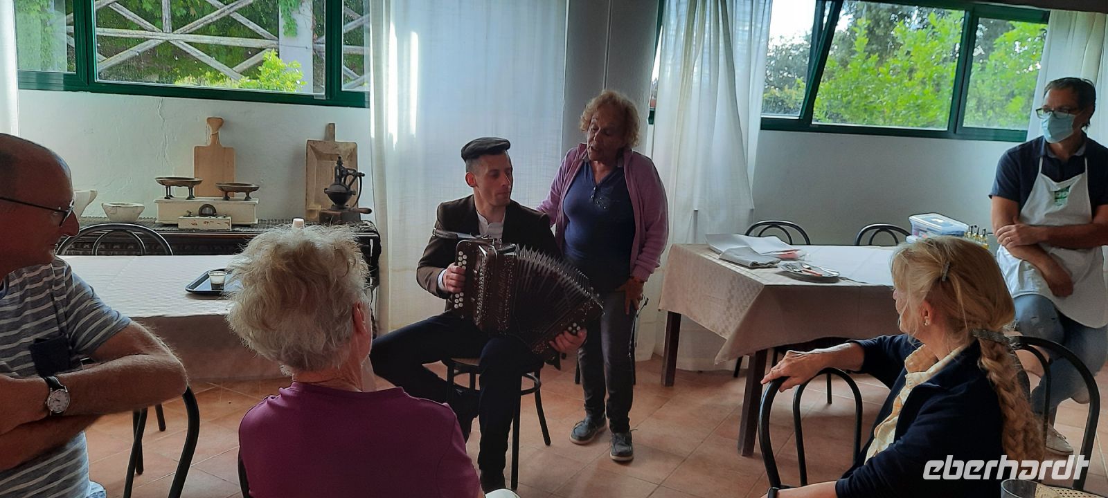 Unser nächstes Ziel war die sardischen Auvergne zwischen Thiesi und Ittiri. Es vermittelte uns einen tiefen Einblick ins ländliche, bescheidene Leben der Bauern. Ittiri liegt nur 15 km südlich von Sassari. Kleine Bauernhöfe prägten das Landschaftsbild mit Schafen, Ziegen und Kühen. Viele Steineichen säumten unseren Weg, bis wir ein Kalksteinplateau umrundeten. Dort imponierten uns große ausgewaschene Steinhöhlen. Ein kleiner Abstieg führte uns zur Landstraße zurück, wo unser Bus mit Salvatore auf uns wartete. Unmittelbar danach führte eine immer steiler werdende Straße zum Agriturismo sa Tanca de Santu Ainzu in der Nähe von Thiesi. Ein beschaulicher Bauernhof erwartete uns. Wir wurden sehr gastfreundlich mit sardischen Köstlichkeiten verwöhnt. Lammfleisch - gegrilltes Spanferkel und Gemüse mit Beilagen gab es in Hülle- und Fülle. Nach Belieben wurde Rot- oder Weißwein gereicht. Ein Musiker sorgte für musikalische Unterhaltung. Es entstand eine harmonische Stimmung von der sich keiner so schnell trennen wollte. Vergnügt und temperamentvoll war es ein stilvoller Höhepunkt von der sardischen Auvergne.