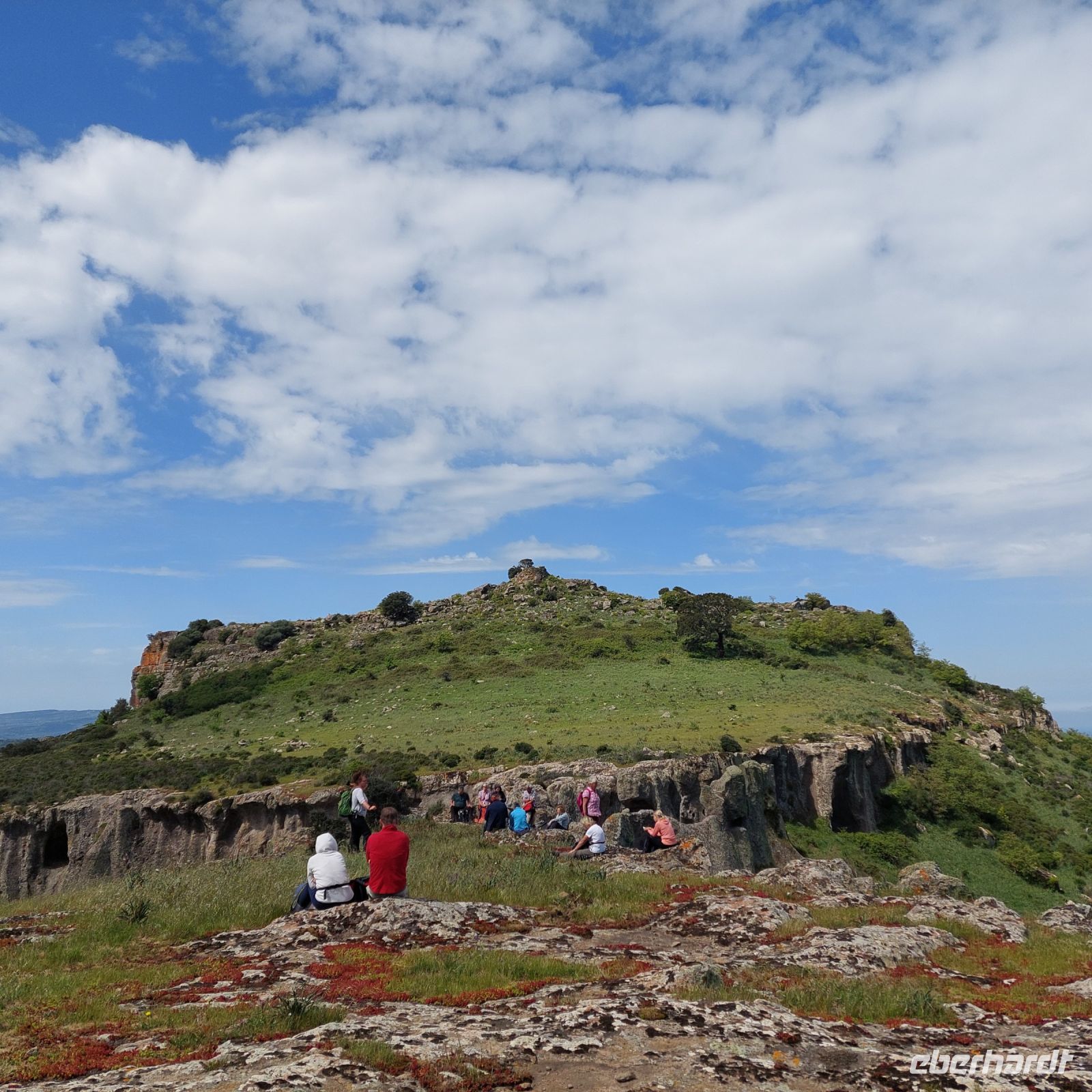 Wir sehen einige Nuragen, verschiedene Felsformationen und Grotten, die früher von den Hirten genutzt wurden. Bei Vallicciola in ca. 1050 Meter Höhe beginnt unsere 3 stündige Wanderung. Wir bewundern die reiche grüne Vegetation mit Erdbeerbäumen, Mirte, Ginster, Steinkraut und Korkeichen zwischen den Felsformationen, sowie Alpenveilchen mitten in der Natur. Wir genießen die Ausblicke in das grüne Hinterland bis zum Monte Limbara mit 1362 Metern Höhe, der 3 höchste Berg der Insel, der im Winter schon mal eine schneebedeckte Spitze haben kann.
