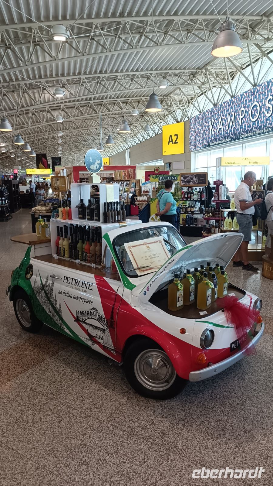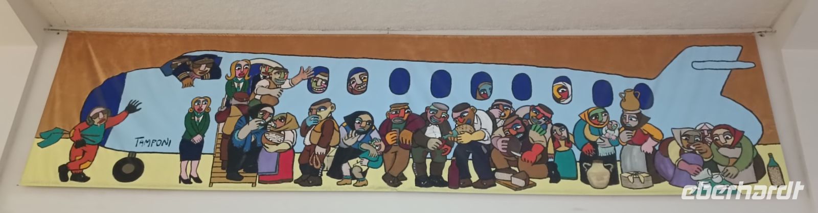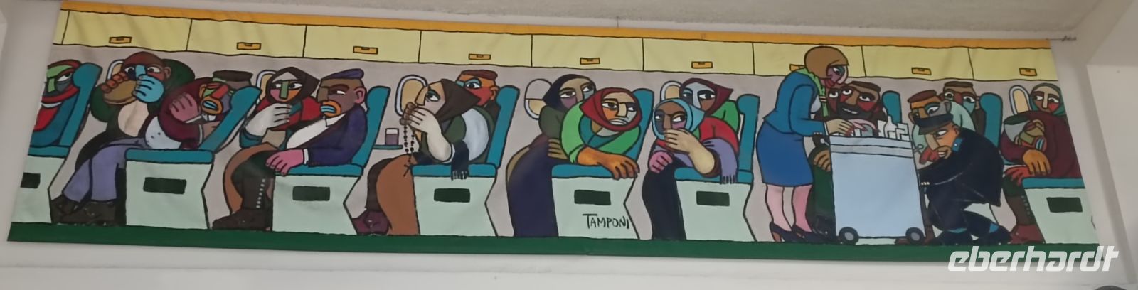 Ich saß fast alleine im Ankunftsbereich mit meinem Eberhardtanhänger um den Hals und wartete auf 2 Gäste, die mit mir hätten landen müssen. Man kannte sich ja vorher nicht, und so stellte ich mich gut sichtbar in den Warteraum. Aber irgendwie war da niemand mehr.
