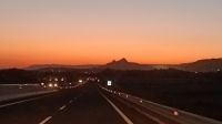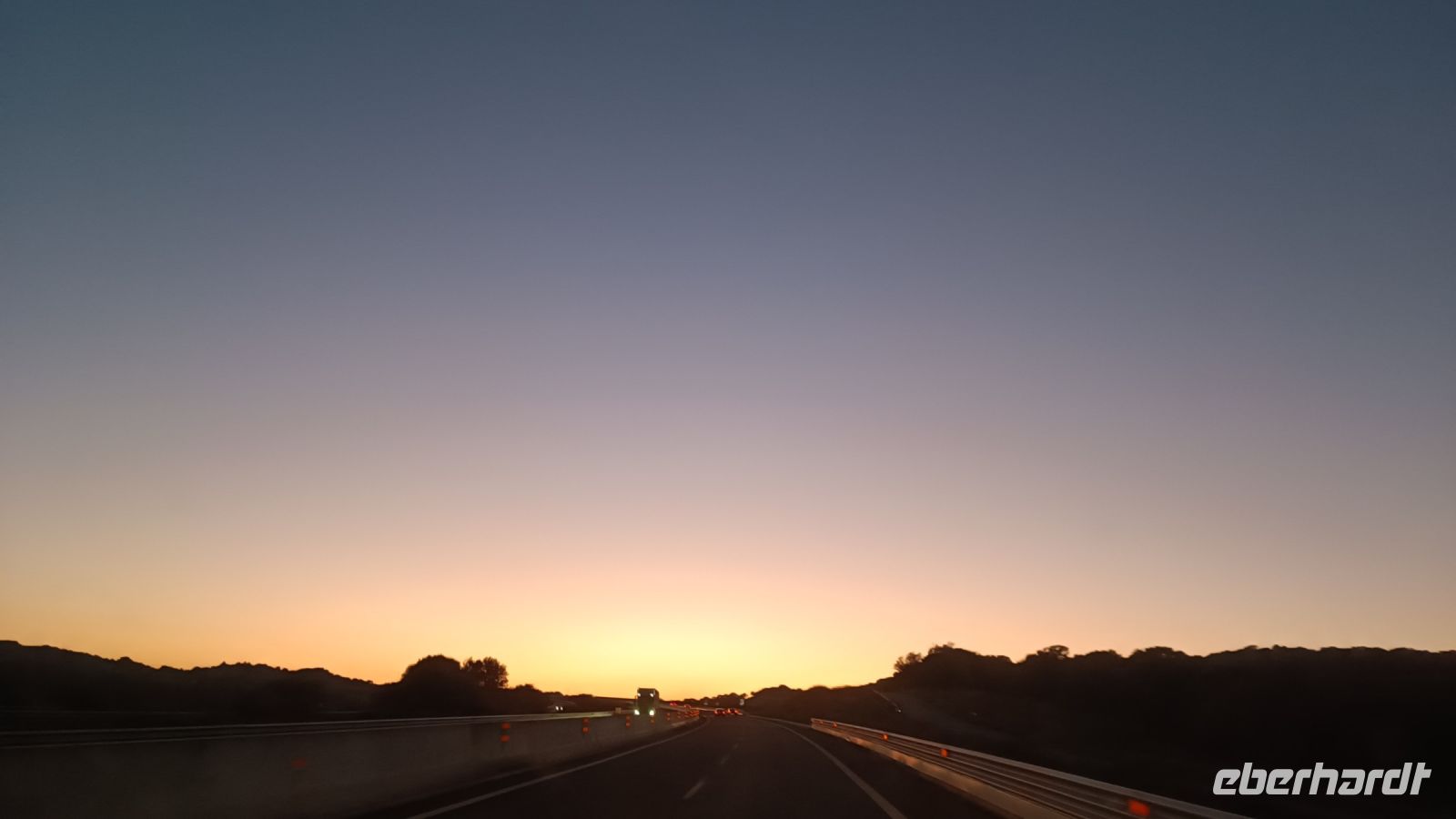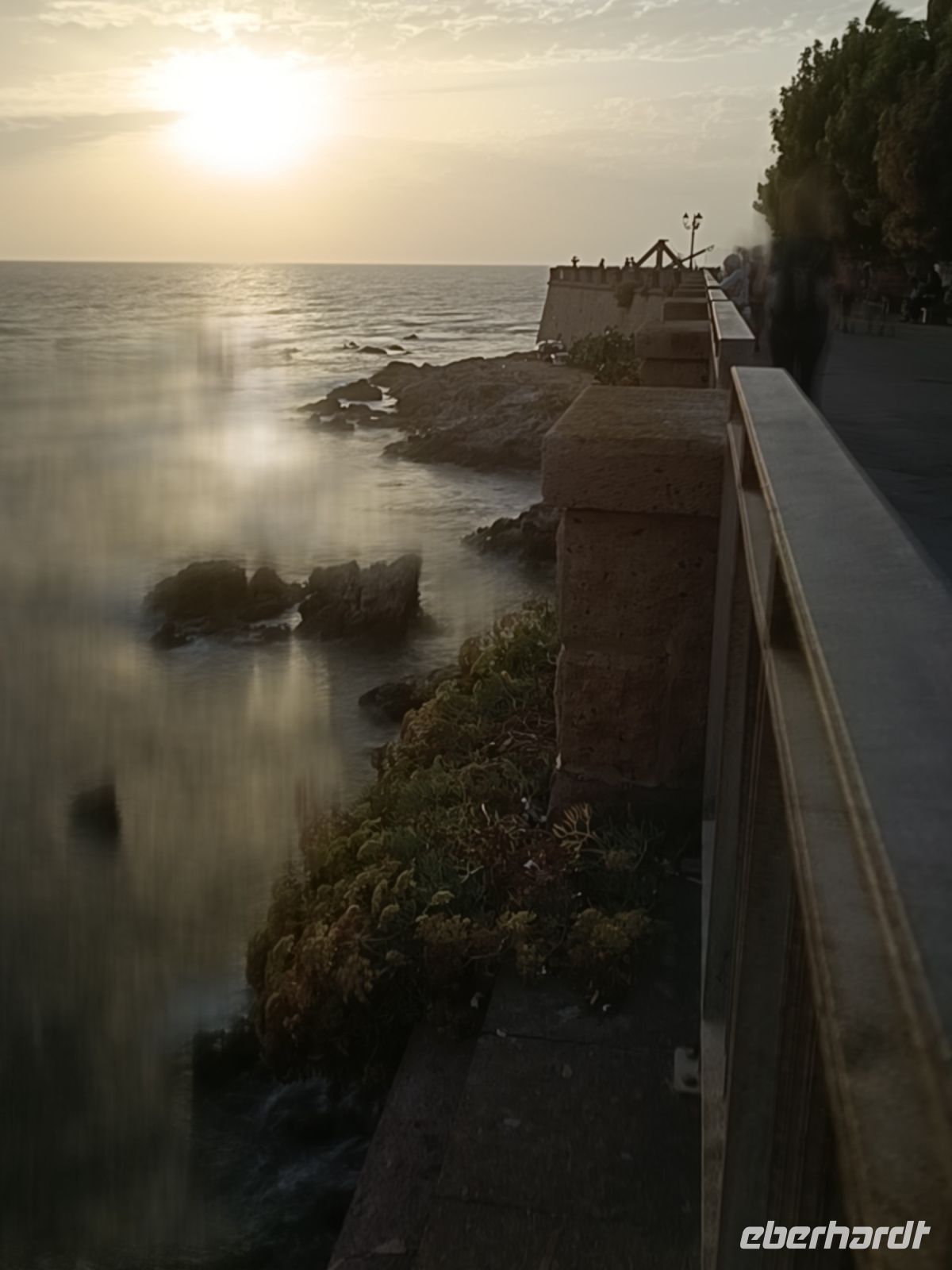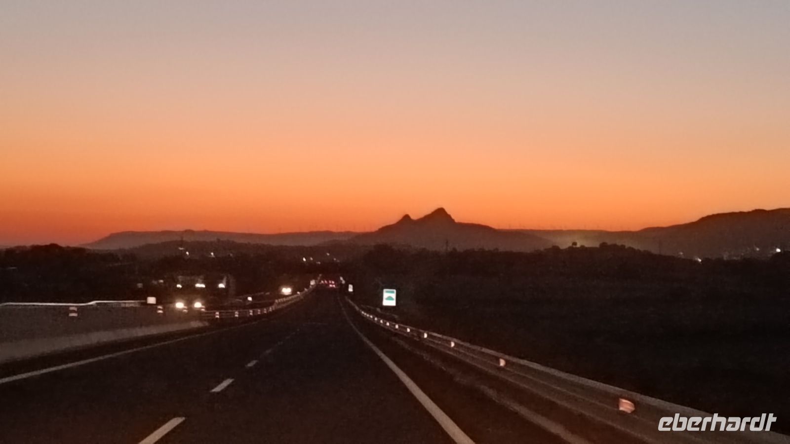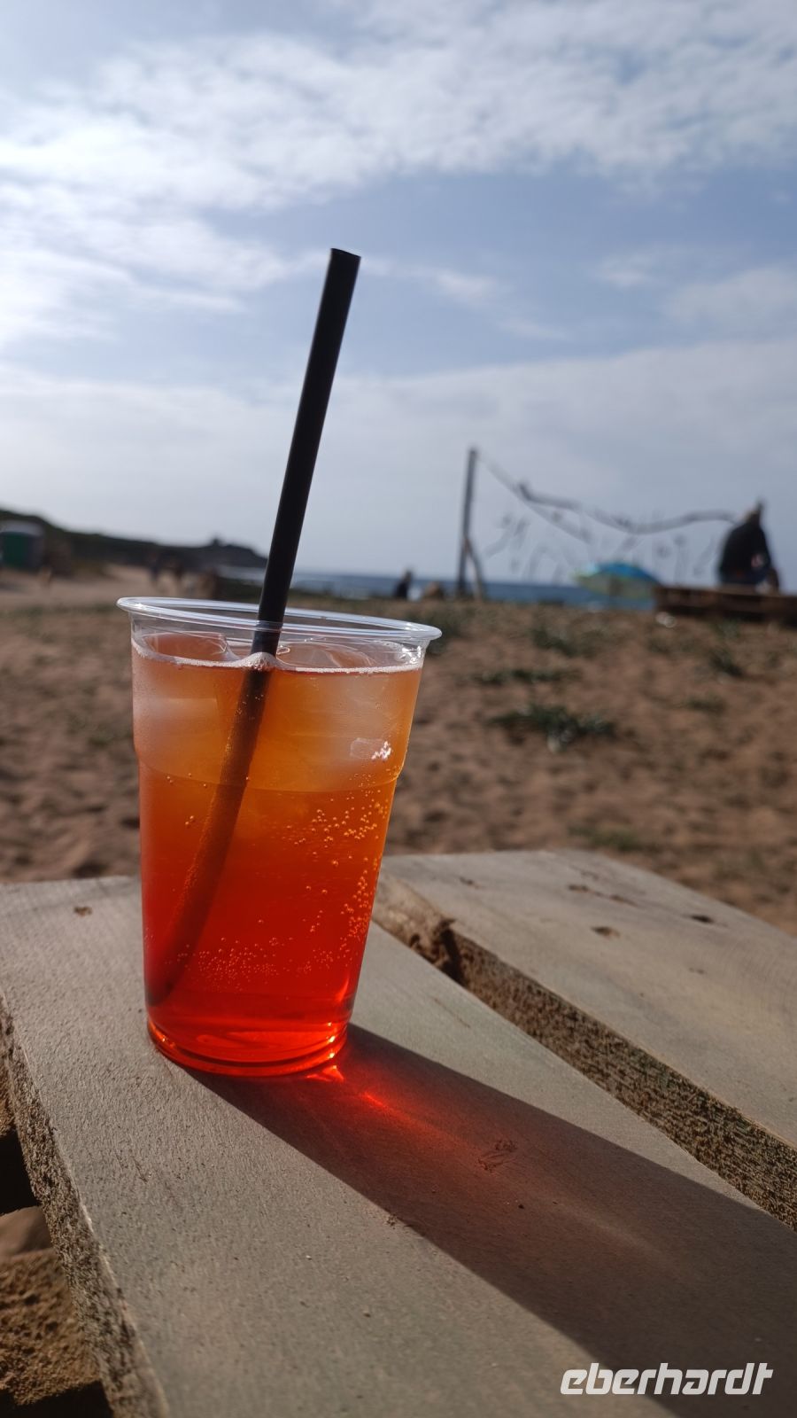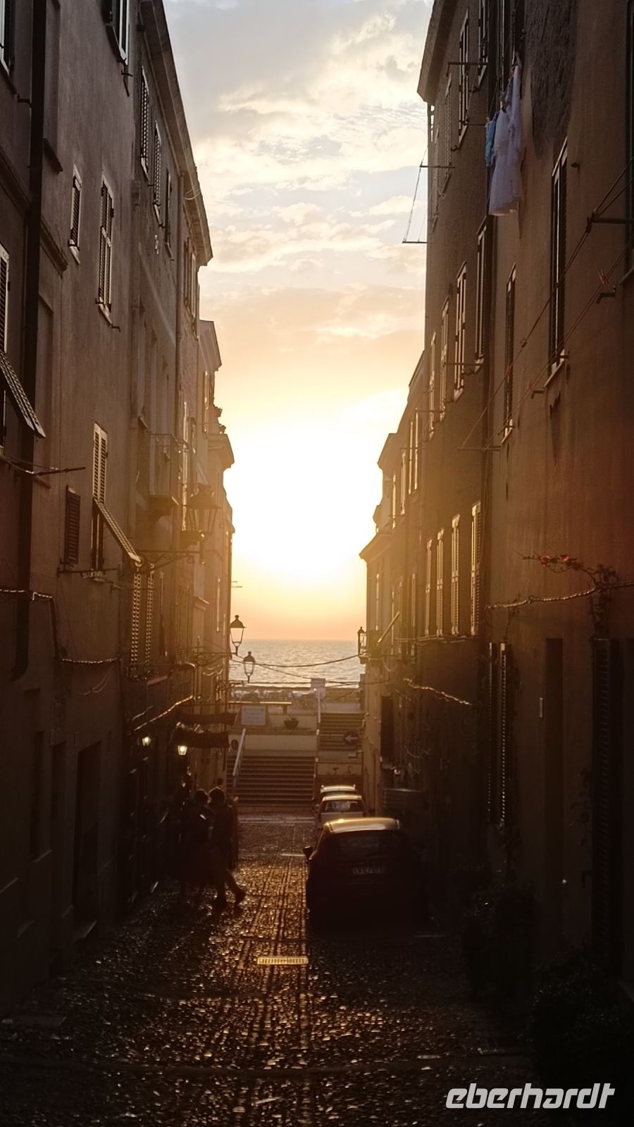 Jetzt hieß es aber Gas geben. Salvatore ließ seinen Bus über den dunklen Asphalt in die untergehende Sonne Sardiniens fliegen. Golden versank die Sonne hinterm Cappo Caccia. Lapin Kulta auf sardisch.