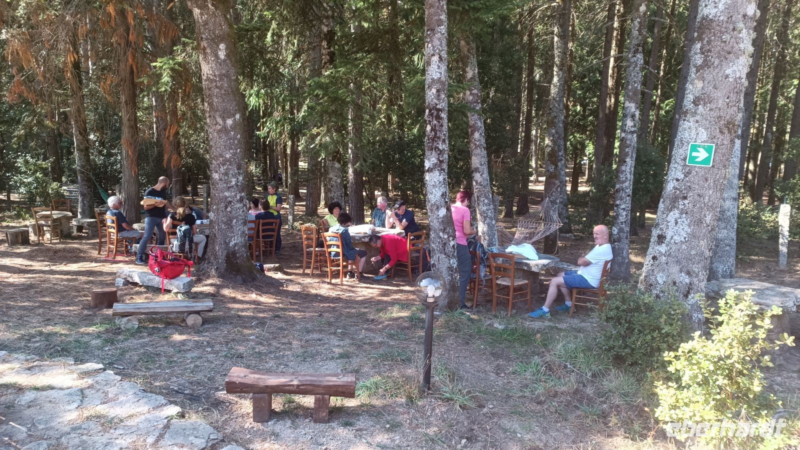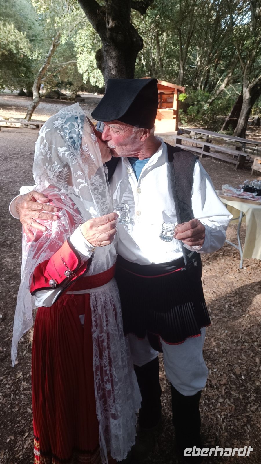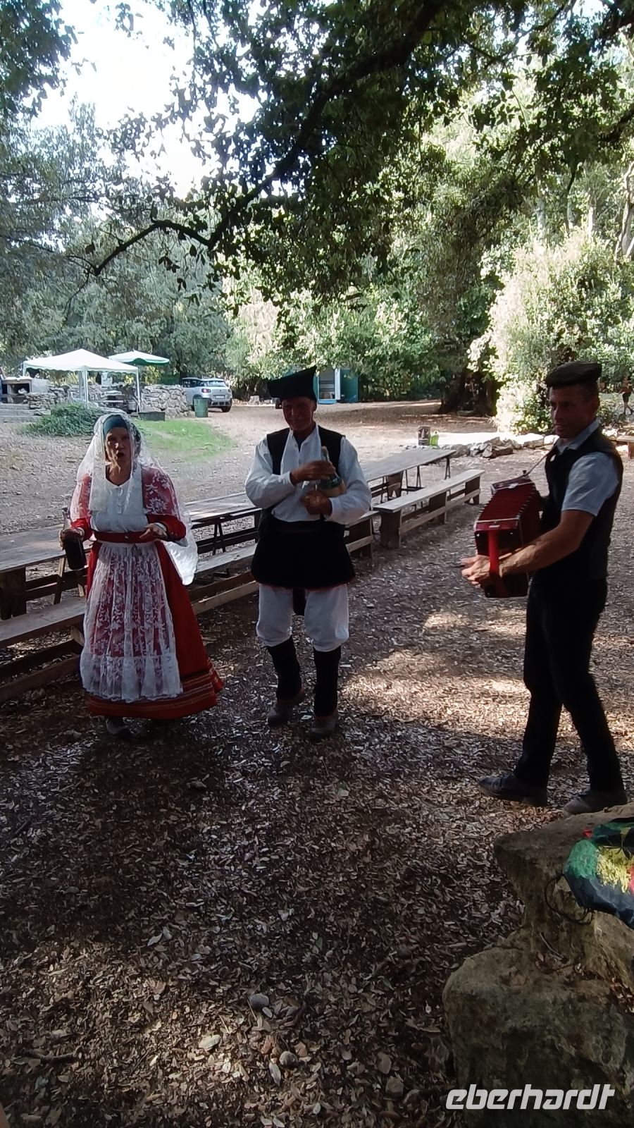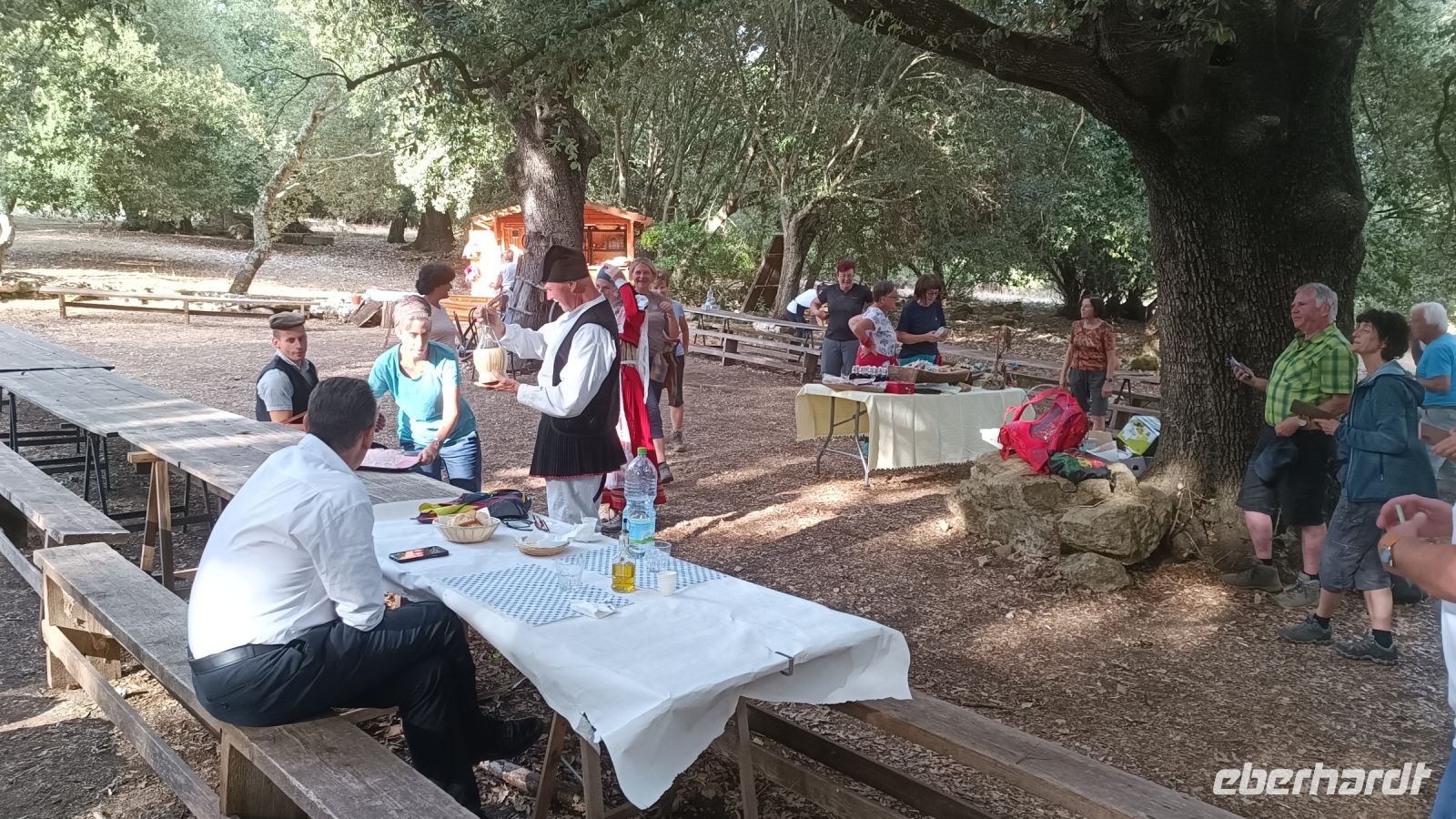 Der landestypische Rotwein stand in Krügen auf den Tischen neben dem Quellwasser aus Tempio. Teilweise saß man auf Steinbänken und genoß im kühlenden Schatten der Pinienbäume ein grandioses Picknick mit den heimischen Spezialitäten und den Aromen der Natur.