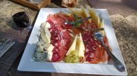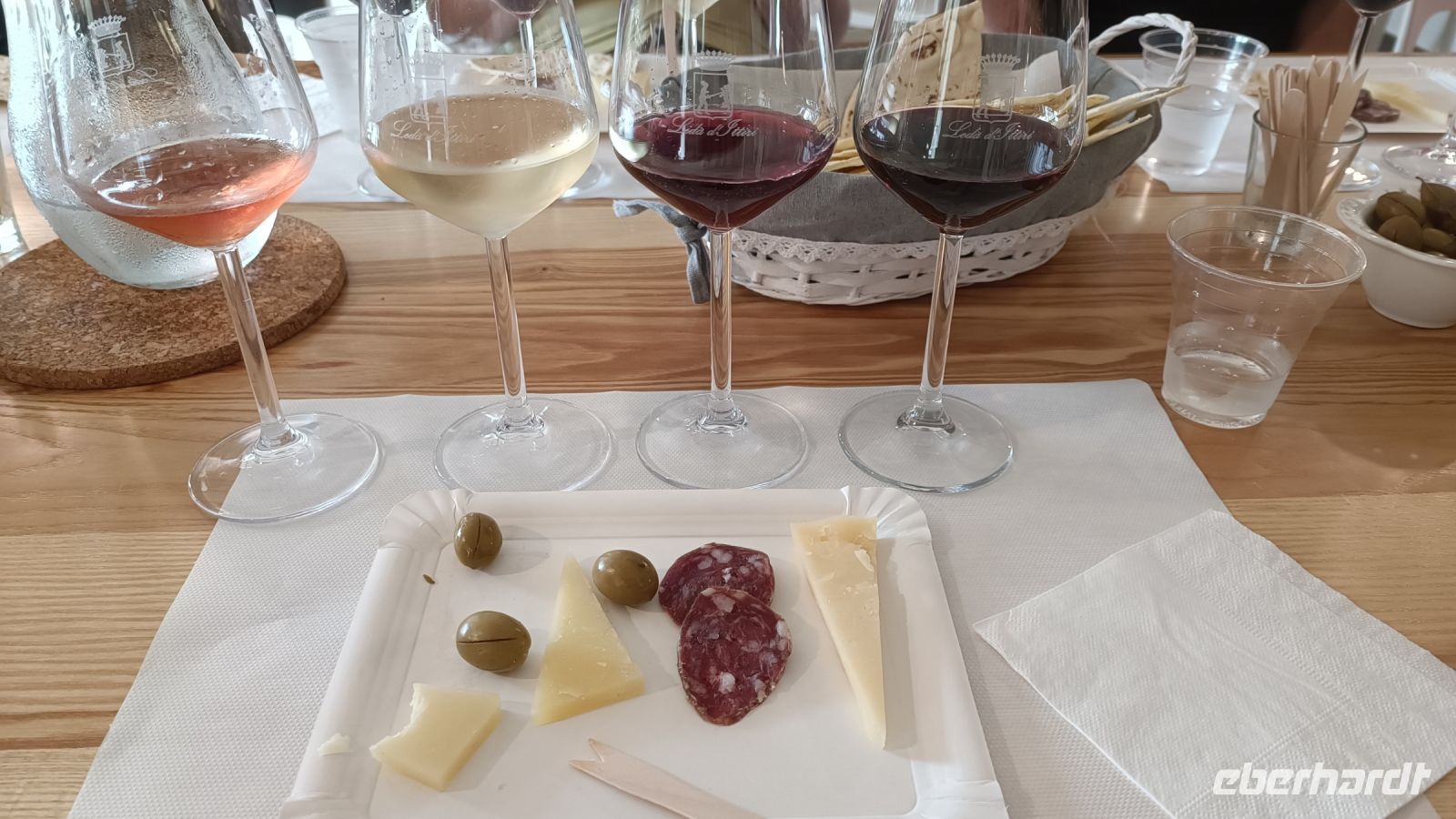 Zu den Weinen wurden der typische „Pecorino Käsu“ und die Salami gereicht. Von links nach rechts in der Reihenfolge zum Wein zu verzehren.