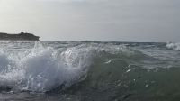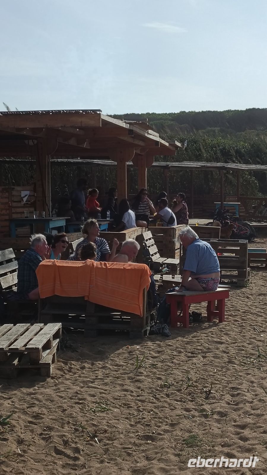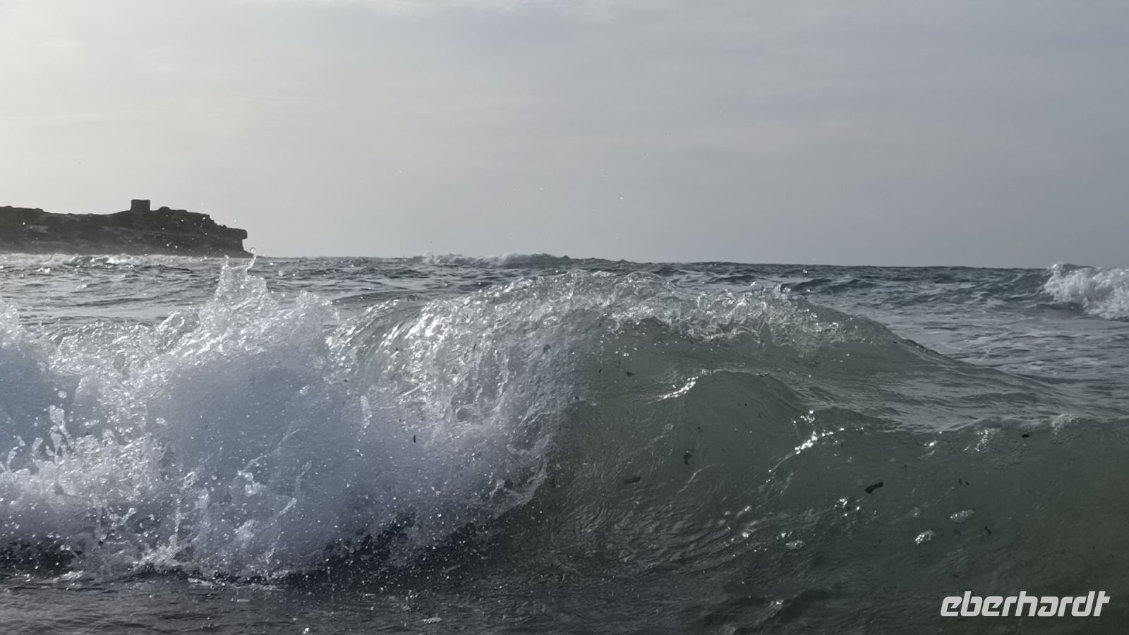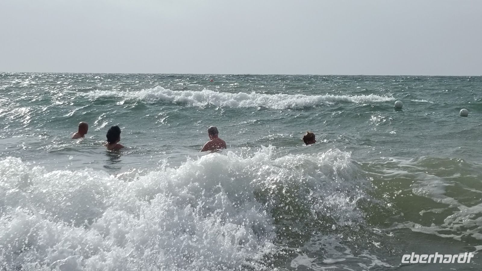 Für Badeenthusiasten hieß das noch in der Dunkelheit ab ins Meer, das heute besonders eindrucksvoll war. Die ganze Nacht über gab es Wind und am Morgen empfing uns das Meer mit schönen Wellen. Ein wunderbares Gefühl von den Wellen geschaukelt zu werden.