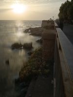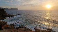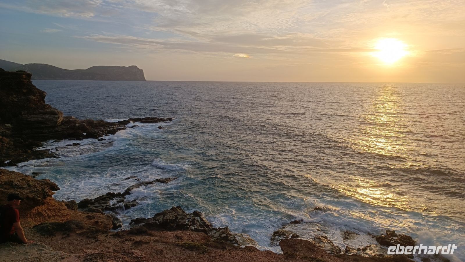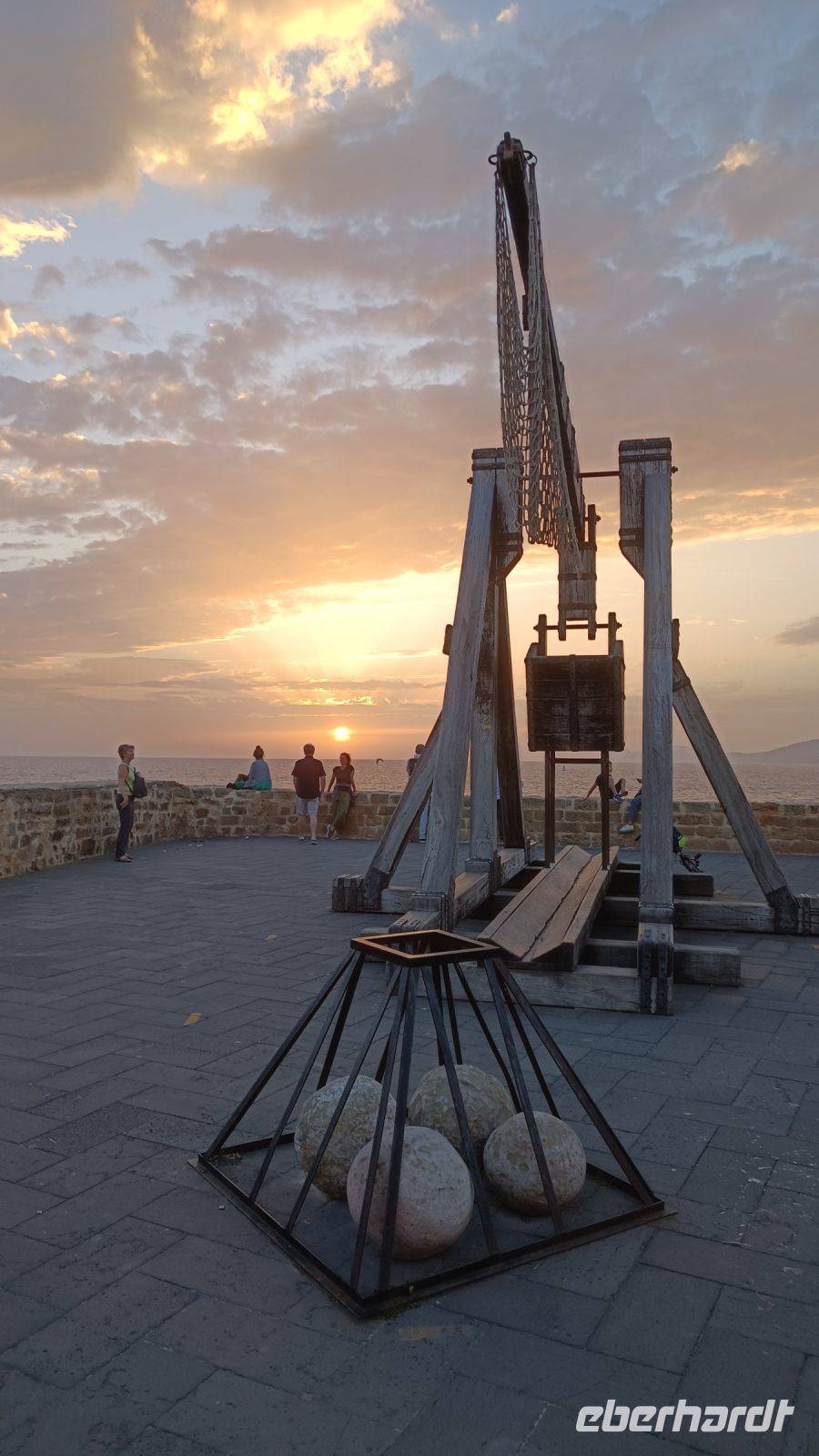 Unser ständiger Begleiter lag schlafend rechts neben uns. Golden beleuchtet war der Kopf des „schlafenden Riesen“ und hoch oben auf dem Capo Caccia leuchtete die weiße Militärstation und der Leuchtturm in der aufgehenden Morgensonne.