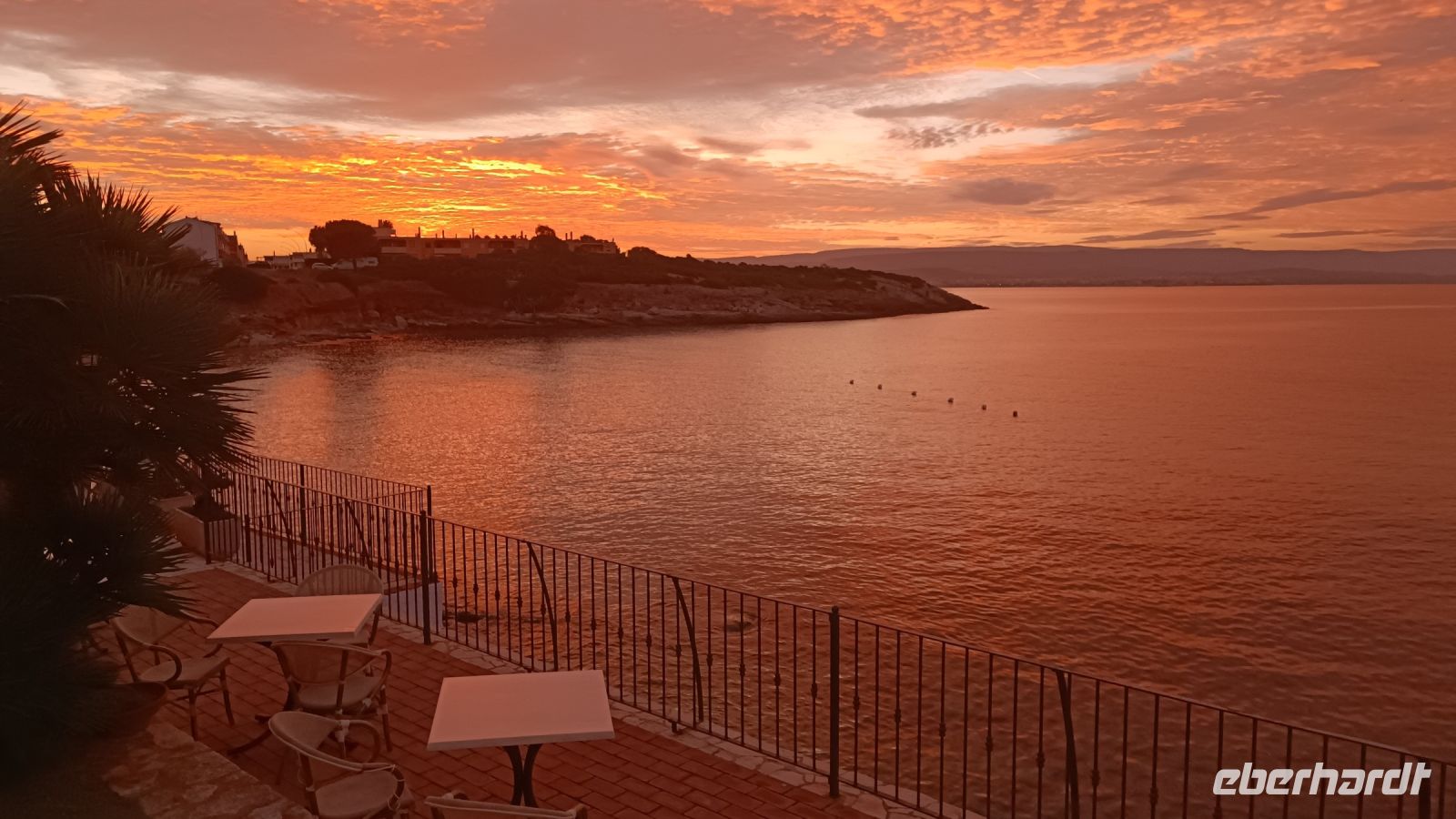 Die aufgehende Sonne hinter Fertilia, vor mir das Hotel noch im Halbschlaf und ich im Wasser liegend und sich friedlich von den Wellen treiben lassen.