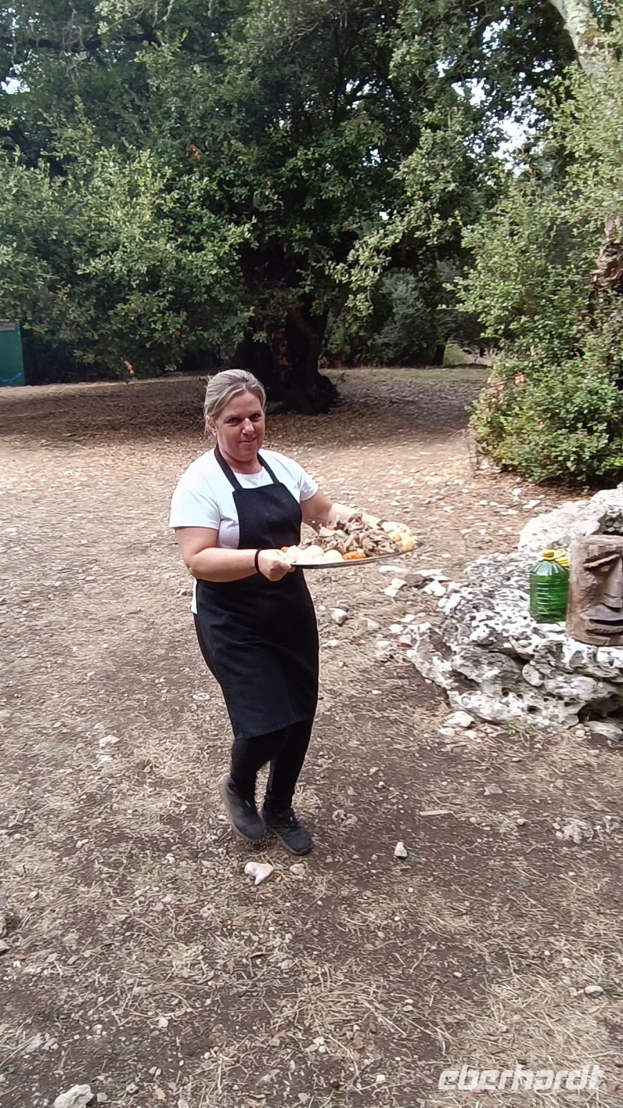 Dort hatte Fiammeta für uns ein Picknick im Freien organisiert. Das Hotel hatte alles vorbereitet. Mitten im Pinienwald, waren die Granittische urig, im einfachen Stil und doch geschmackvoll eingedeckt.