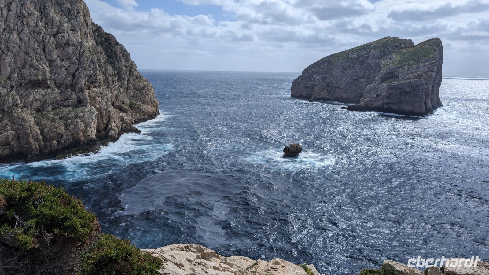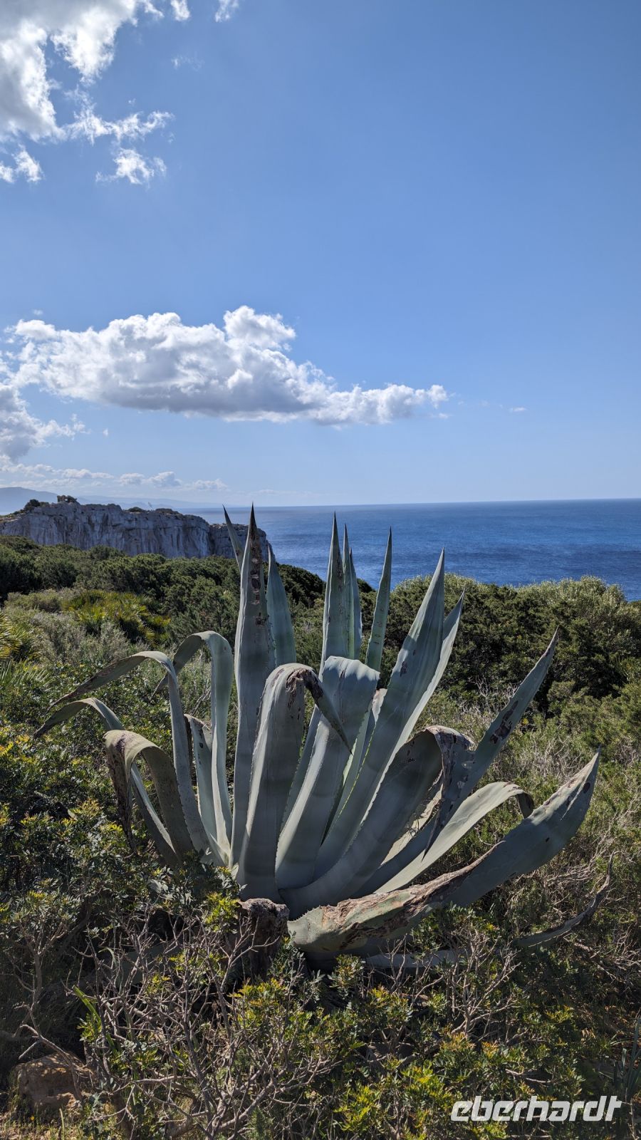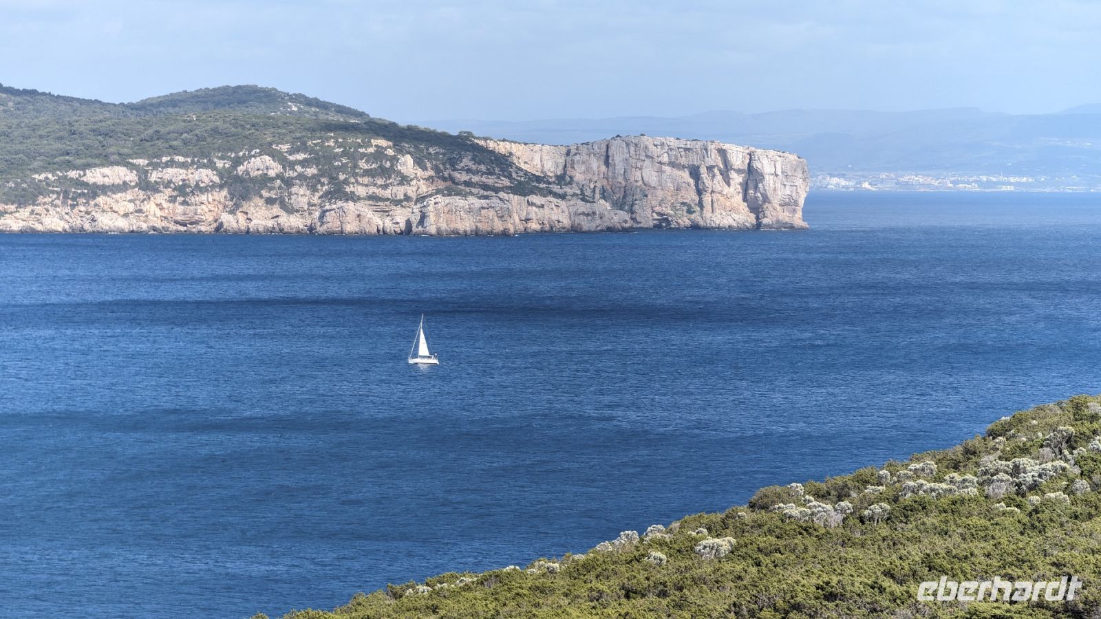 Auf der anderen Seite ging der Blick hinüber zum Punta Giglio, dem Ort der ersten Wanderung und hinein in die Bucht von Porto Conte, einst die berüchtigste Bucht Sardiniens. Unzählige Seeschlachten wurde hier geschlagen. Die Bucht war bekannt unter Seeräubern und Piraten. Handelsschiffe, beladen mit Silbererz aus Argentiera und anderer wertvoller Fracht lichteten hier ihre Anker und fuhren gen Spanien. Ein lohnendes Ziel also für die Freibeuter. Heute sehen nur noch Taucher die Reste der der Schlachten am Meeresgrund.