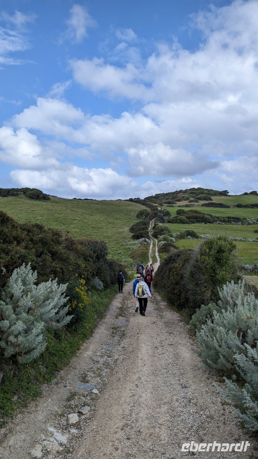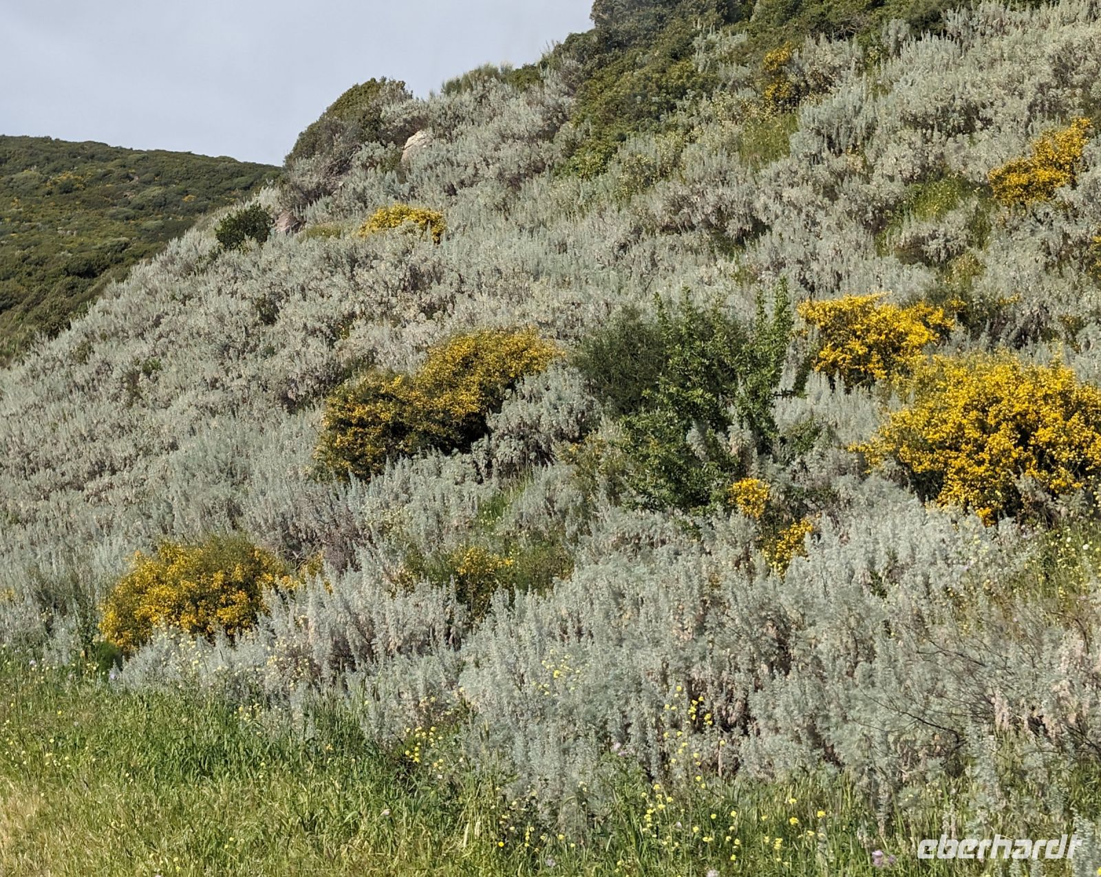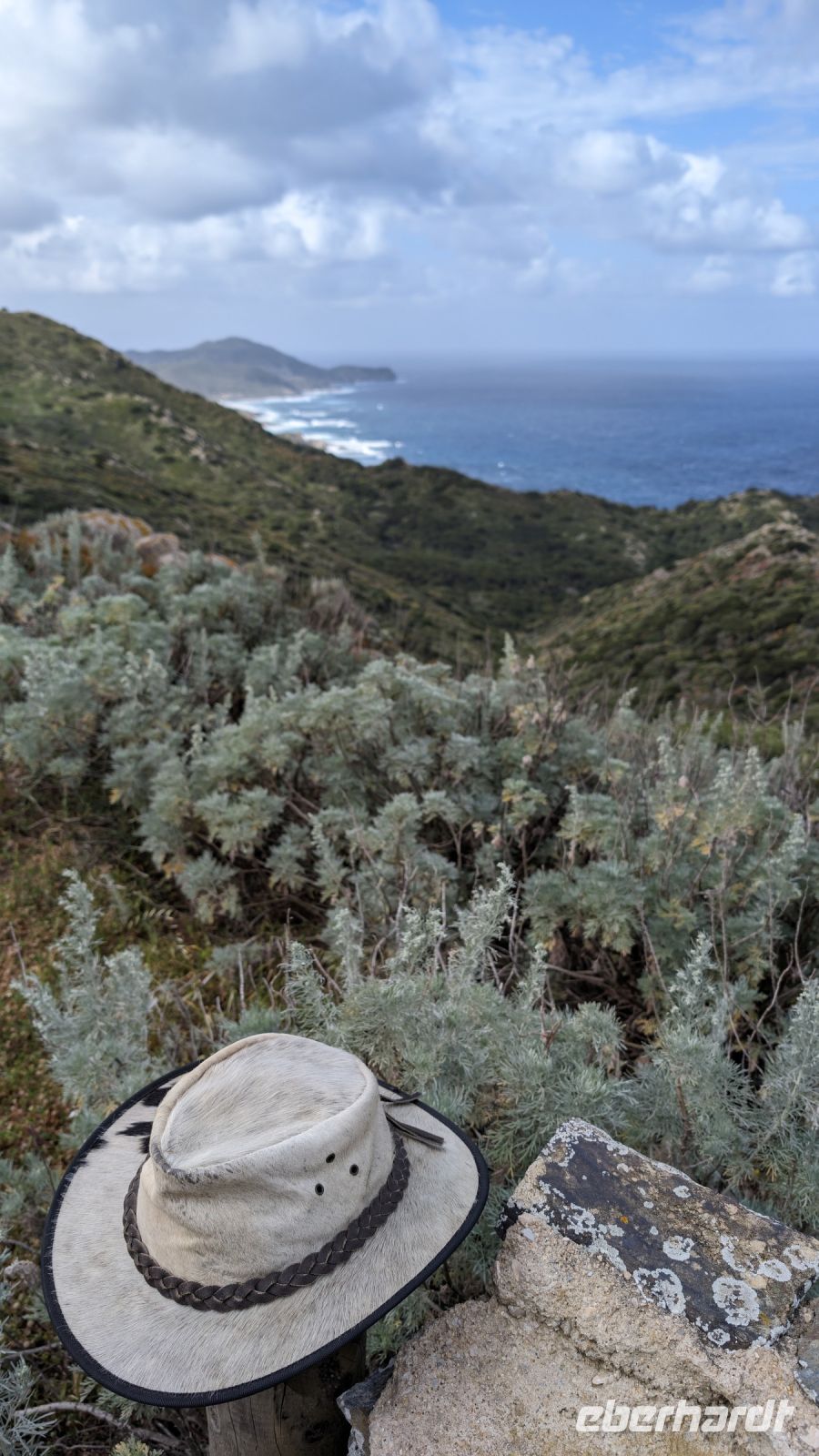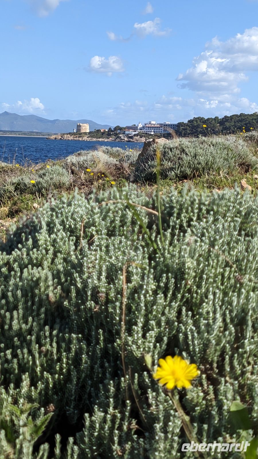 Fiammetta, das kleine Flämmchen, führte uns, nachdem wir unsere Wasservorräte in Fertilia aufgefüllt hatten, zunächst am Wasser entlang vor zum Kap Punta Gilio. Die Frühlingssonne knallte kräftig auf uns nieder und kämen ganz schön ins Schwitzen, wenn da nicht der erfrischende Mistral aus dem Norwesten kommend, uns Abkühlung verschafft hätte.