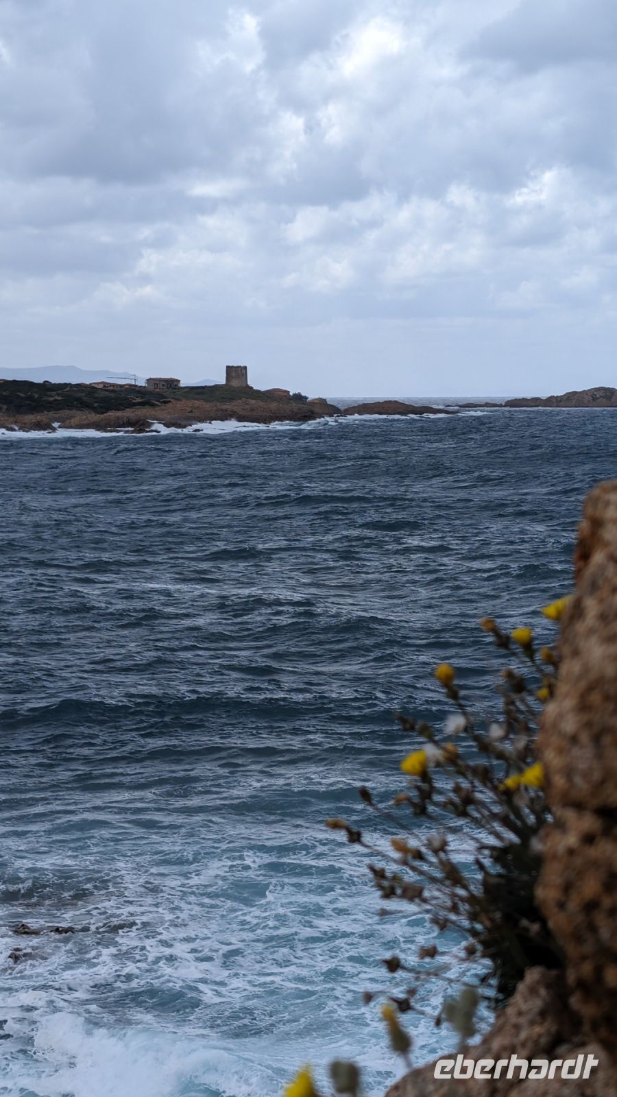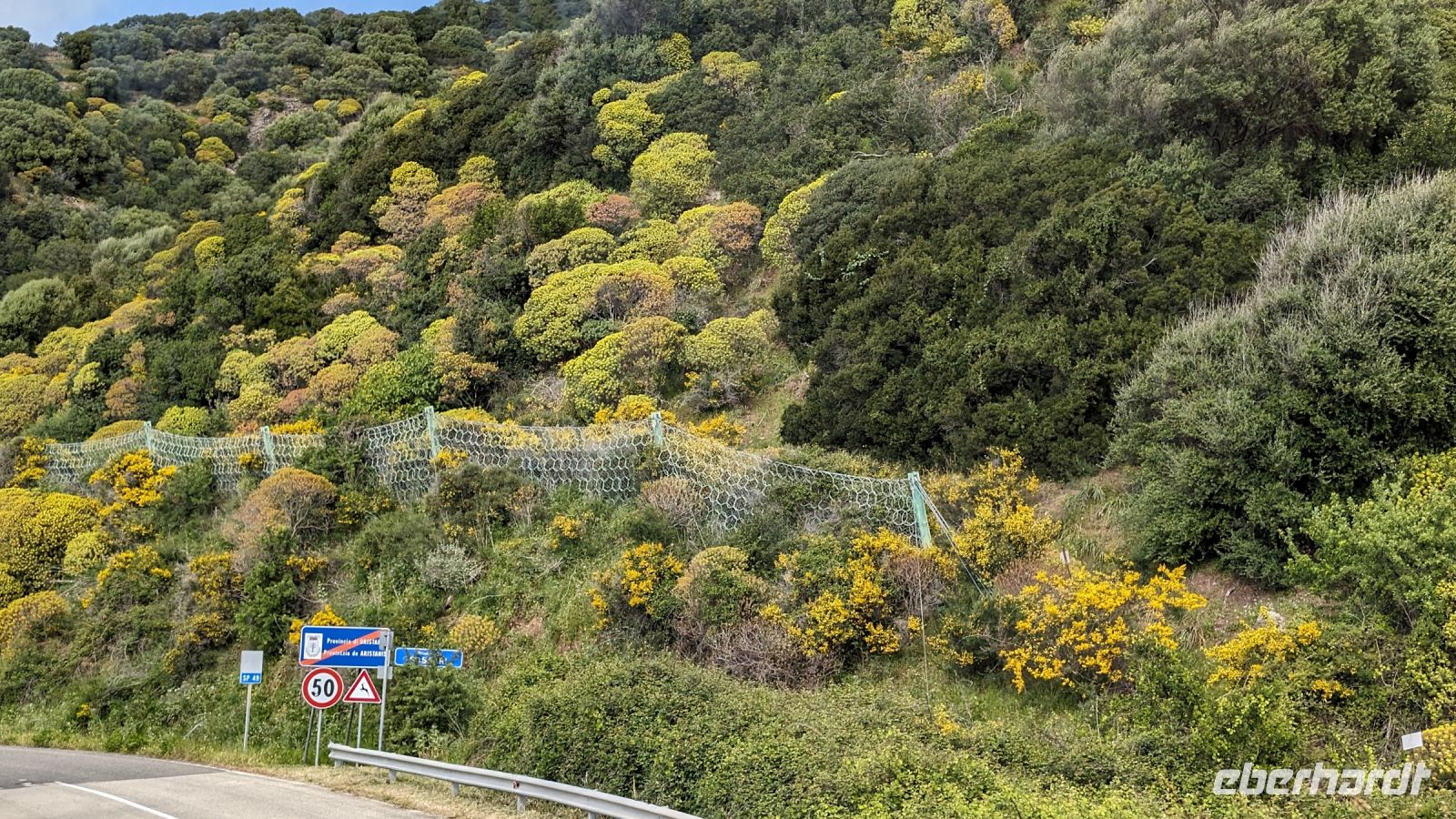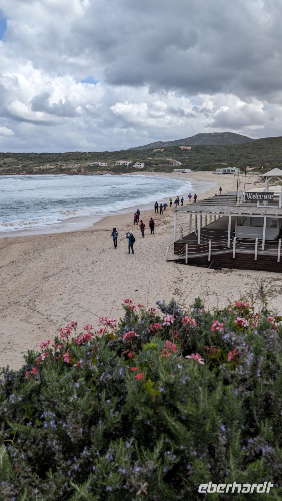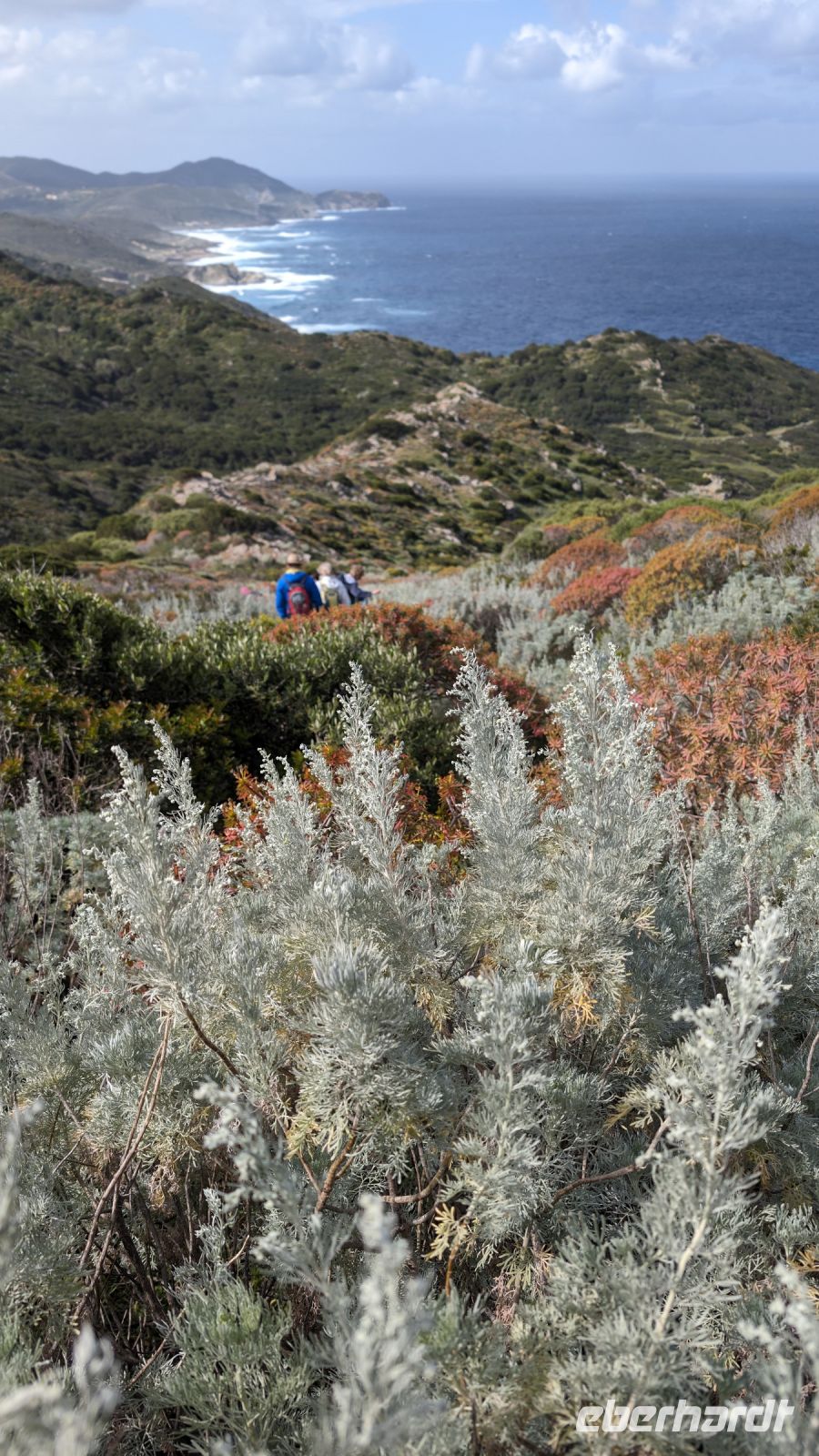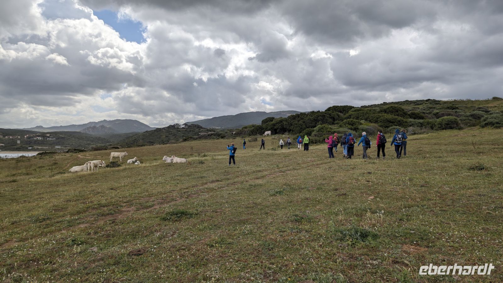 Fiammetta, das kleine Flämmchen, führte uns, nachdem wir unsere Wasservorräte in Fertilia aufgefüllt hatten, zunächst am Wasser entlang vor zum Kap Punta Gilio. Die Frühlingssonne knallte kräftig auf uns nieder und kämen ganz schön ins Schwitzen, wenn da nicht der erfrischende Mistral aus dem Norwesten kommend, uns Abkühlung verschafft hätte.
