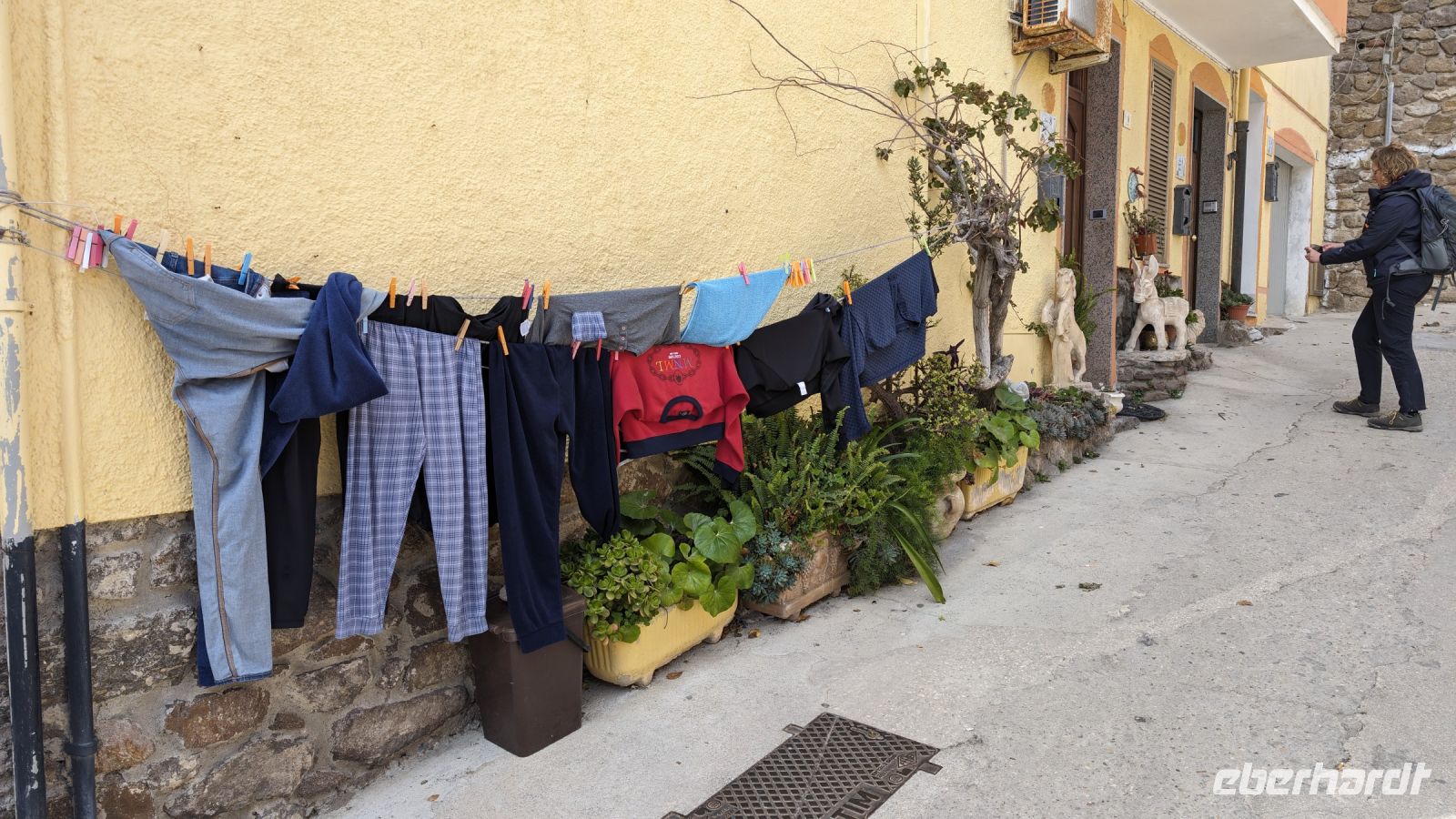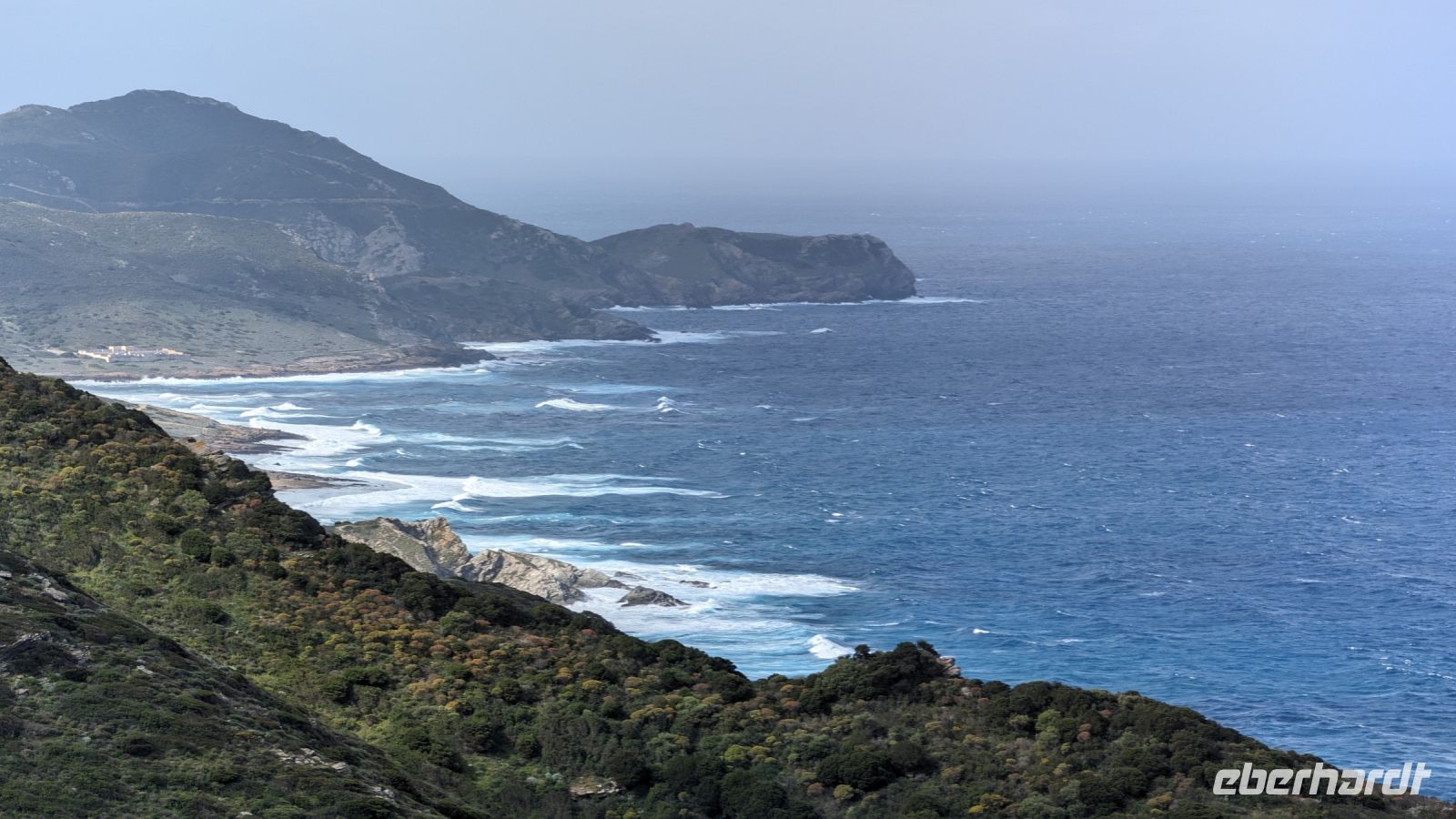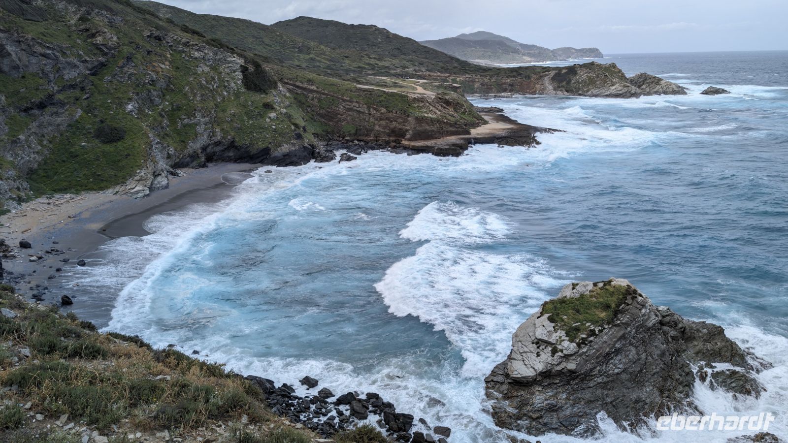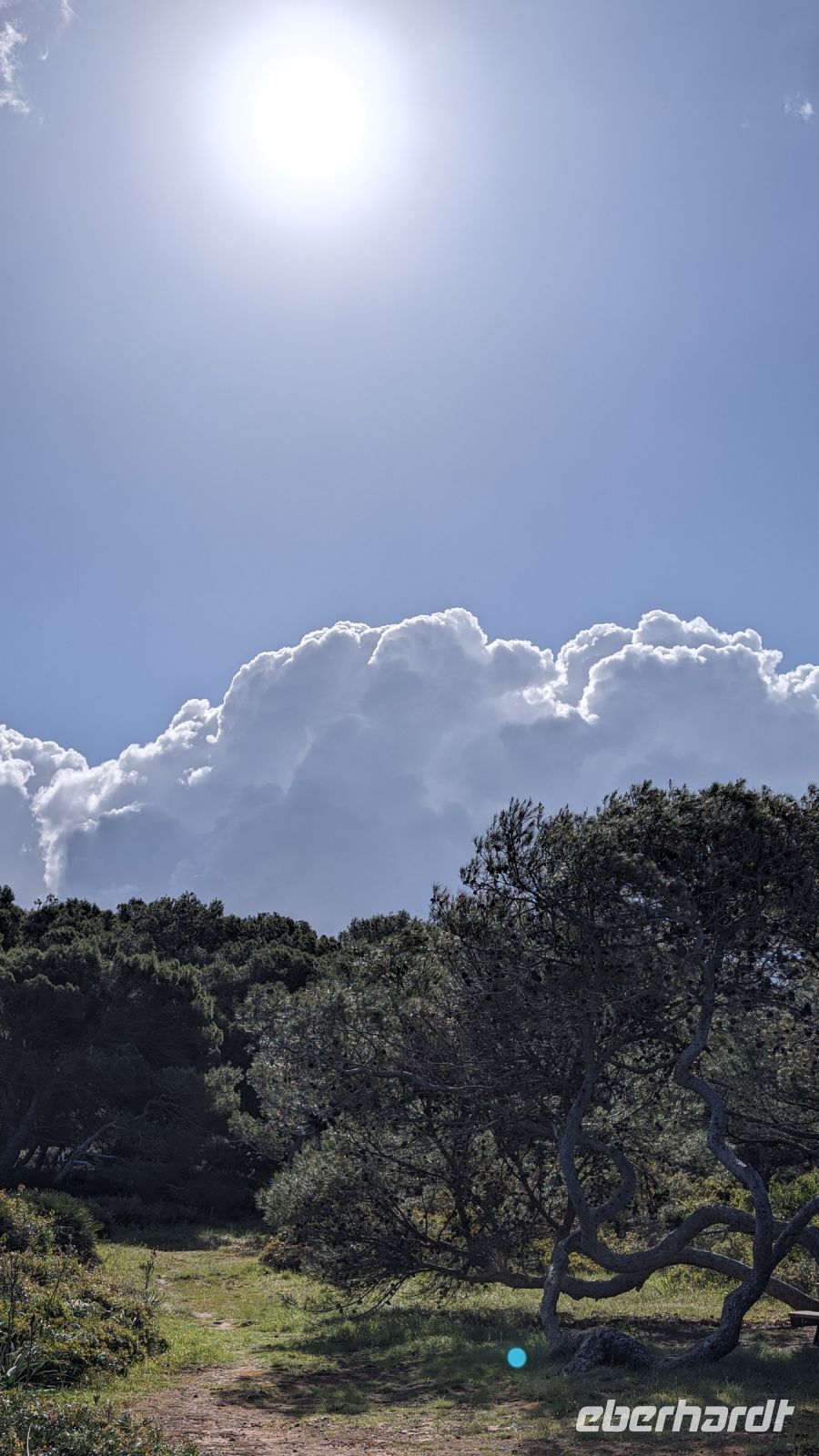 Fiammetta, das kleine Flämmchen, führte uns, nachdem wir unsere Wasservorräte in Fertilia aufgefüllt hatten, zunächst am Wasser entlang vor zum Kap Punta Gilio. Die Frühlingssonne knallte kräftig auf uns nieder und kämen ganz schön ins Schwitzen, wenn da nicht der erfrischende Mistral aus dem Norwesten kommend, uns Abkühlung verschafft hätte.