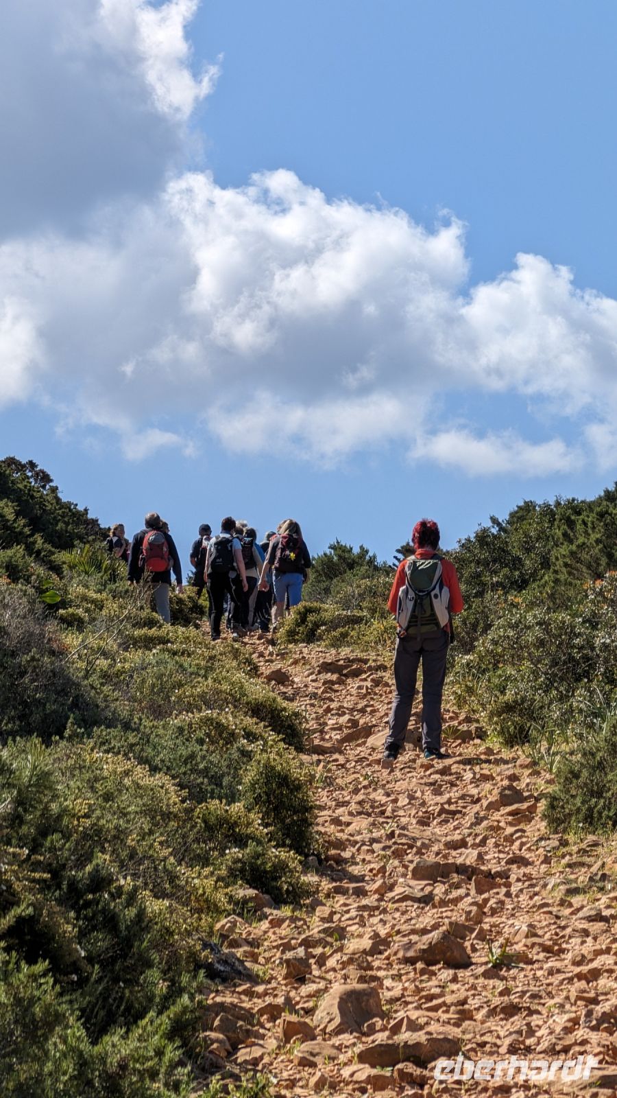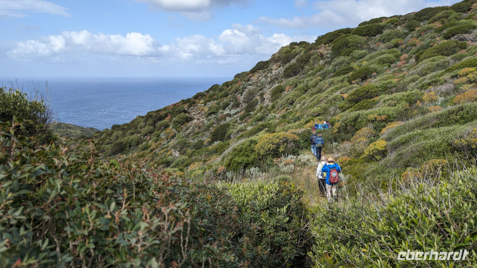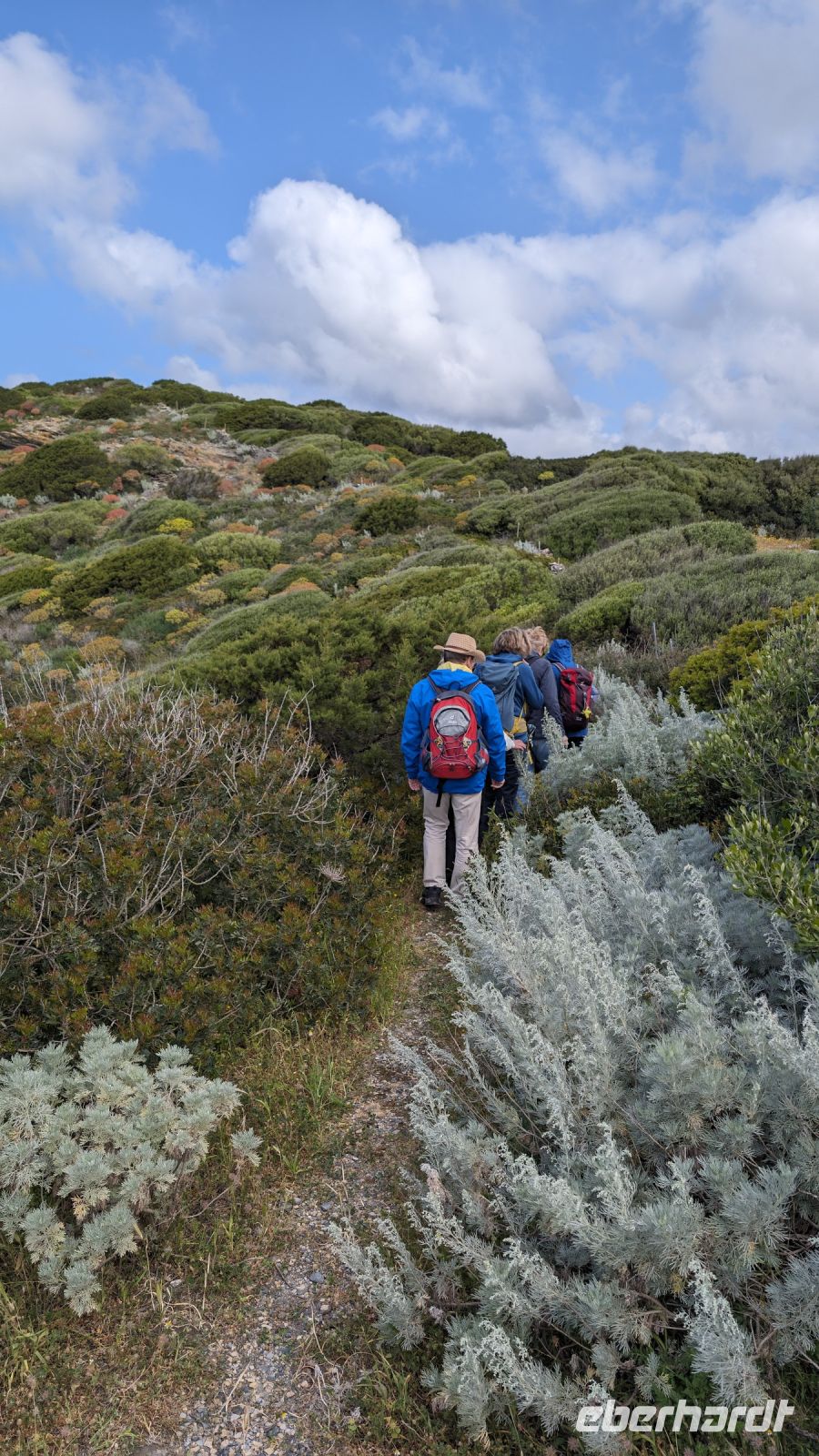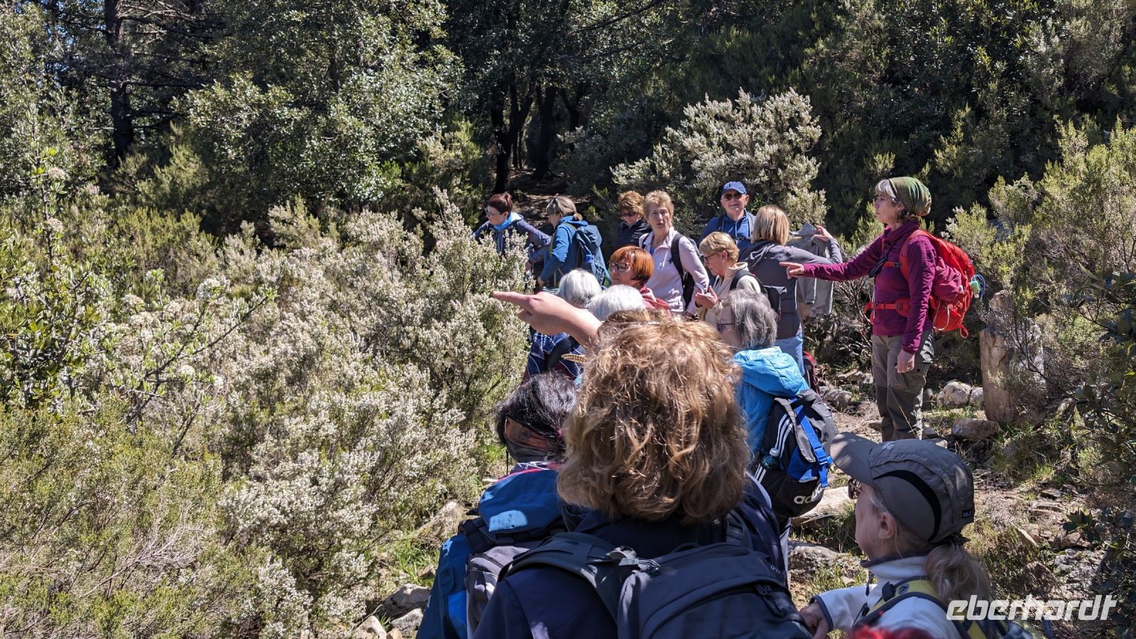 Jetzt wurde der Weg etwas anspruchsvoller. Ein bißchen kraxeln in den Felsen, durch meterhohes Macchiadickicht streifen, schmale Pfade und teils unwegsames Gelände. Die Wanderer nahmens gelassen, wenn man auch so manchen Kratzer durch die Dornen abbekam. Den Humor und die Freude an der Wanderung verlor man deshalb nicht.