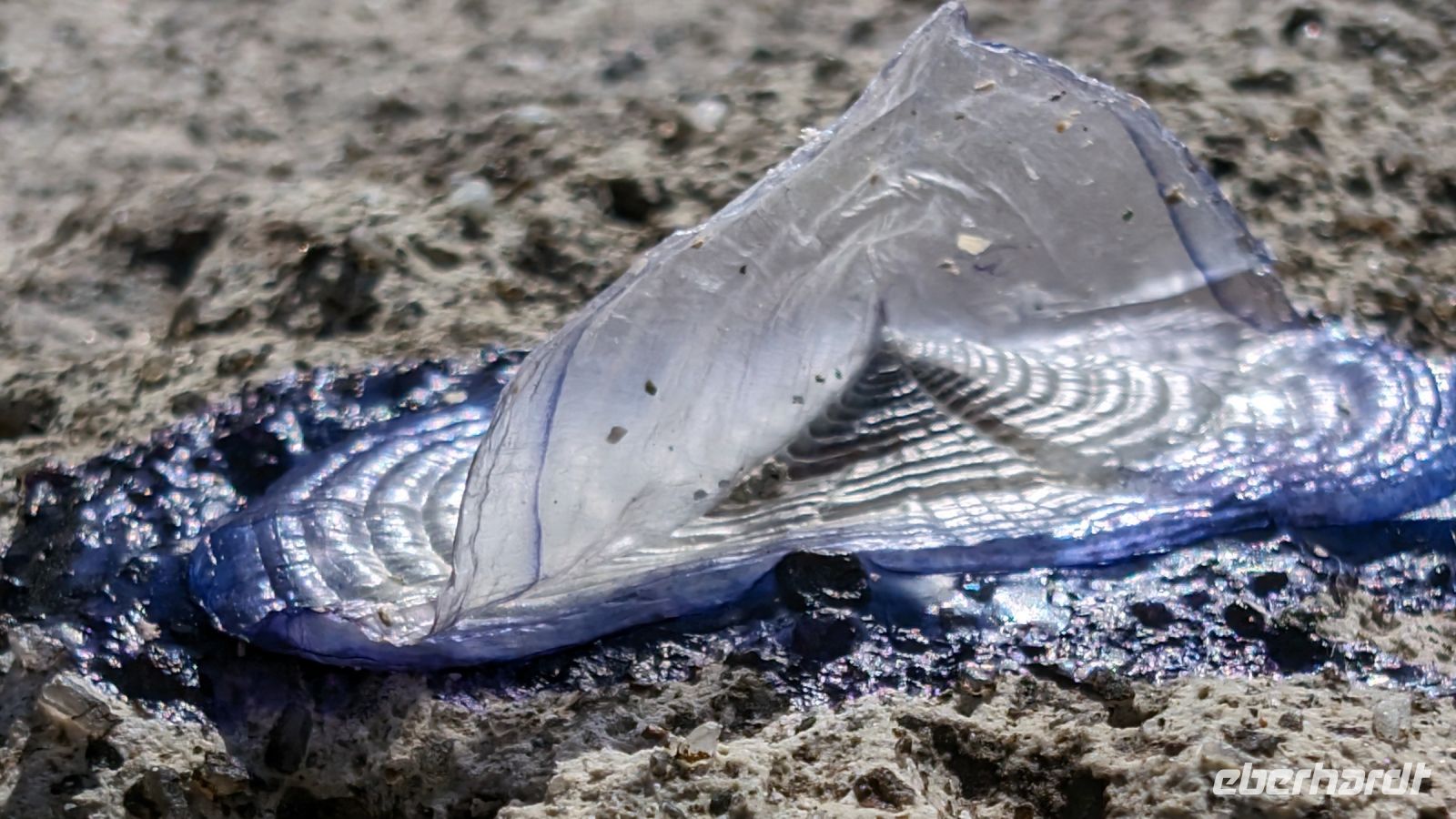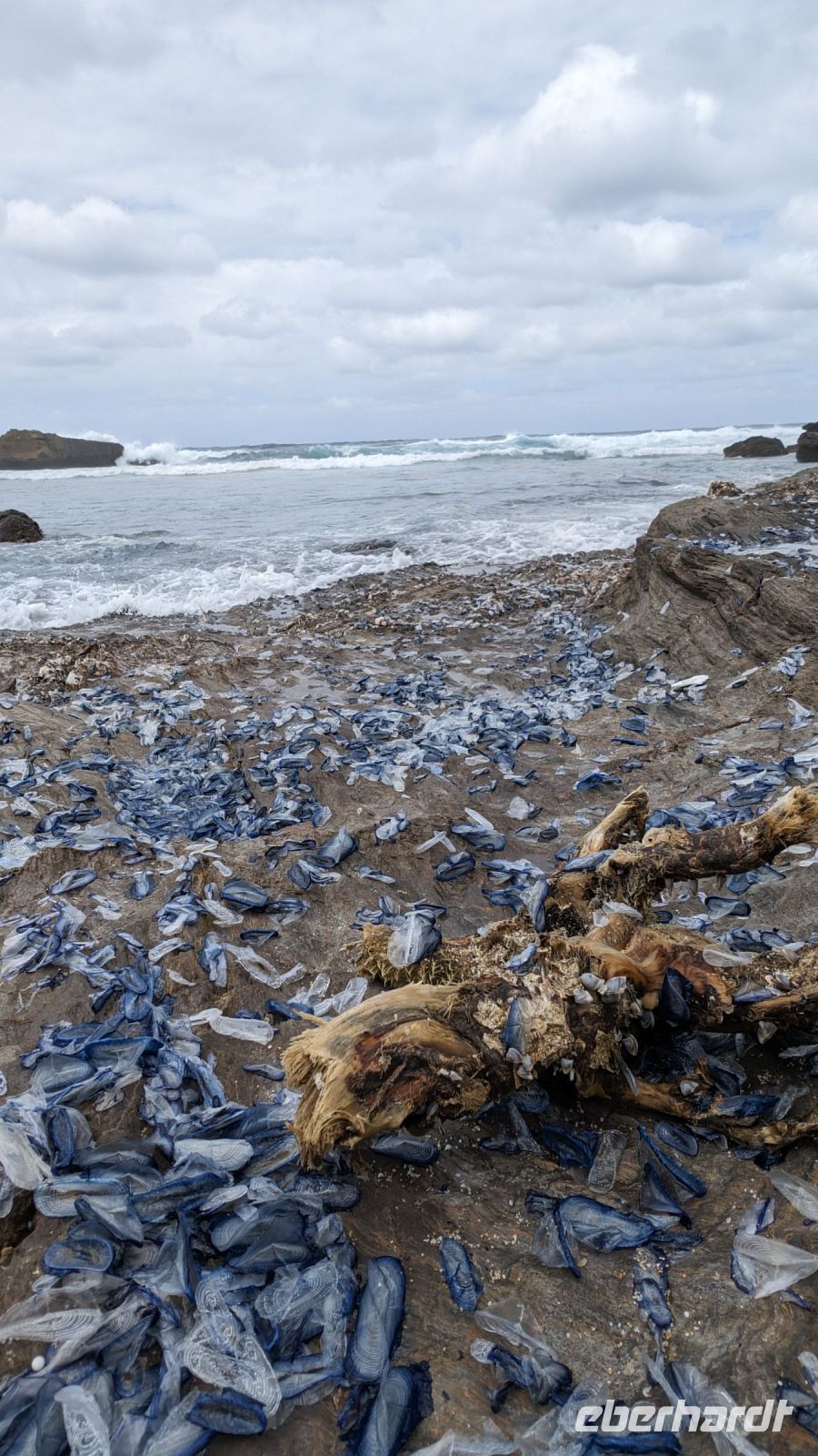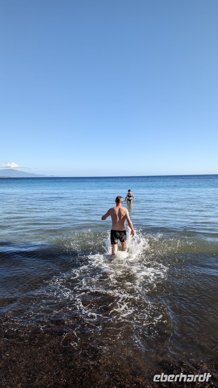 Allein das Hineinkommen ins Wasser war ein besonderes Erlebnis. Auf dem sonst feinen Sandstrand von Fertilia türmten sich riesige Berge von Algen auf. Barfuß über den weichen Teppich aus hunderten von Tonnen Seegras, das über den Winter hier an Land gespült wurde. In den nächsten Wochen soll es von hier abtransportiert werden. Man erinnerte sich an das Frühjahr 2023, wo 4 Mann mit der Mistgabel das Seegras mühsam auf einen Anhänger aufluden mussten. Vielleicht kommt dieses Jahr ein Radlader zur Unterstützung.