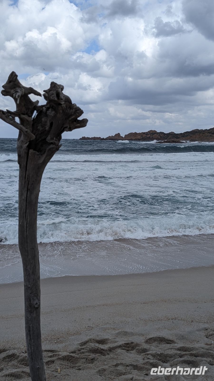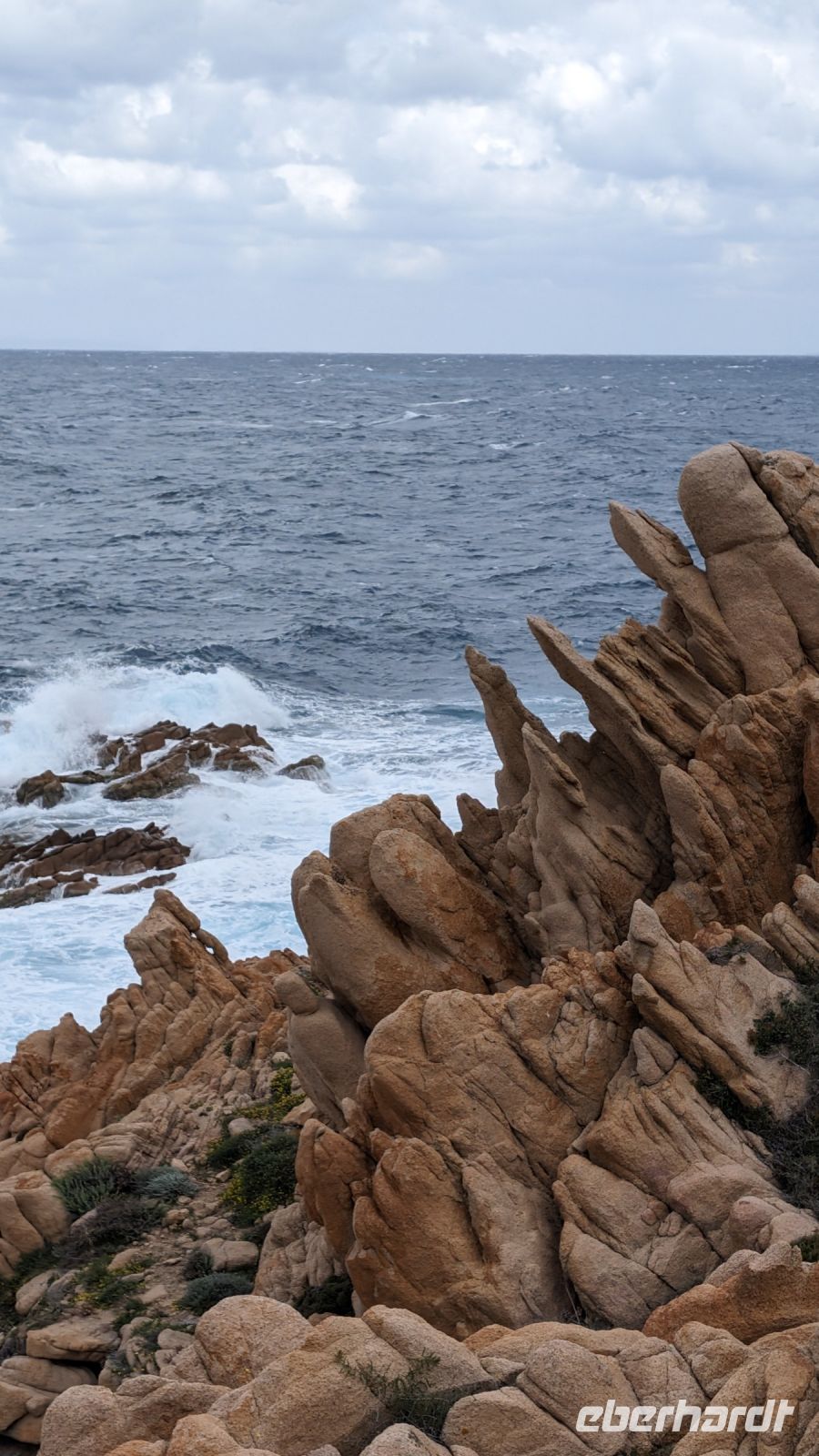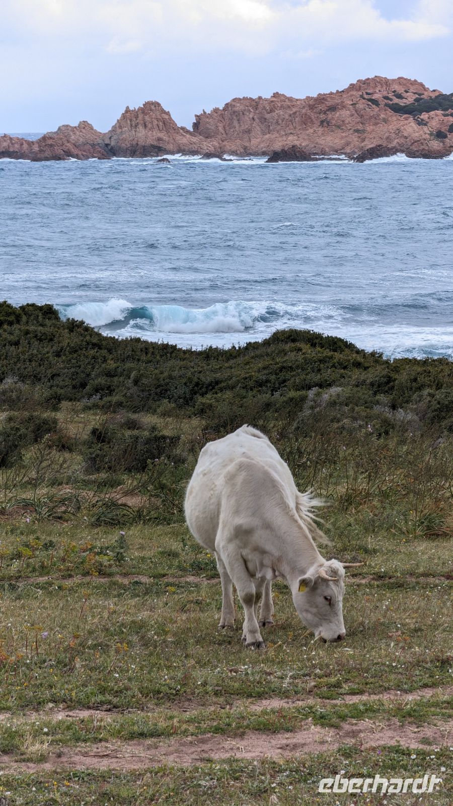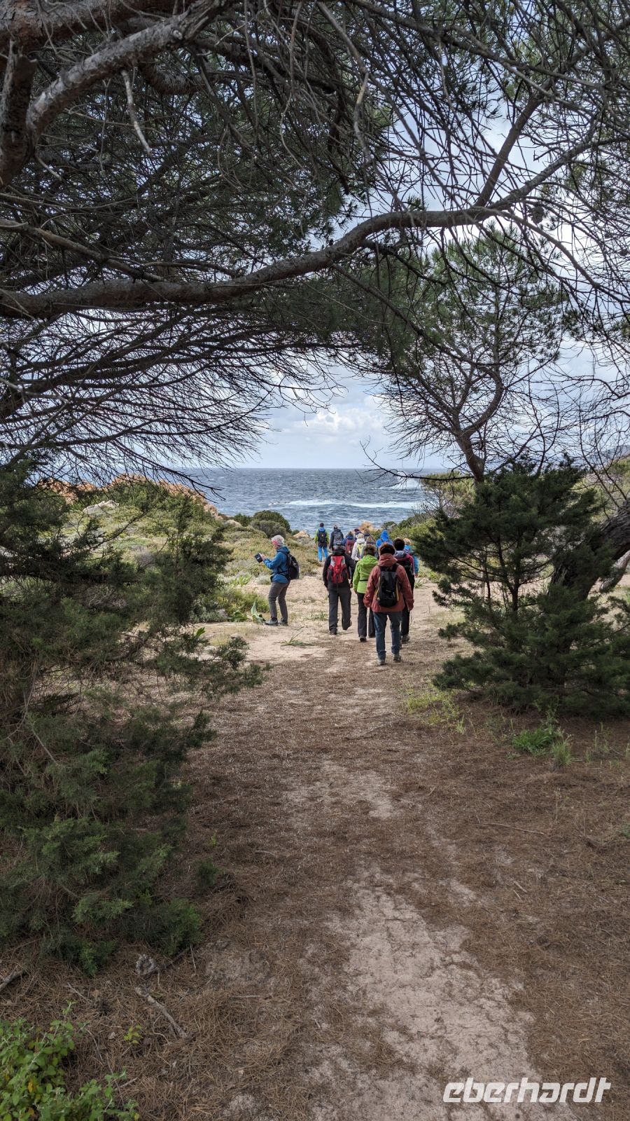 Die Wanderung begann zunächst harmlos über eine Viehweide hinunter zum Strand, am Meer entlang, etwas bergauf und hinein in einen mächtigen Pinienwald. Dahinter das tosende Meer und der Strand von Calarossa. Fotografen warteten darauf, dass sich die perfekte Welle an den roten Granitfelsen mit ihren bizarren Formen brach. Leider geschah dies meistens dann, wenn man gerade abgelenkt war, oder sich die Kamera am Handy ausgeschaltet hatte. Naja, musste man die Szenen eben im Kopf abspeichern.