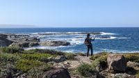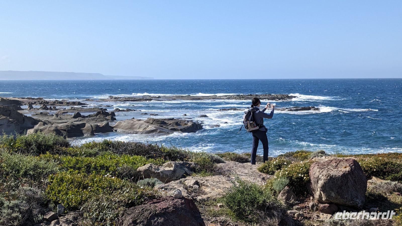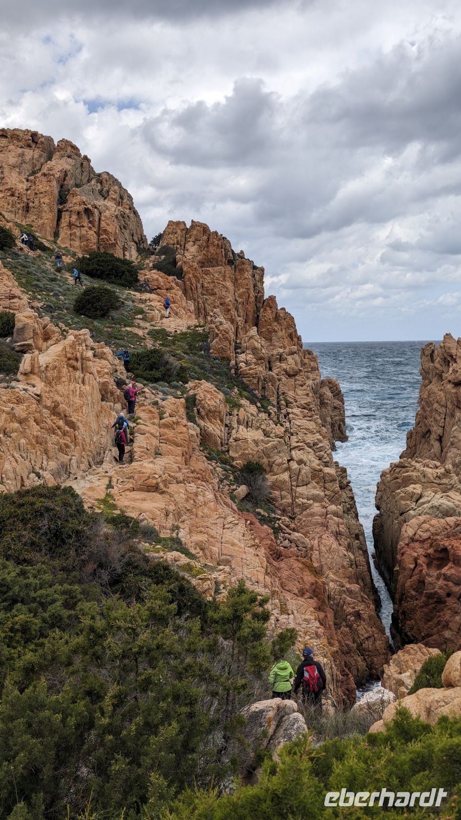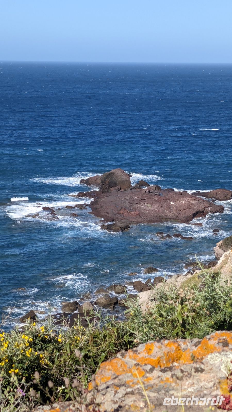 Die Wanderung begann zunächst harmlos über eine Viehweide hinunter zum Strand, am Meer entlang, etwas bergauf und hinein in einen mächtigen Pinienwald. Dahinter das tosende Meer und der Strand von Calarossa. Fotografen warteten darauf, dass sich die perfekte Welle an den roten Granitfelsen mit ihren bizarren Formen brach. Leider geschah dies meistens dann, wenn man gerade abgelenkt war, oder sich die Kamera am Handy ausgeschaltet hatte. Naja, musste man die Szenen eben im Kopf abspeichern.