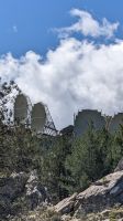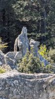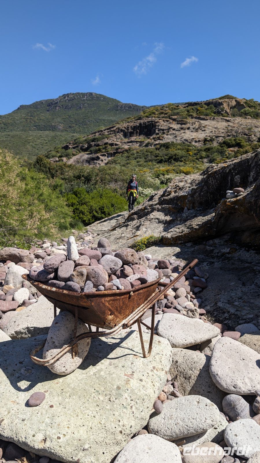 Zwischen Ittiri und Thiesi liegt das ländlich geprägte und bergige Gebiet mit ausgedehnten Wäldern und ruhenden Vulkanen, weit weg vom Meer. Die Ruine einer einsamen Nuraghe grüßte uns vom Berggipfel dann kam die Baustelle mit Teerarbeiten. Gut, dass sie einspurig von beiden Seiten befahrbar war, so konnten wir bis an unsere Ausstiegstelle vorfahren. Und wenn wir 3 Stunden später wieder abgeholt werden, ist die Straße bereits geteert.